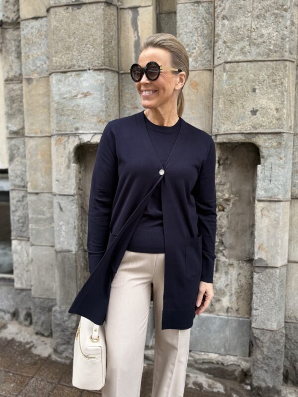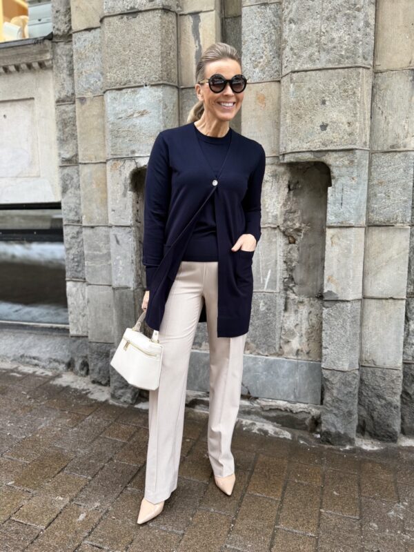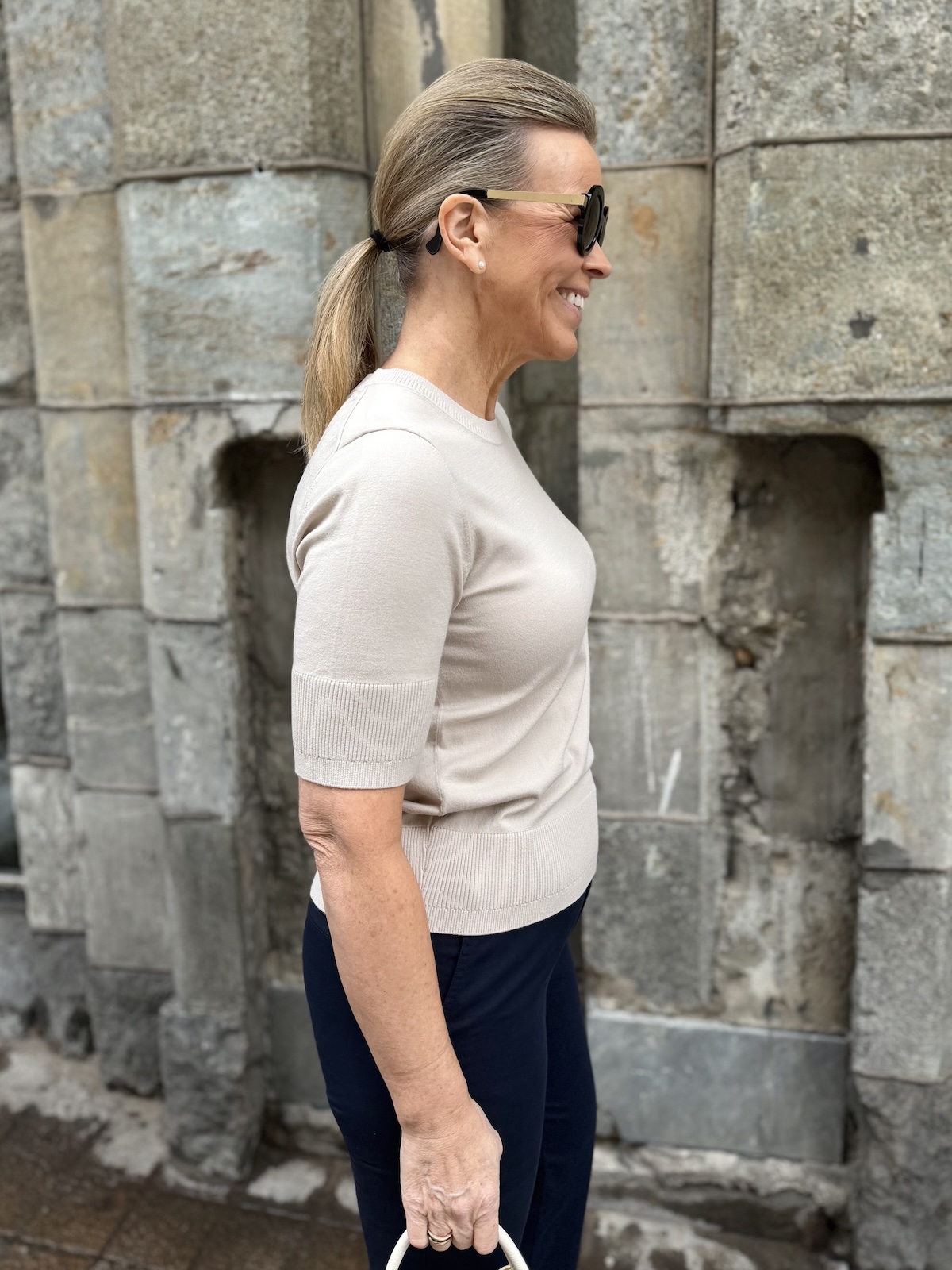 Miko lyhythihainen neule on pehmoinen, jousta ja ohuehko neule. Neuleessa on O-kaula-aukko. Hihat ovat hieman pidemmät, ne ylettyvät kyynerpäiden yläpuolelle. Malliltaan neule on suora ja sen helmassa on joustava resori. Neule ylettyy lantiolle. Katalla on neuleesta päällä koko S. Neule vastaa normaalia kokoa.