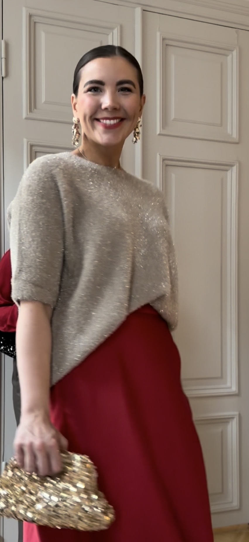 Odalys on kaunis neule, jossa on upea kullan beige sävy. Neuleessa on O-kaula-aukko ja hihat jotka tulevat kyynerpäiden kohdalle. Malliltaan neule on suora ja se ylettyy lantiolle. Gabilla on neuleesta päällä koko M. Neule on reilua kokoa eli otathan neuleesta ainakin yhden koon pienemmän kuin normaalisti käytät.