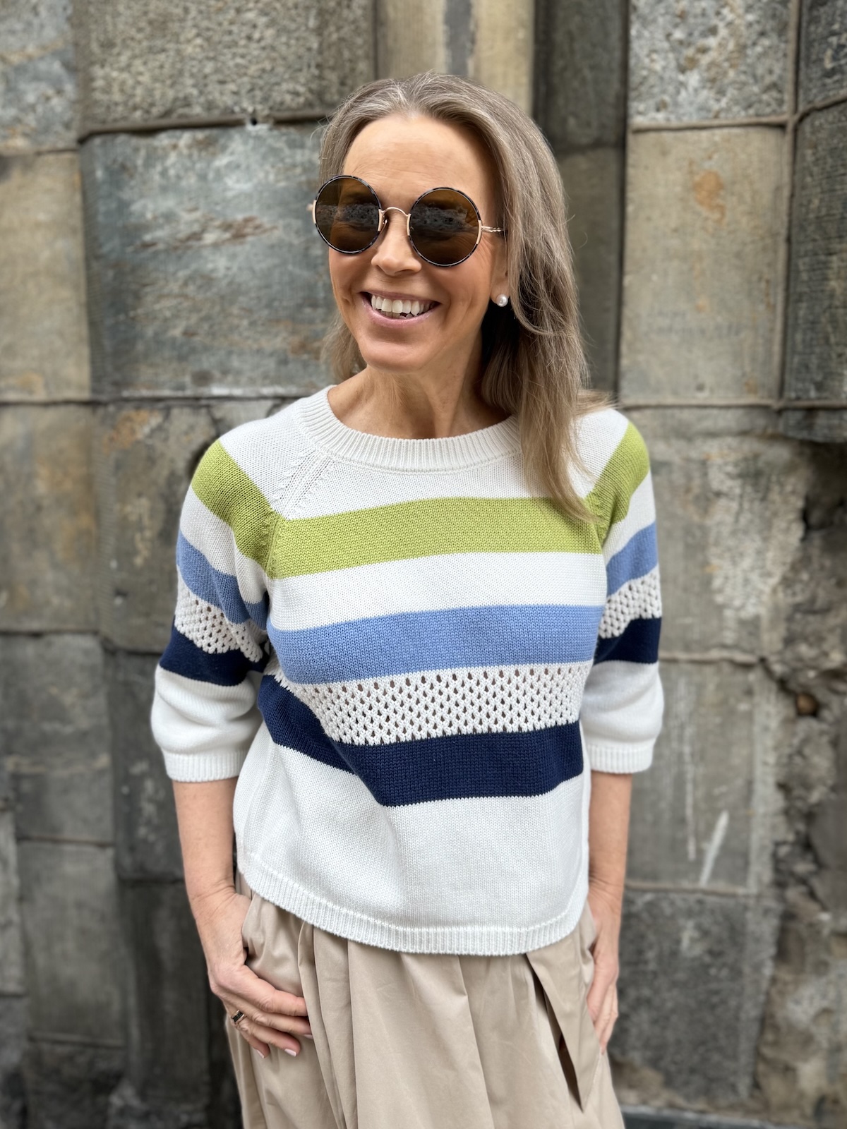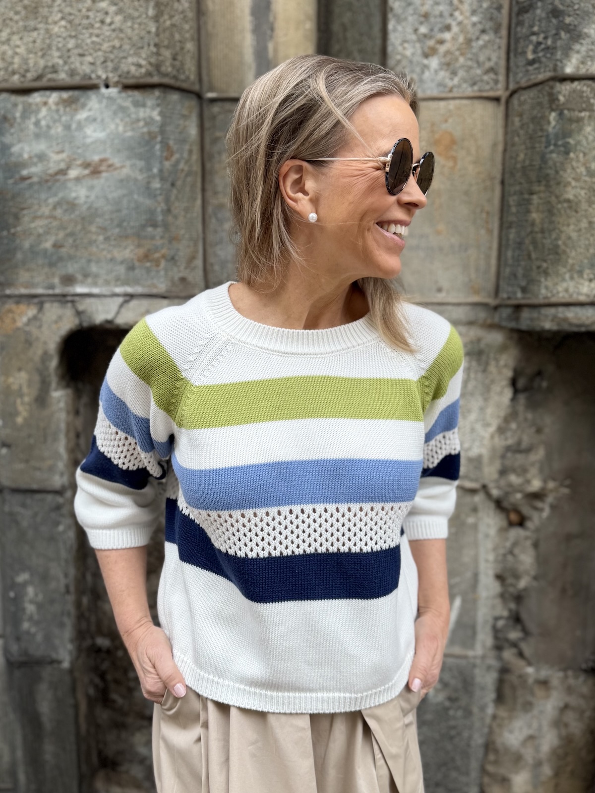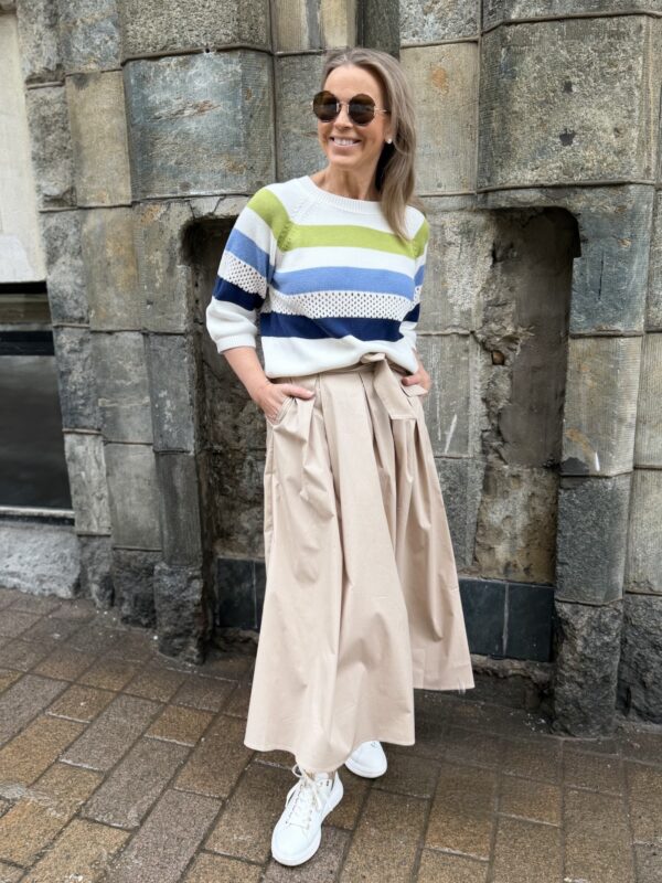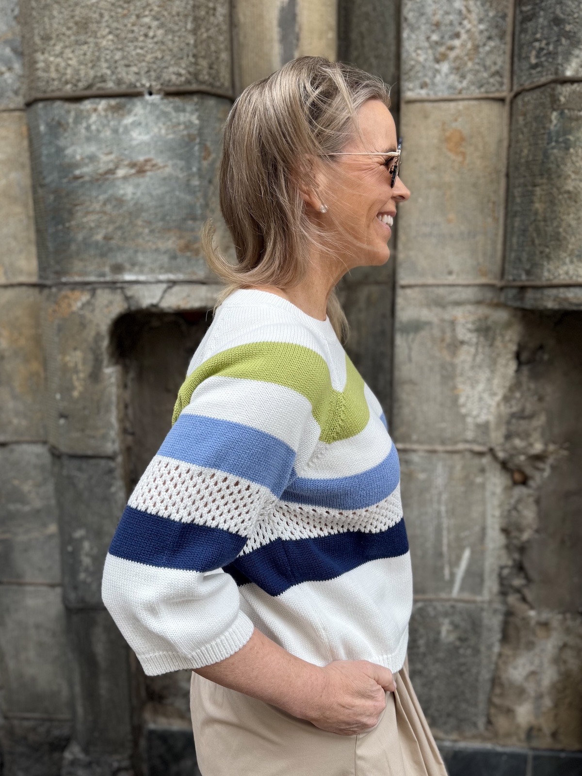 Rina on raikas neule. Malliltaan neule on suora, laatikkomainen. Neuleessa on O-kaula-aukko ja vajaamittaiset hihat. Vaaleansinisen raidan alla on reikäneulosta. Katalla on neuleesta päällä koko 36.