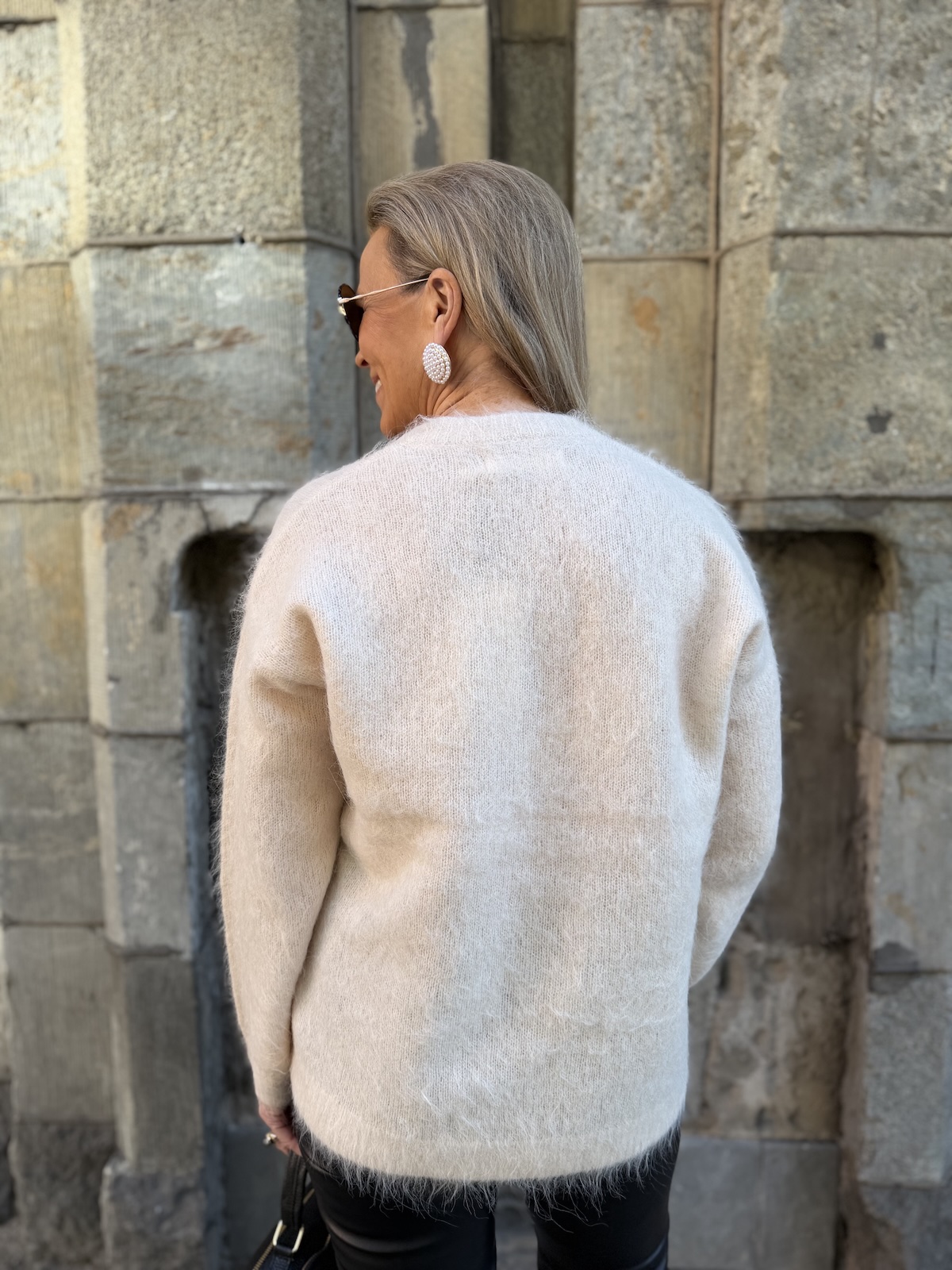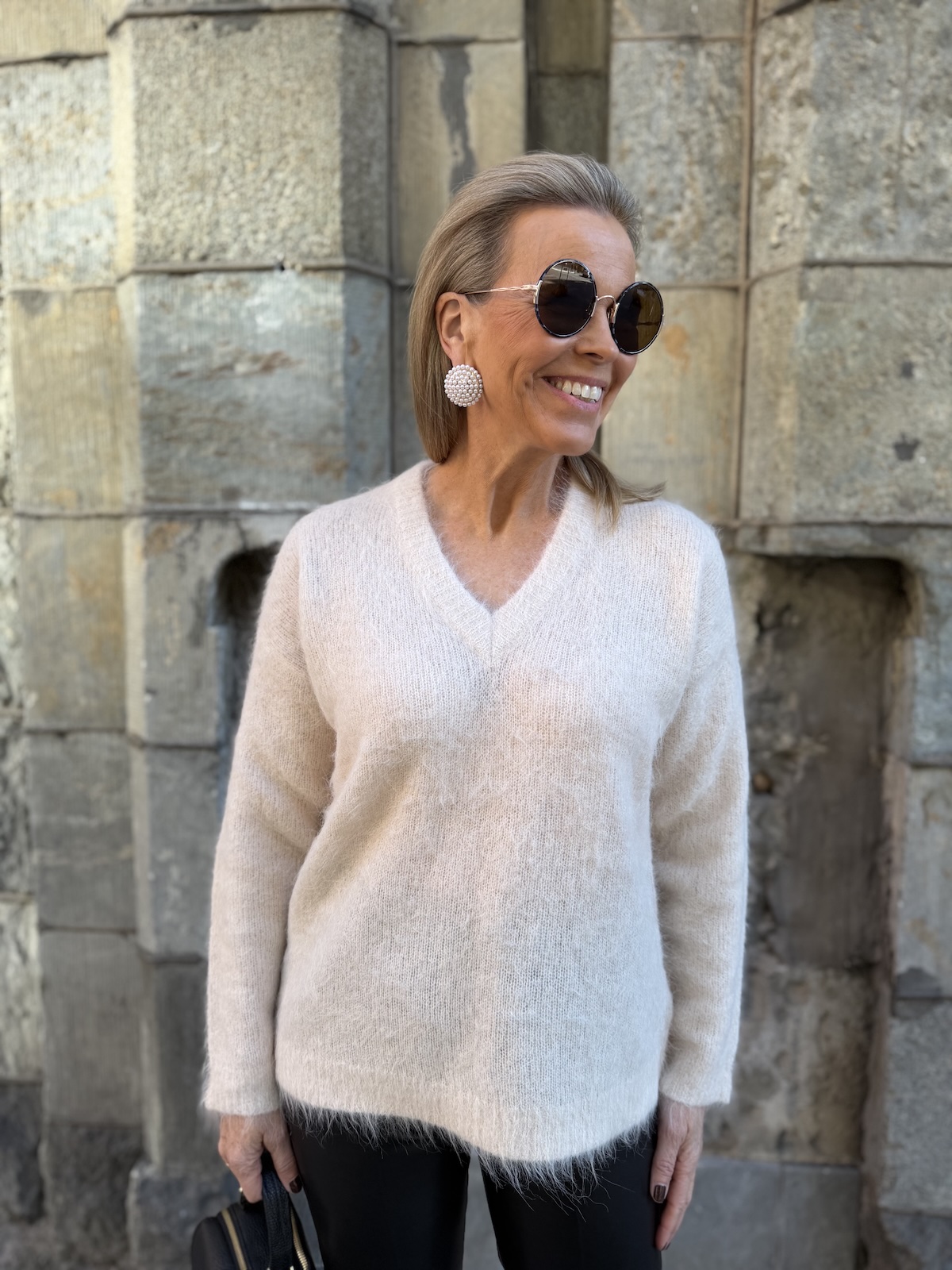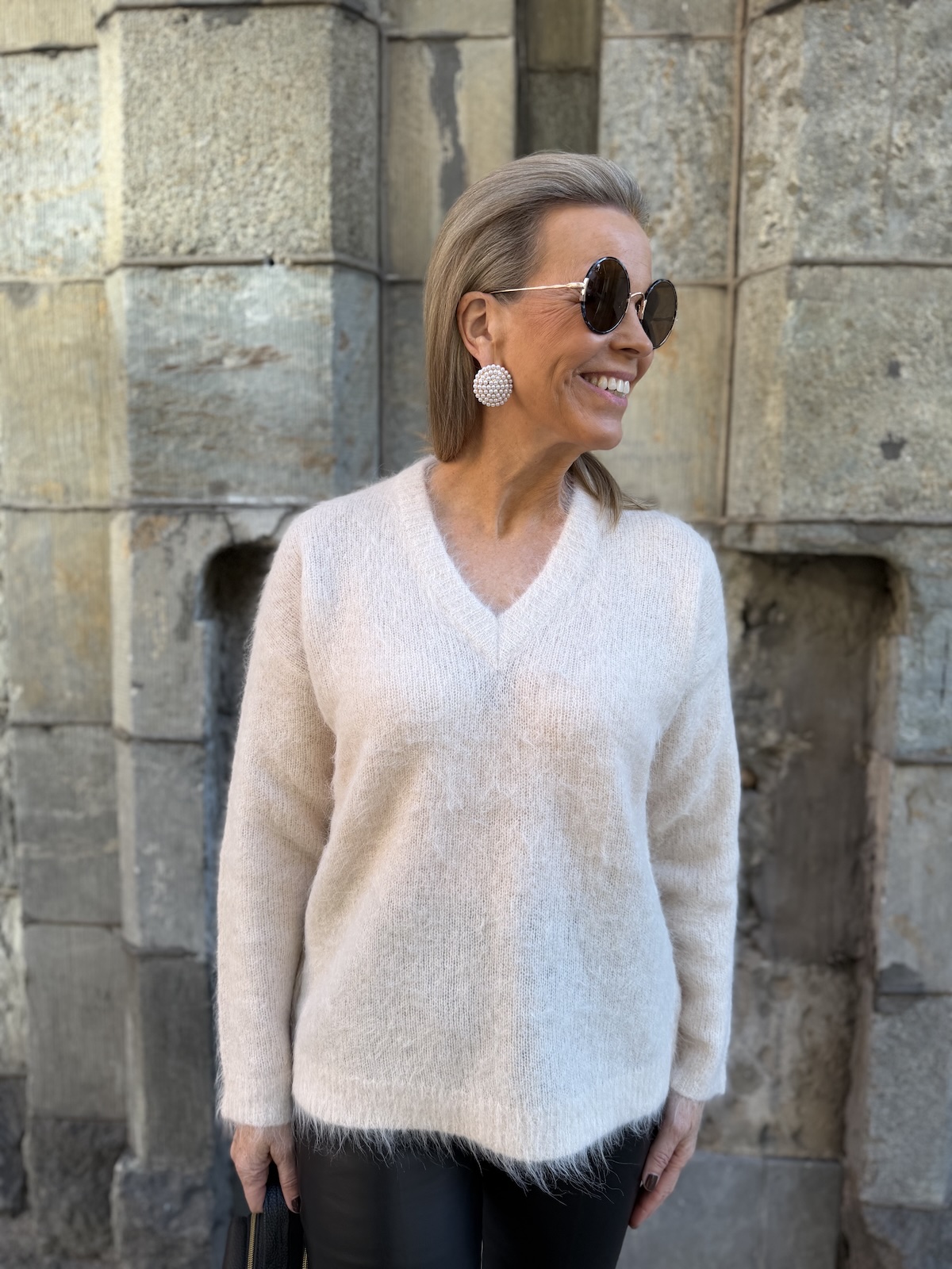 Tello on kaunis ja tyylikäs pörröinen neule. Neuleessa on V-kaula-aukko, joka ei ole liian syvä eli neuleen alle ei tarvitse pukea mitään. Neuleen hihat ovat täyspitkät ja malliltaan neule on suora. Neule ylettyy haarasauman kohdalle. Katalla on neuleesta päällä koko XS.