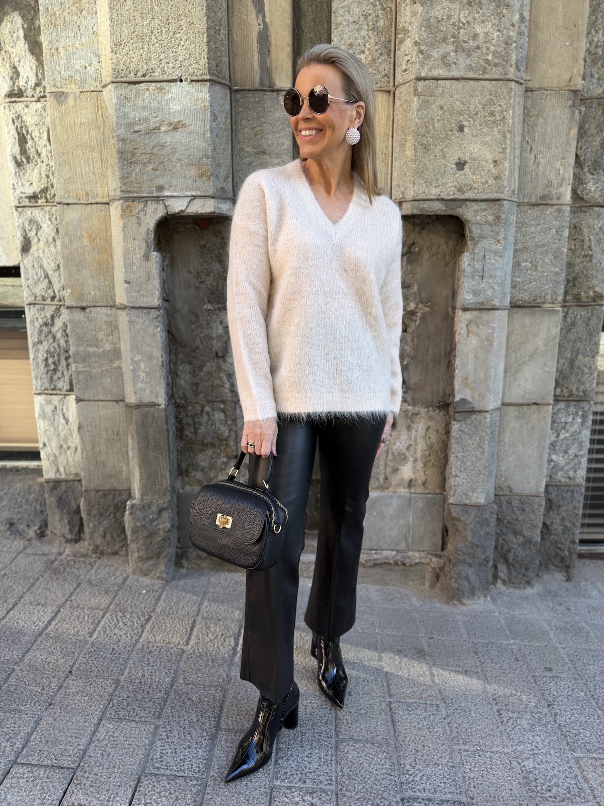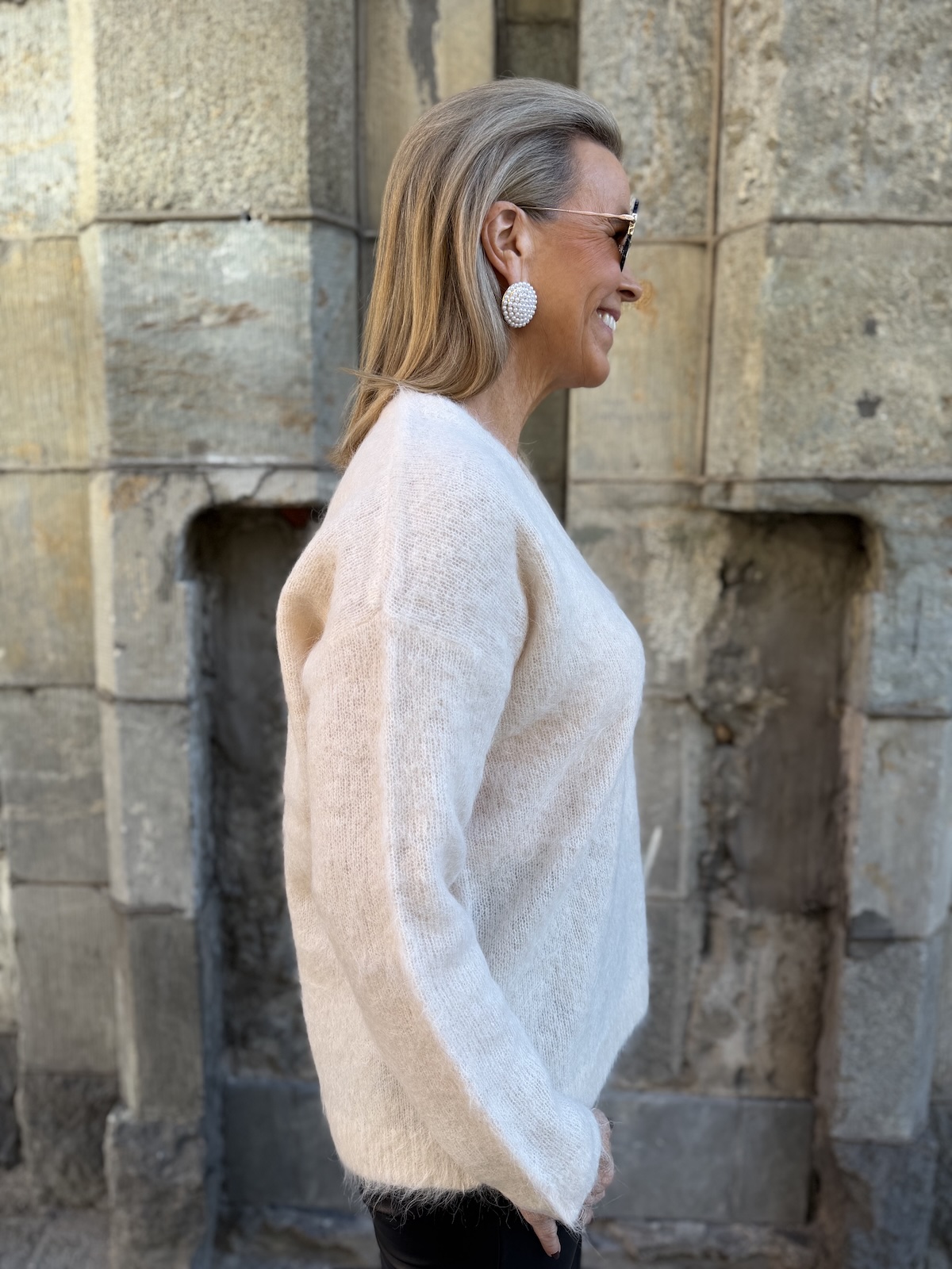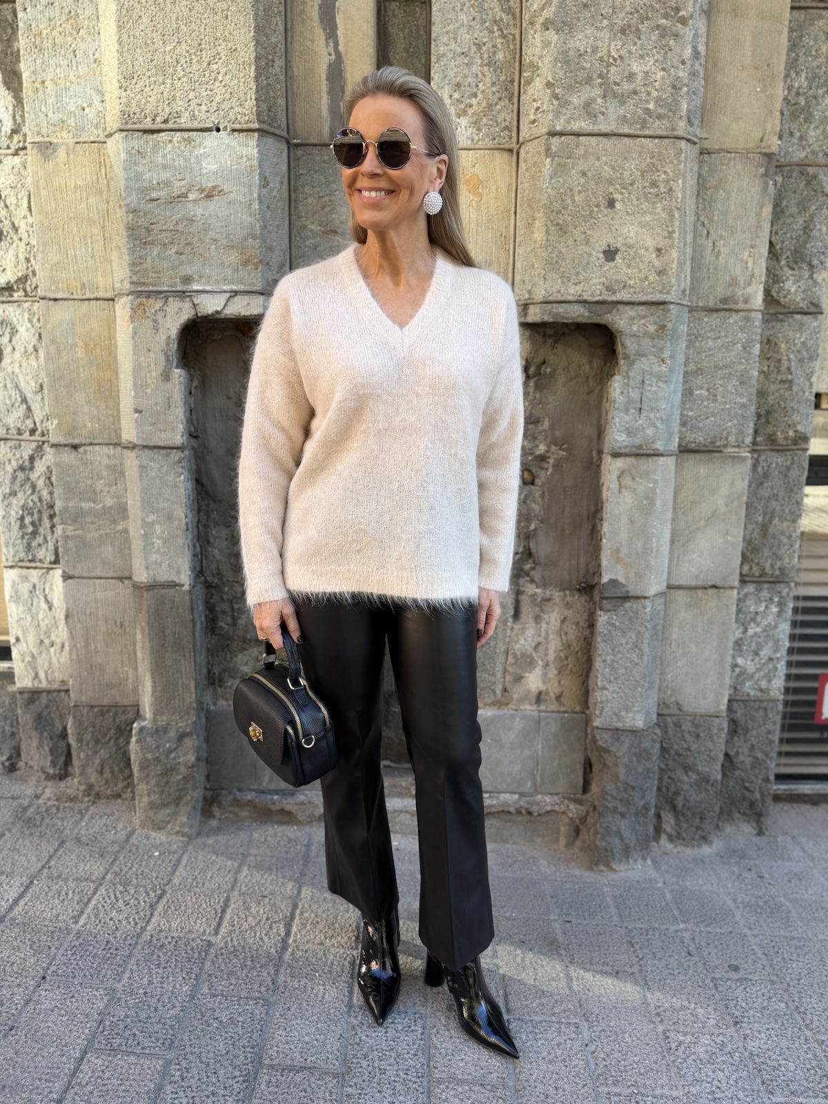 Tello on kaunis ja tyylikäs pörröinen neule. Neuleessa on V-kaula-aukko, joka ei ole liian syvä eli neuleen alle ei tarvitse pukea mitään. Neuleen hihat ovat täyspitkät ja malliltaan neule on suora. Neule ylettyy haarasauman kohdalle. Katalla on neuleesta päällä koko XS.