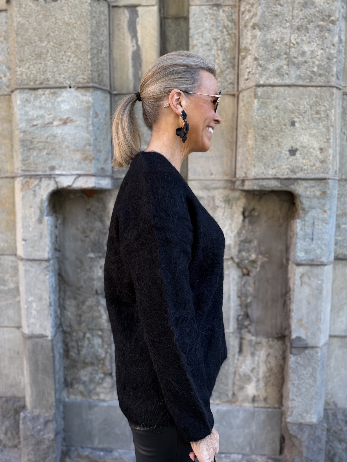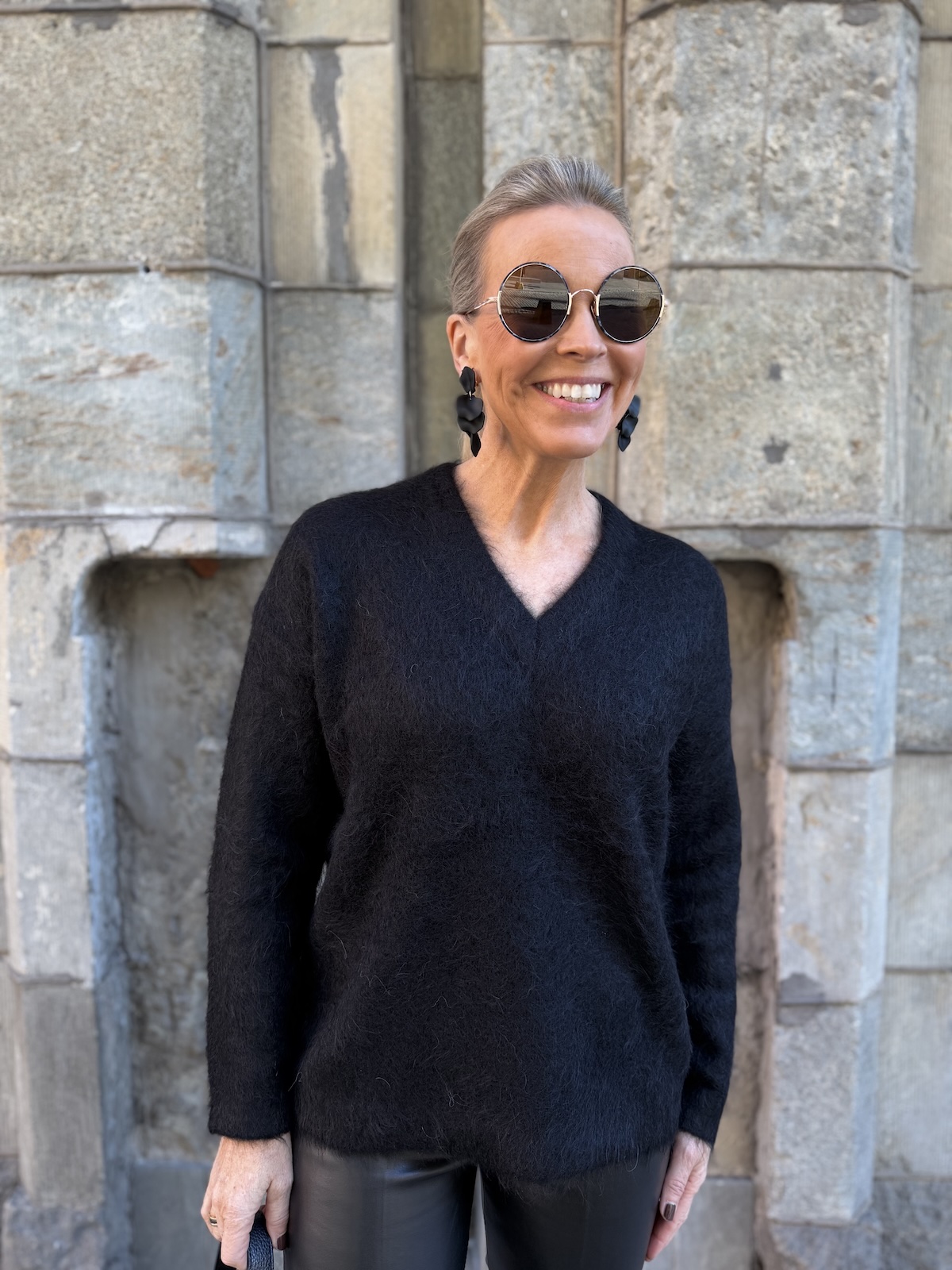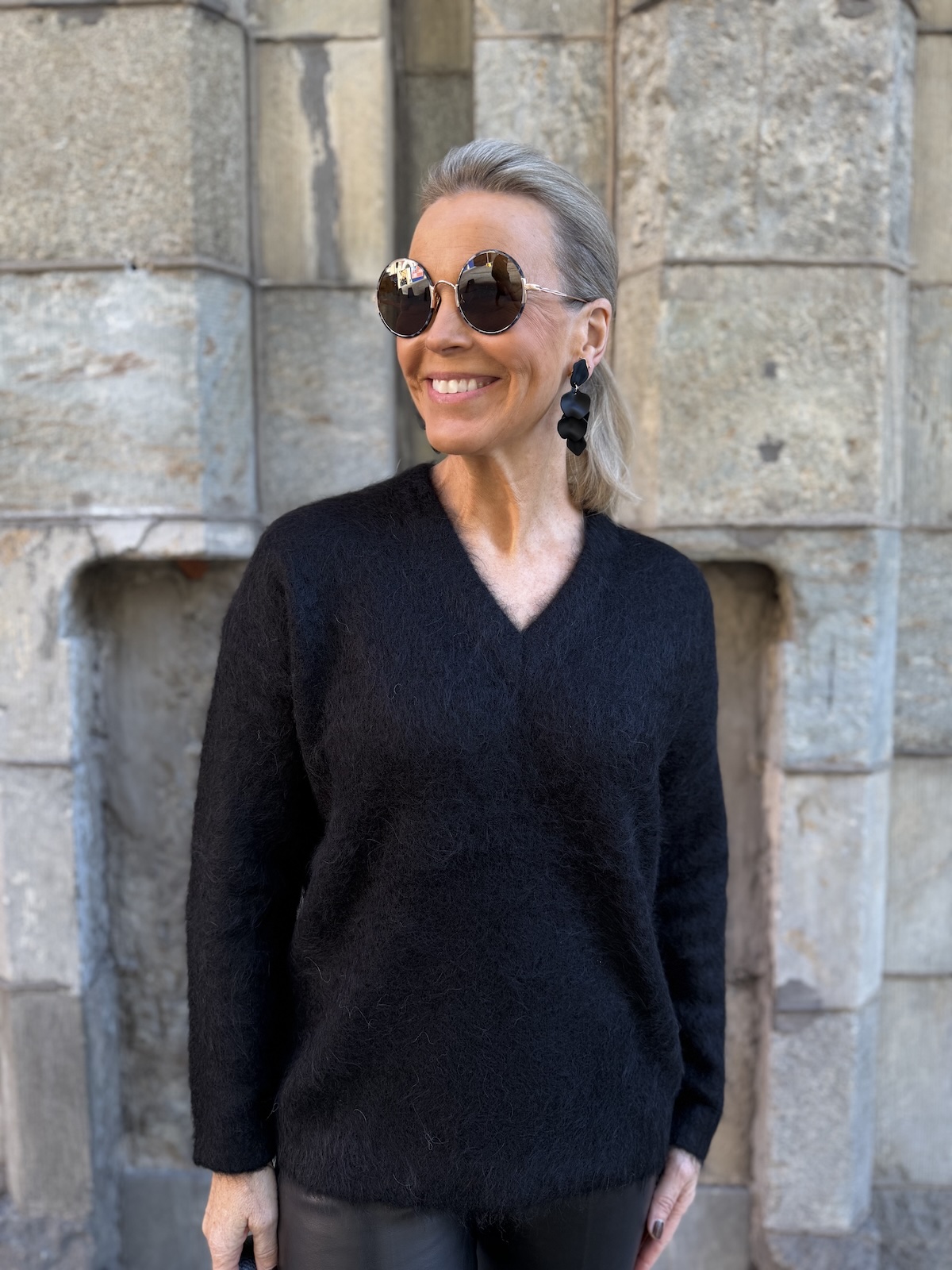 Tello on kaunis ja tyylikäs pörröinen neule. Neuleessa on V-kaula-aukko, joka ei ole liian syvä eli neuleen alle ei tarvitse pukea mitään. Neuleen hihat ovat täyspitkät ja malliltaan neule on suora. Neule ylettyy haarasauman kohdalle. Katalla on neuleesta päällä koko XS.