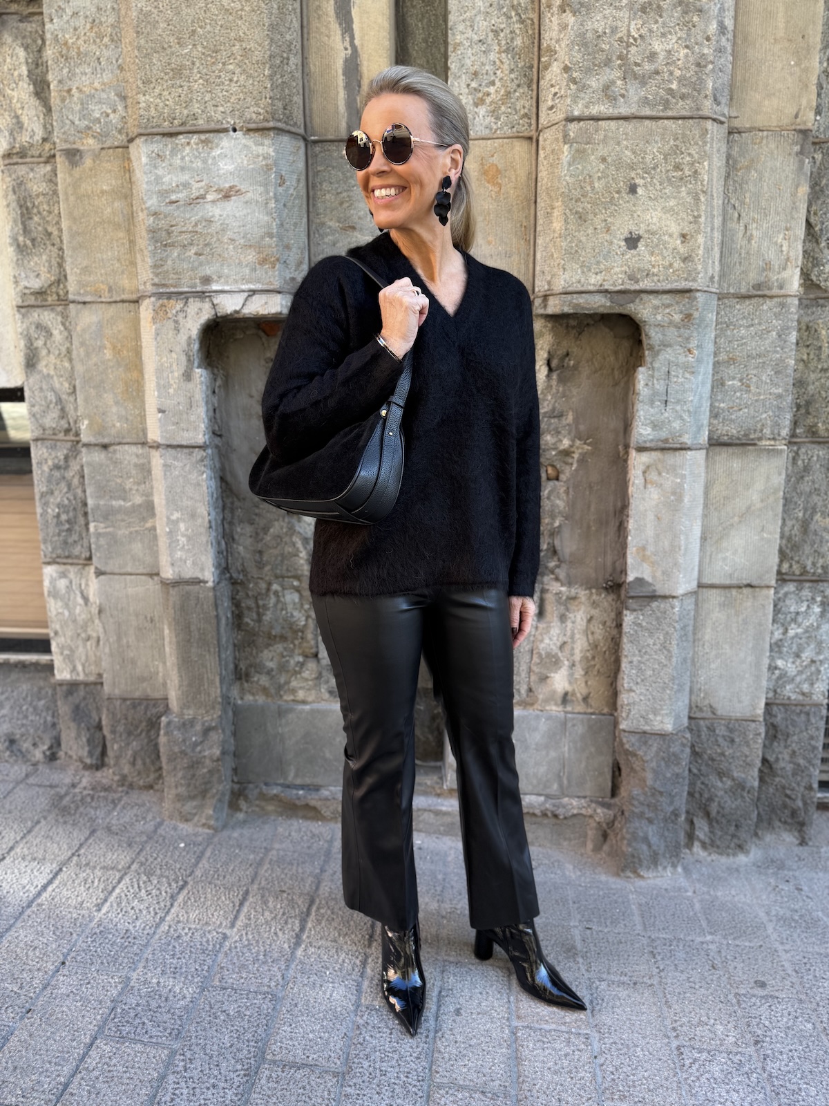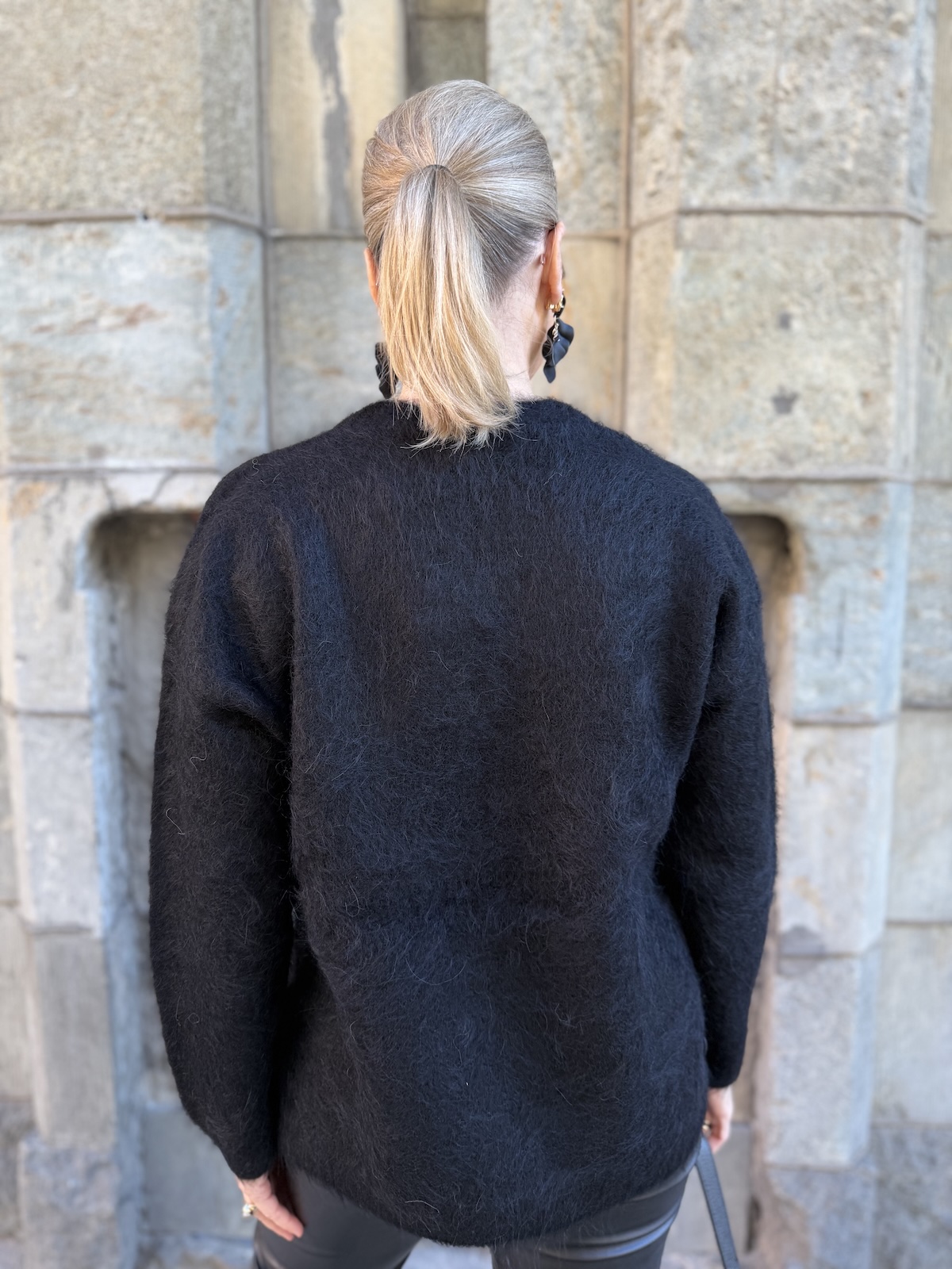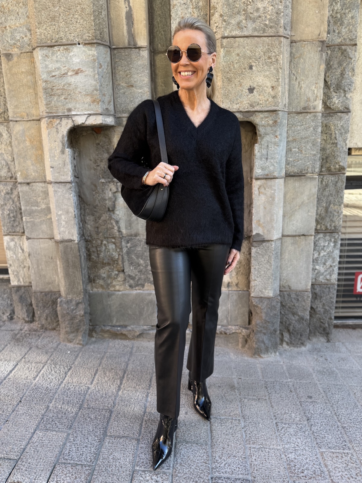 Tello on kaunis ja tyylikäs pörröinen neule. Neuleessa on V-kaula-aukko, joka ei ole liian syvä eli neuleen alle ei tarvitse pukea mitään. Neuleen hihat ovat täyspitkät ja malliltaan neule on suora. Neule ylettyy haarasauman kohdalle. Katalla on neuleesta päällä koko XS.