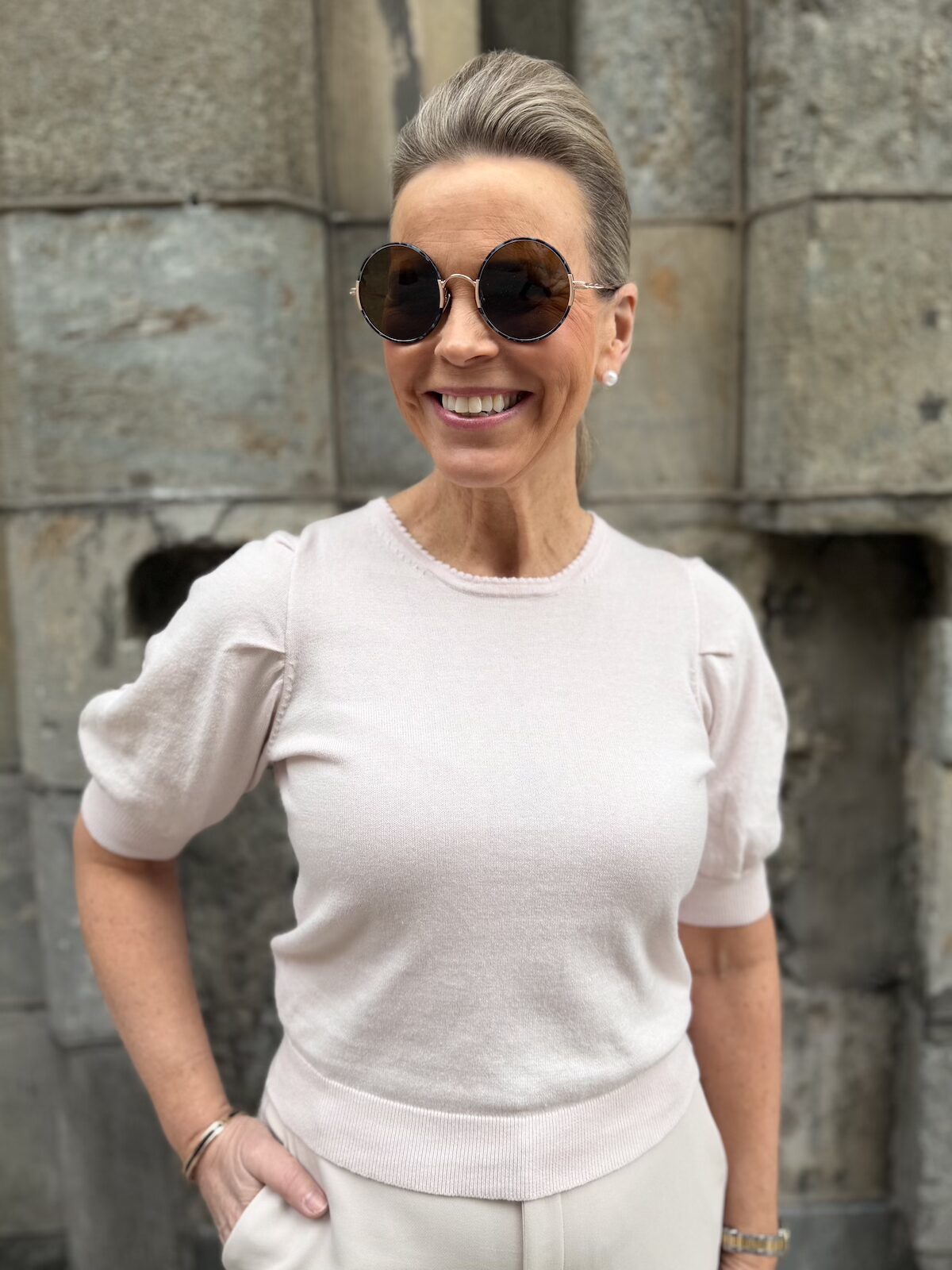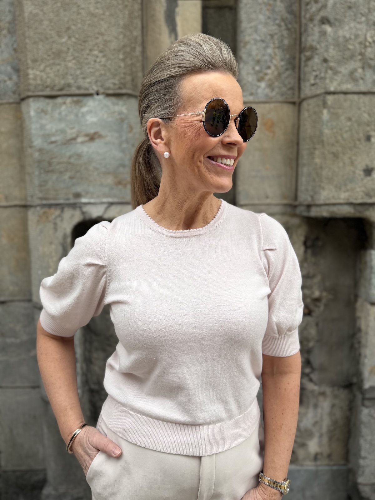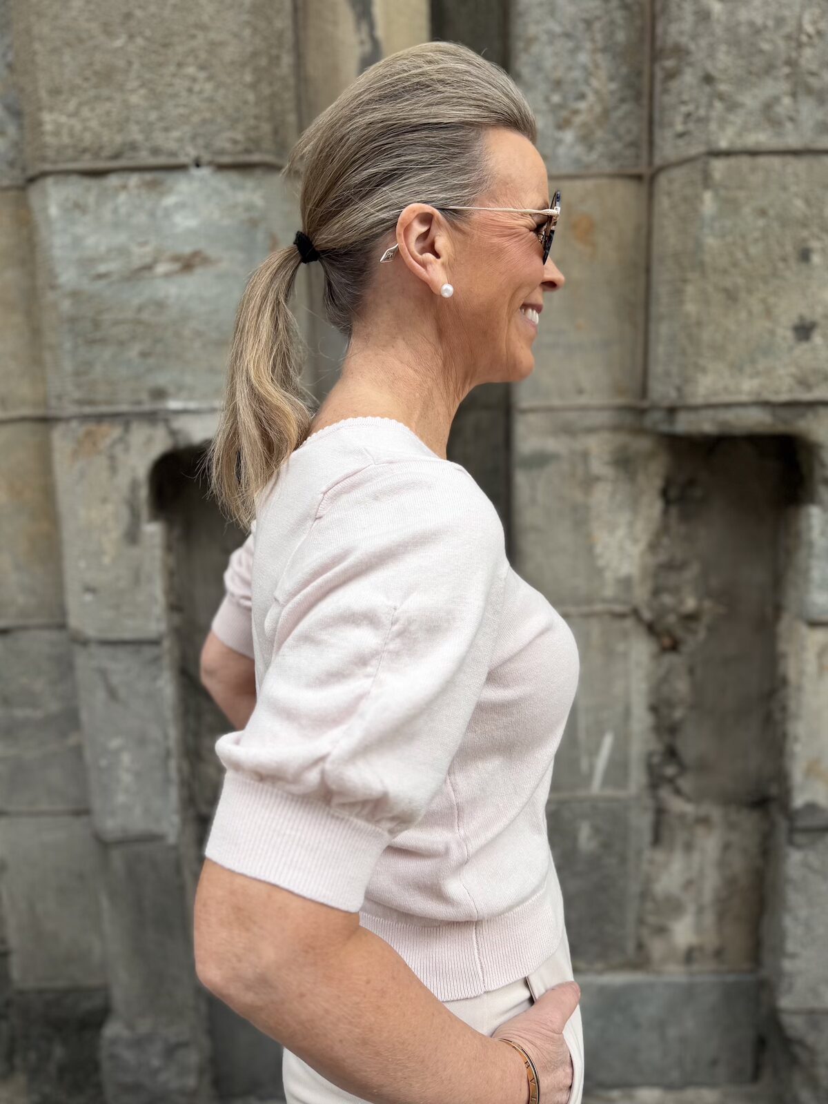 Vraian neule on super pehmoinen ja neuleen väri on hailakka rosa eli mauve chalk. Neuleessa on O-kaula-aukko ja kivat pussimaiset hihat, jotka ylettyvät kyynerpäiden kohdalle. Malliltaan neule on suora ja se loppuu hieman vyötärön alapuolelle.. Neuleen helmassa ja hihansuissa on resorit. Katalla on neuleesta päällä koko S.