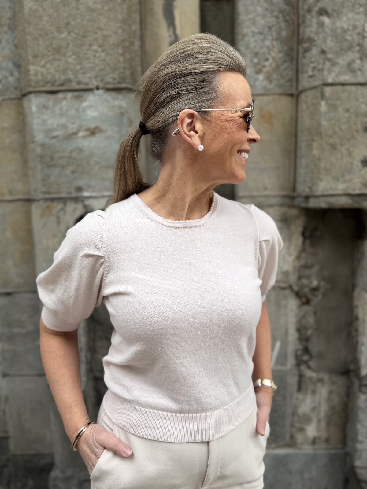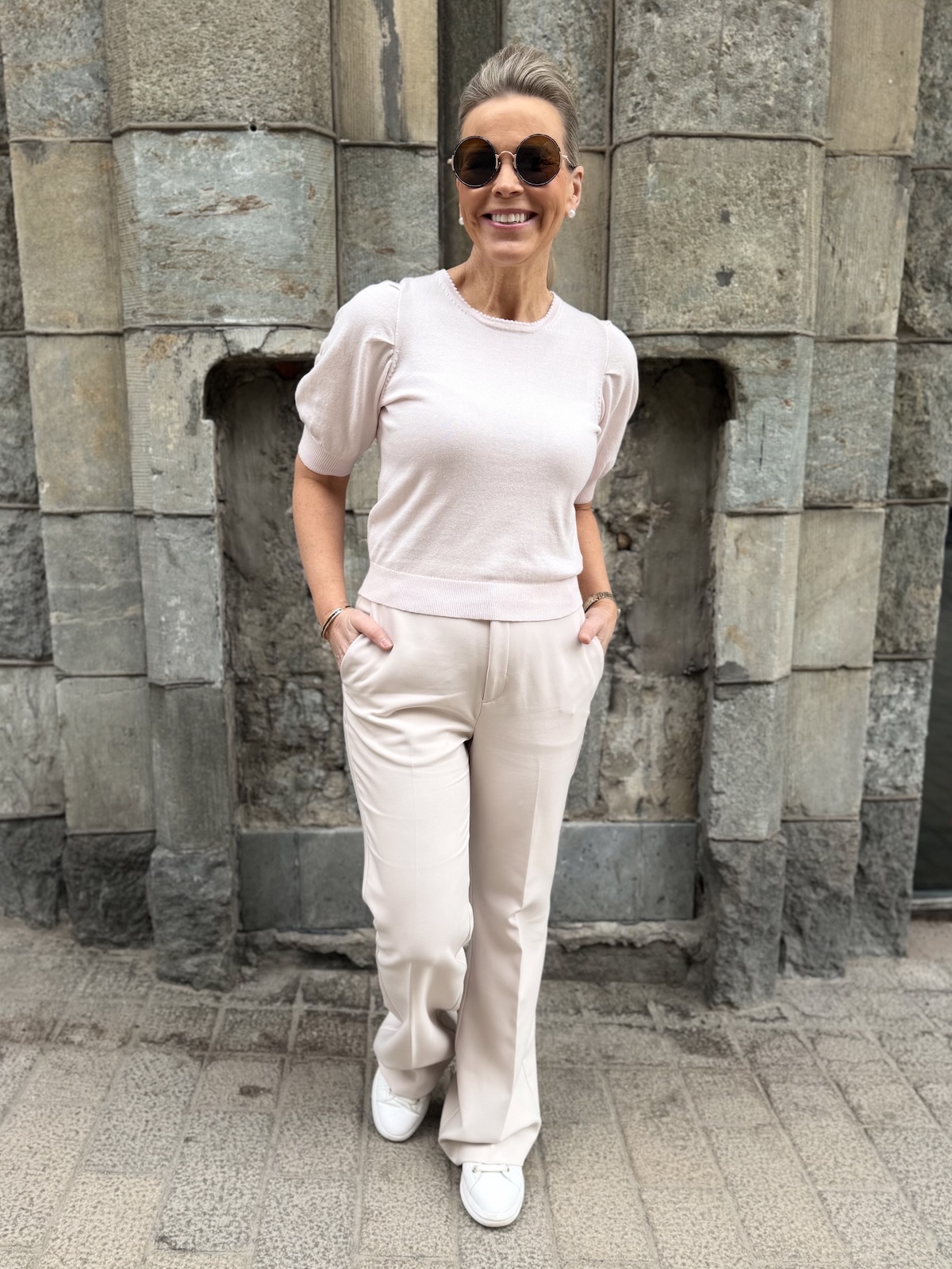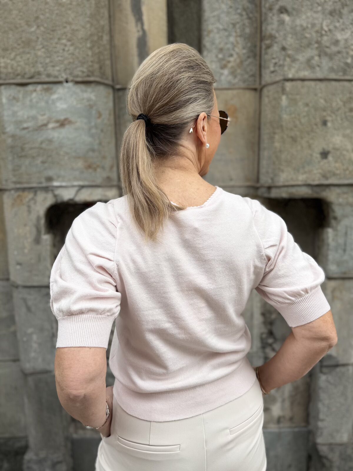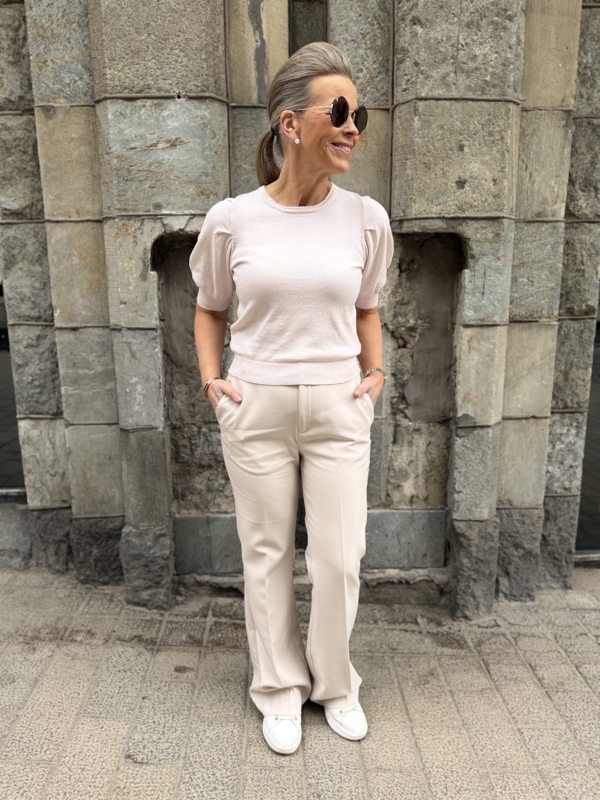 Vraian neule on super pehmoinen ja neuleen väri on hailakka rosa eli mauve chalk. Neuleessa on O-kaula-aukko ja kivat pussimaiset hihat, jotka ylettyvät kyynerpäiden kohdalle. Malliltaan neule on suora ja se loppuu hieman vyötärön alapuolelle.. Neuleen helmassa ja hihansuissa on resorit. Katalla on neuleesta päällä koko S.