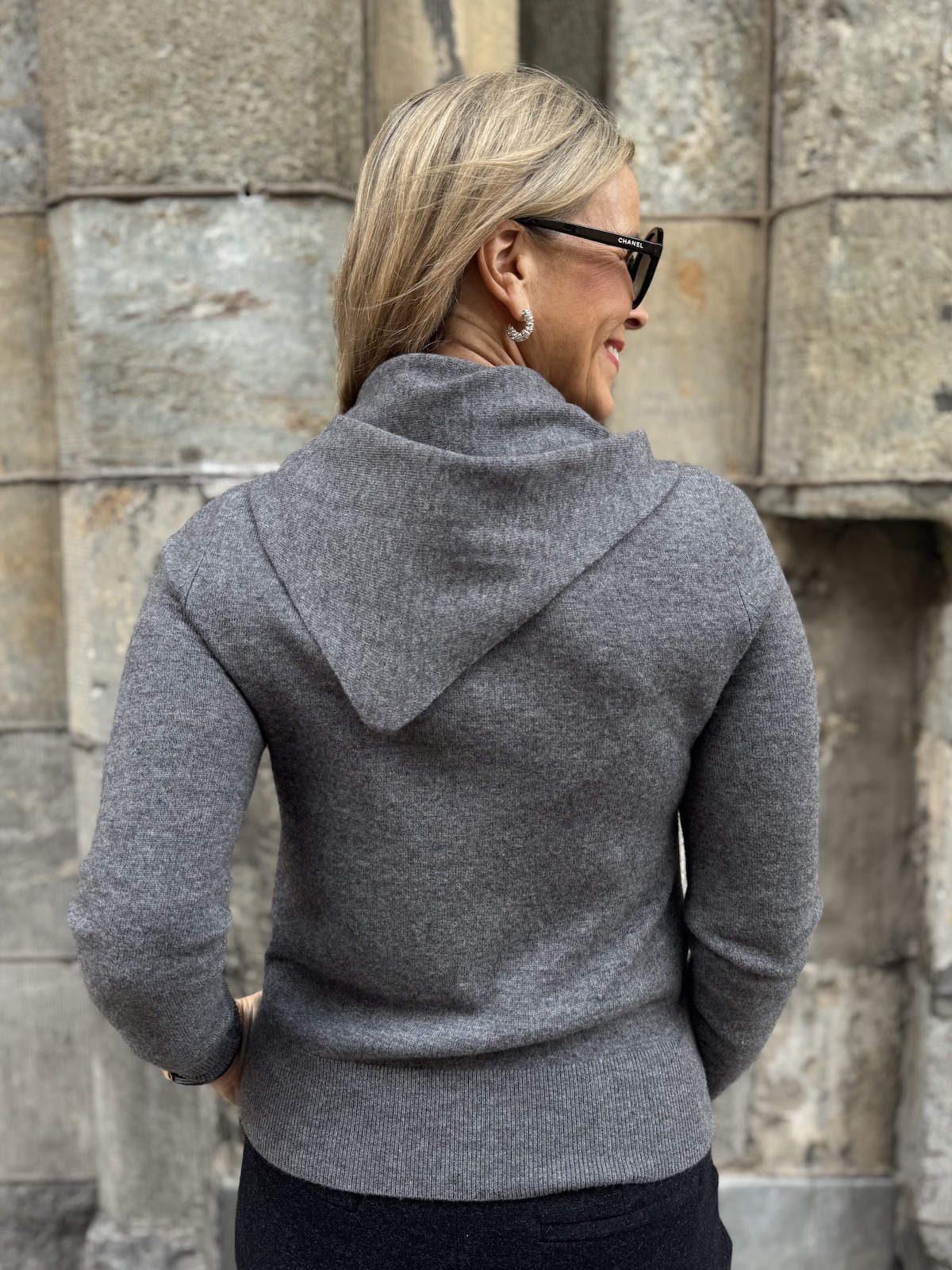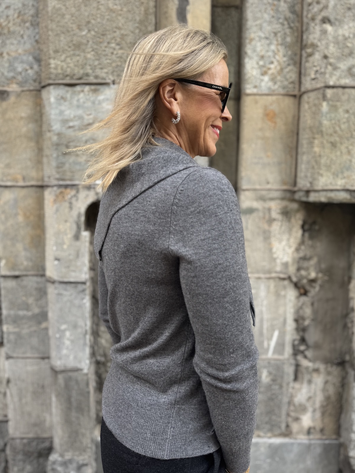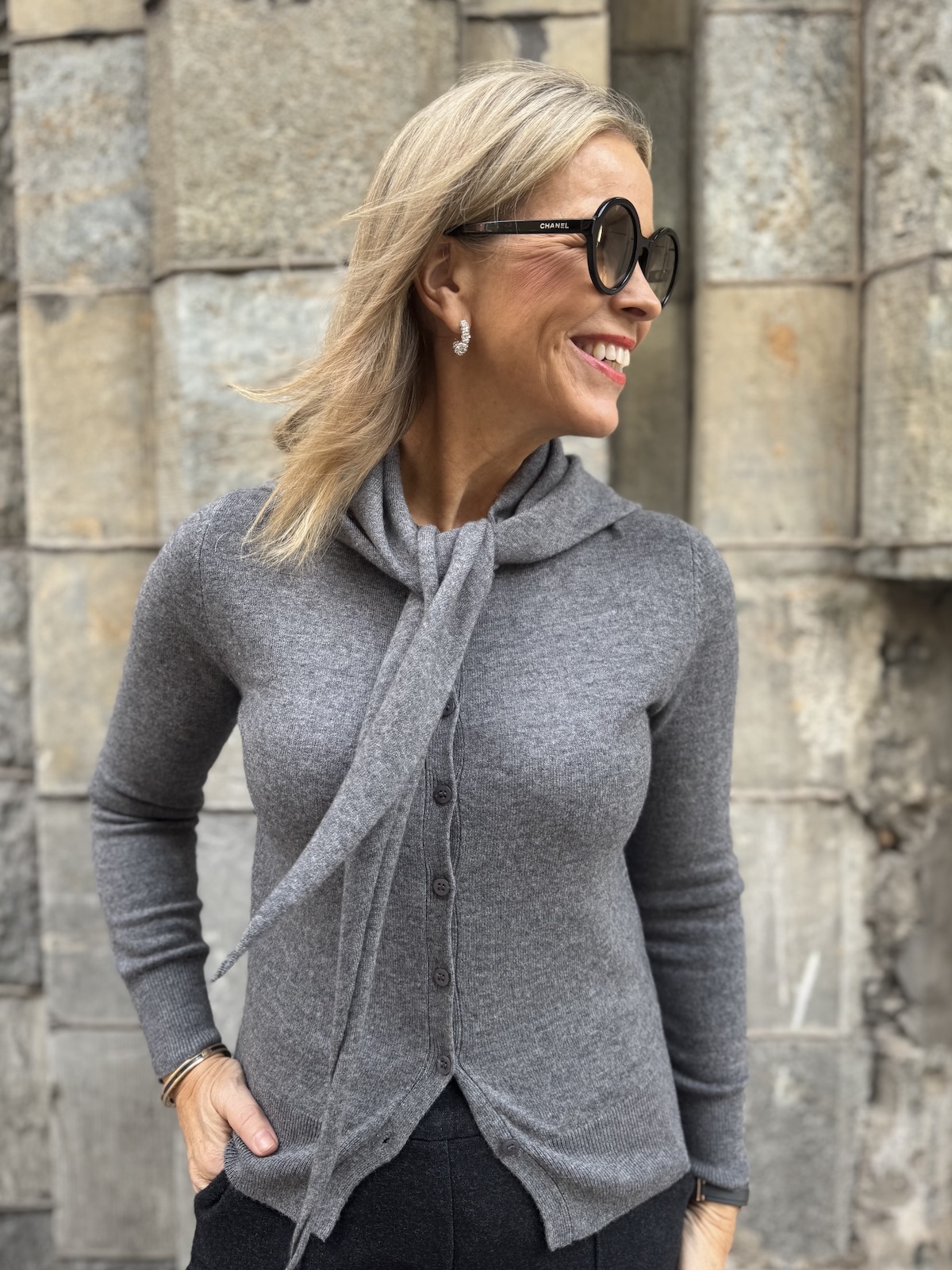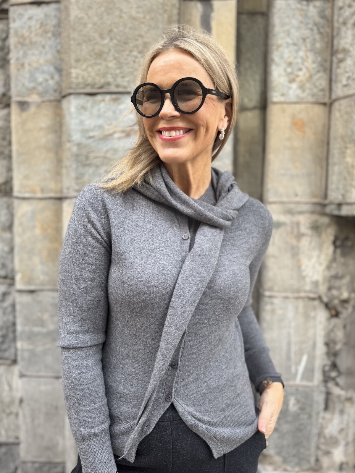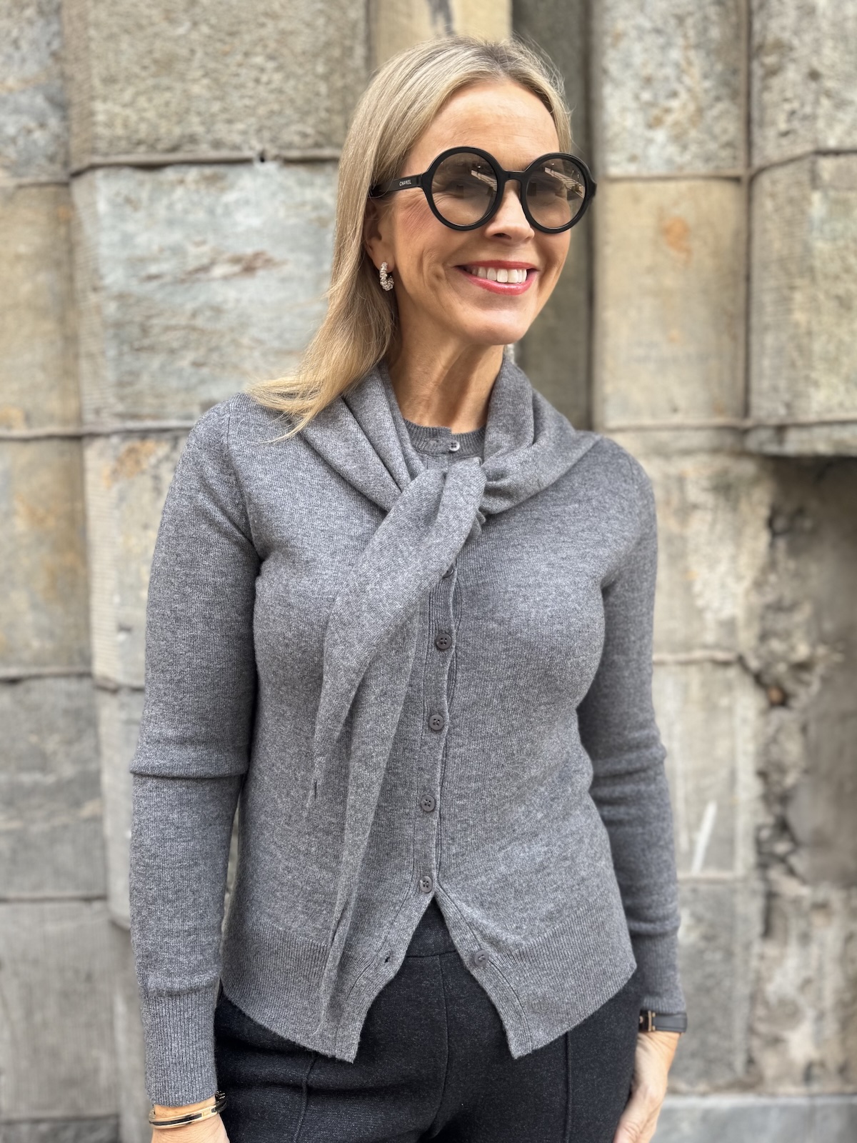 Molina on pehmoista ja miellyttävän tuntuista 100% villaa. Neuleesta ei uskoisi, että se on villaa, koska se on niin pehmoista eikä se yhtään kutita. Neuletakissa on napit edessä ja malliltaan se on kepaahko ja klassisen mallinen neuletakki. Neuletakissa on O-kaula-aukko ja neuletakin niskaosaan on neulottu kiinni huivi, jonka päät saa sitoa eteen. Huivia ei saa irti neuleesta. Neule ylettyy lantiolle. Katalla on neuleesta päällä koko S. Neule on yhtä kokoa pienempi kuin normaalisti.