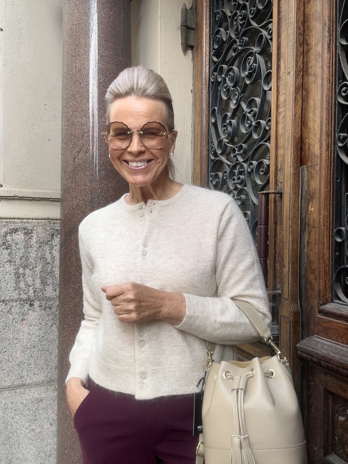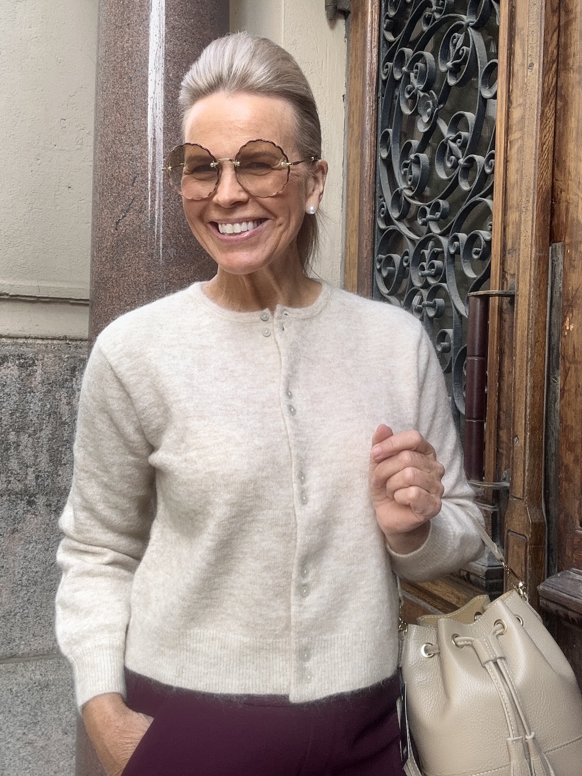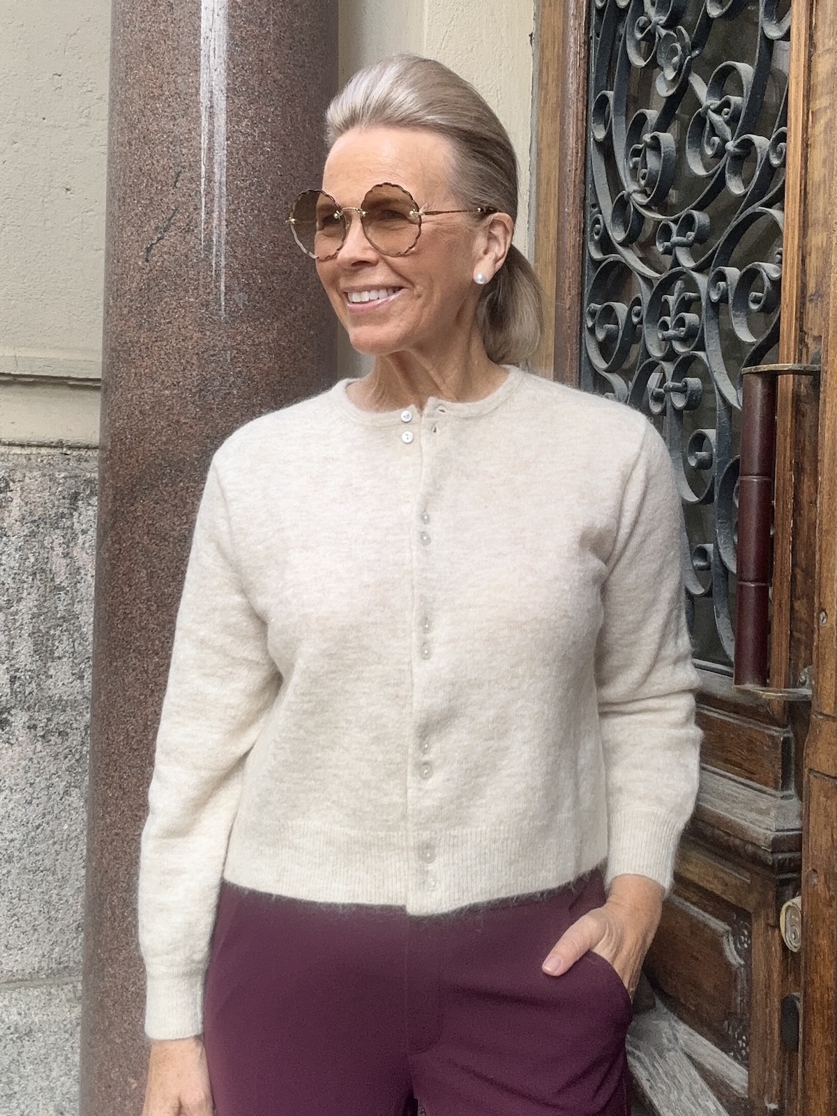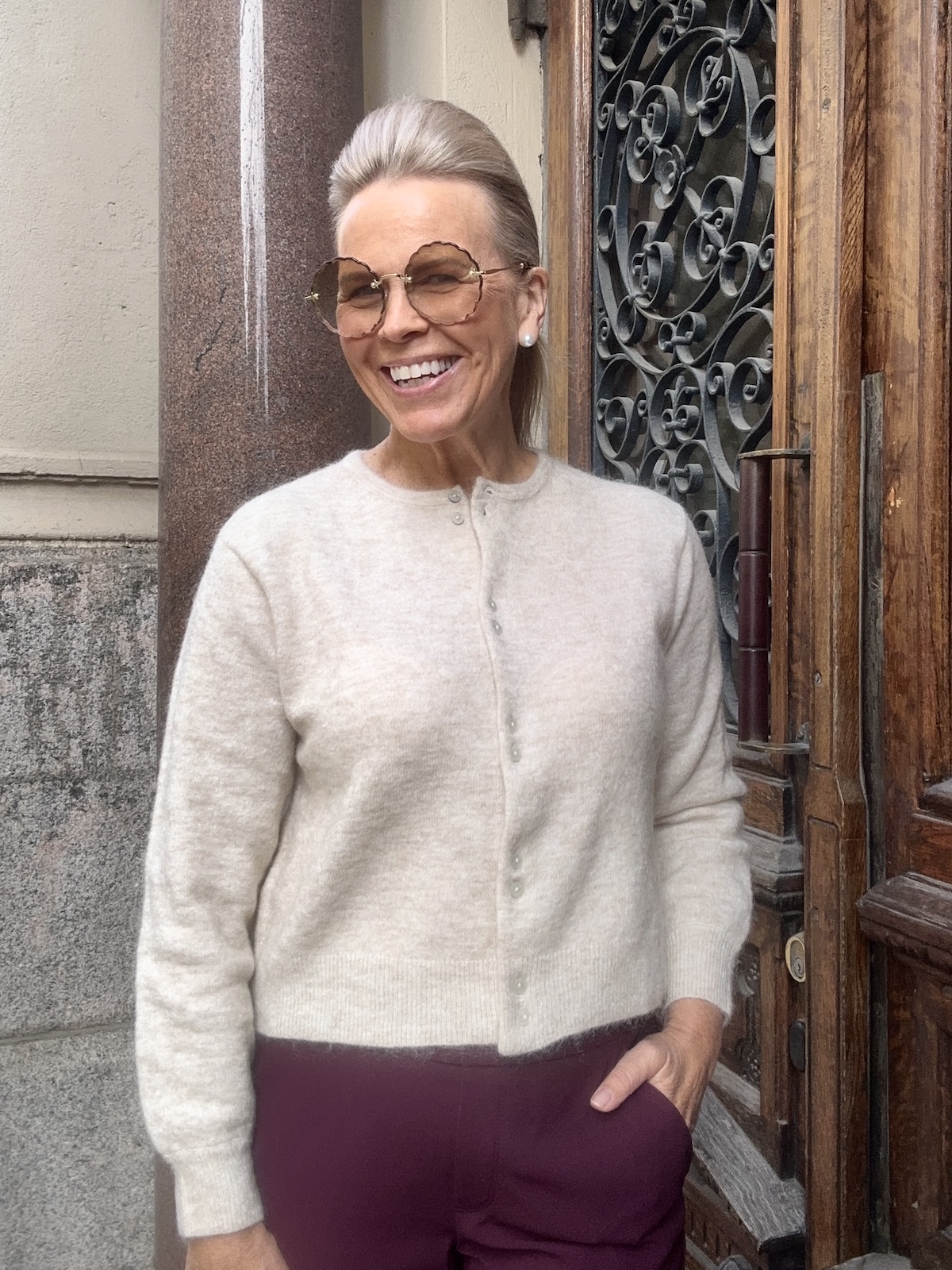 Ninell on pehmoinen neuletakki, joka on hieman lyhempi eli se soveltuu myös löysän ja leähkön alaosan pariksi. Neuletakissa on kauniit pienet napit edessä ja ne on jaoteltu kahden napin ryhmiksi. Malliltaan neuletakki on suora ja se loppuu lonkkaluiden kohdalle. Katalla on neuletakista päällä koko XS. Neuletakki on reiluhkoa kokoa.