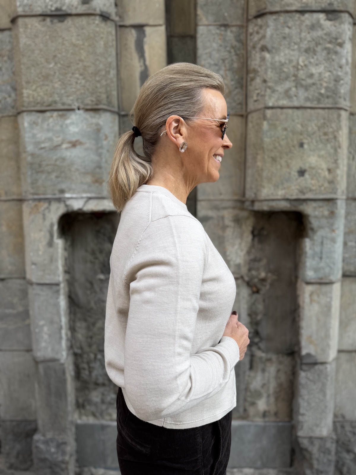 Noelani on ohut 100% villa neuletakki. Neuletakki on klassisen mallinen eli siinä on O-kaula-aukko ja edessä on napit. Nappilistan alla on satiininauha. Neuletakin hihansuissa ja helmassa on samanlaiset resorit. Katalla on neuletakista päällä koko S.