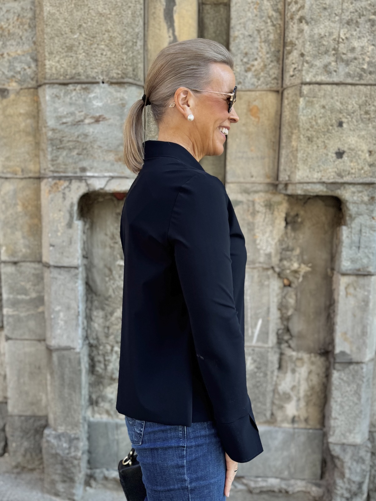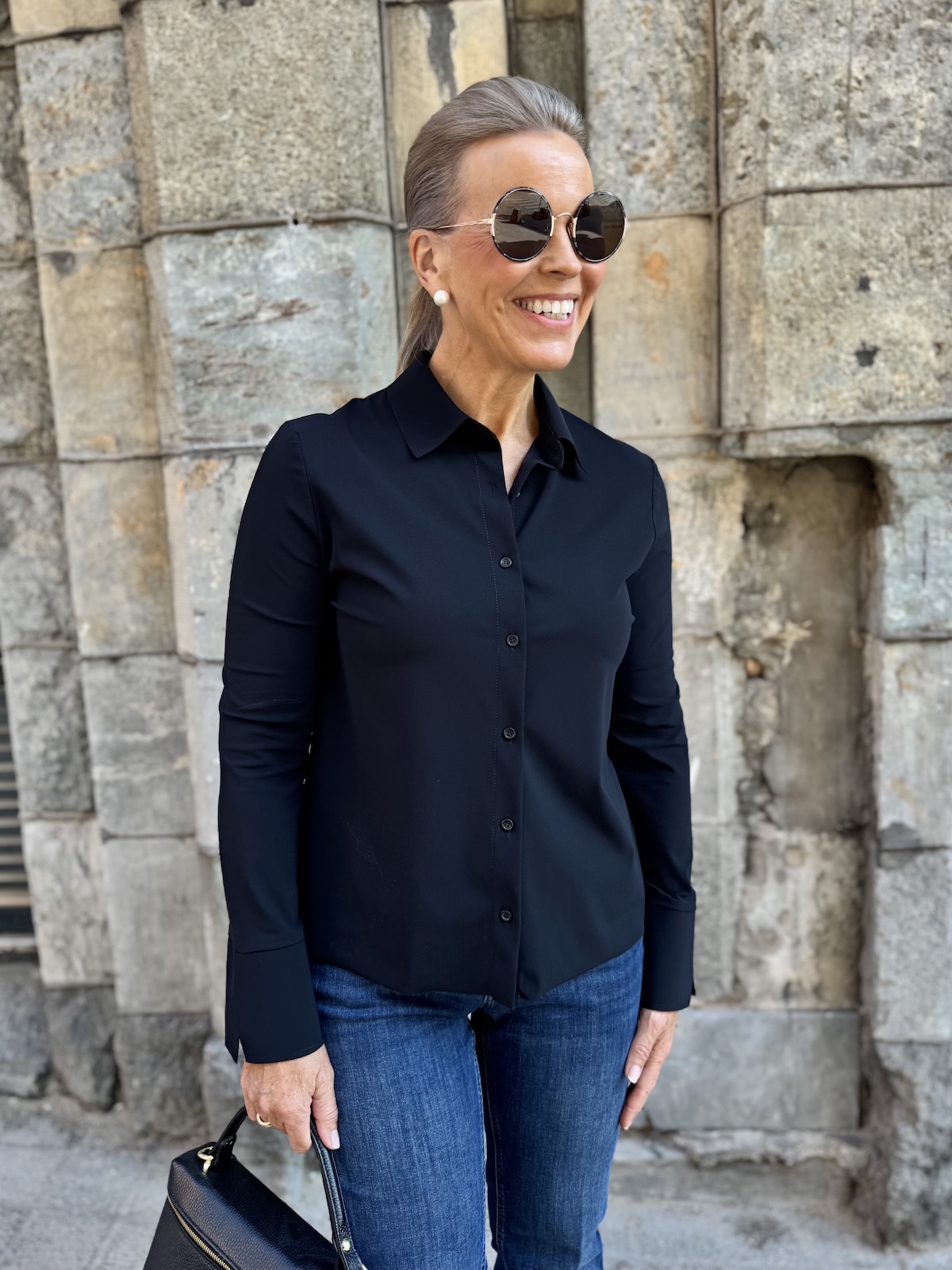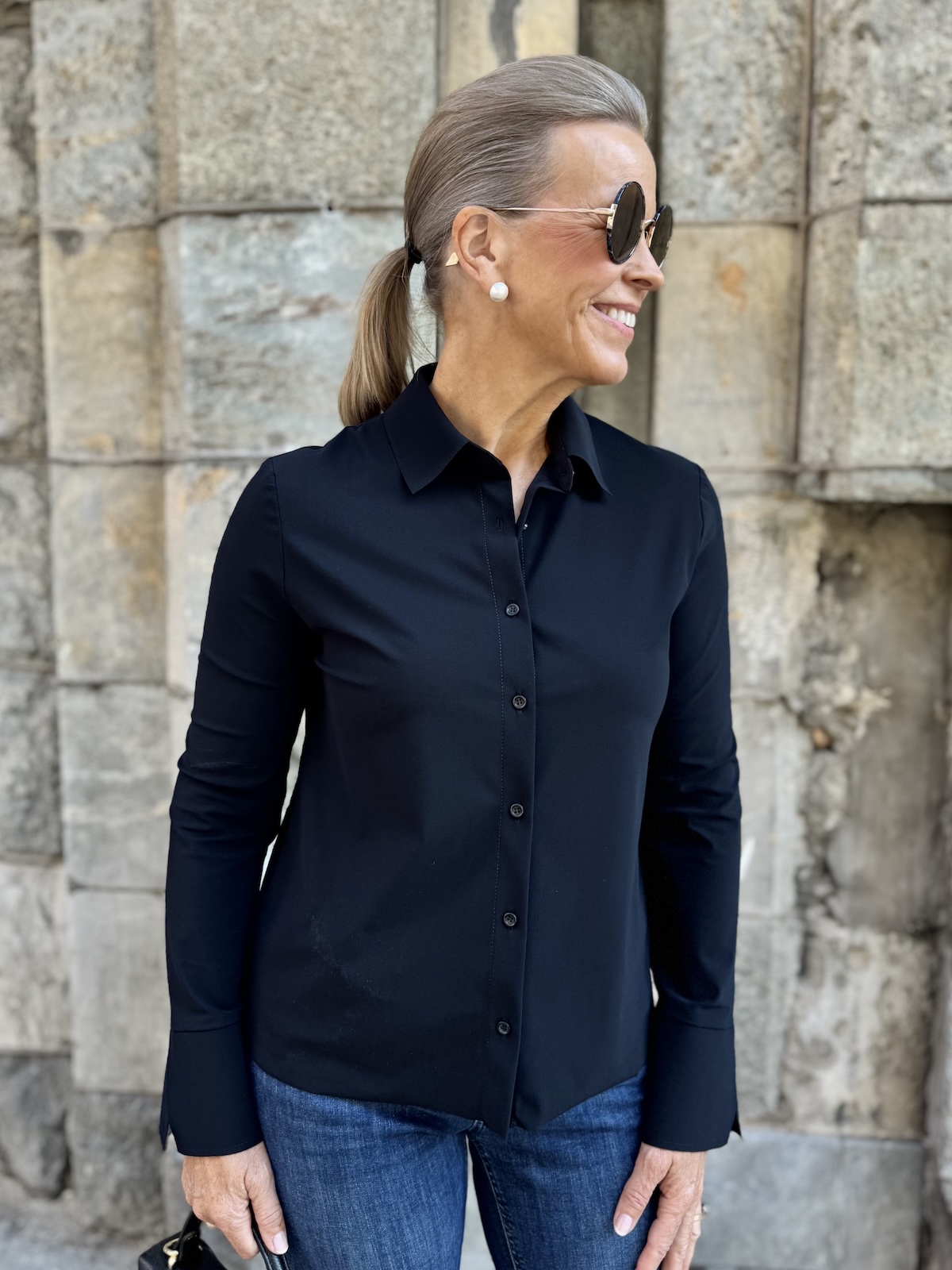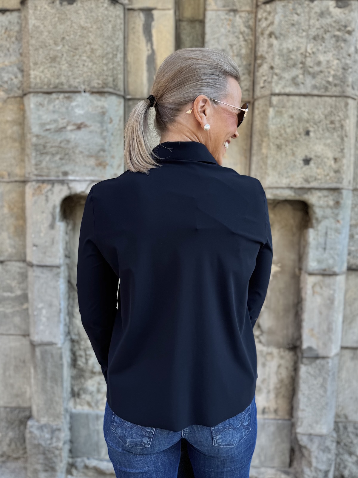 Barcy kauluspaita on aivan ihanaa materiaalia. Paita on joustavaa, pehmoista ja hieman ”Jumppavaatteiden” tyylistä materiaalia. Paidassa on kaulukset ja edessä on napit. Hihat ovat täyspitkät ja hihansuissa on leveät rannekkeet, jotka voi kääntää. Malliltaan paita on suora ja se loppuu lantiolle, lonkkaluiden alapuolelle. Katalla on paidasta päällä koko 36.