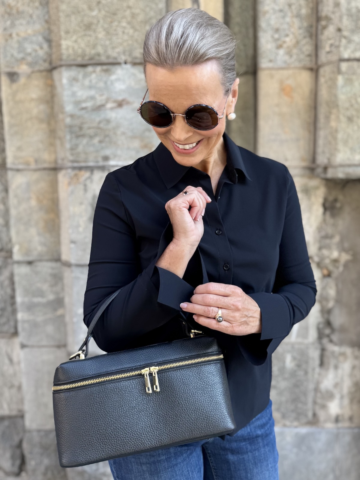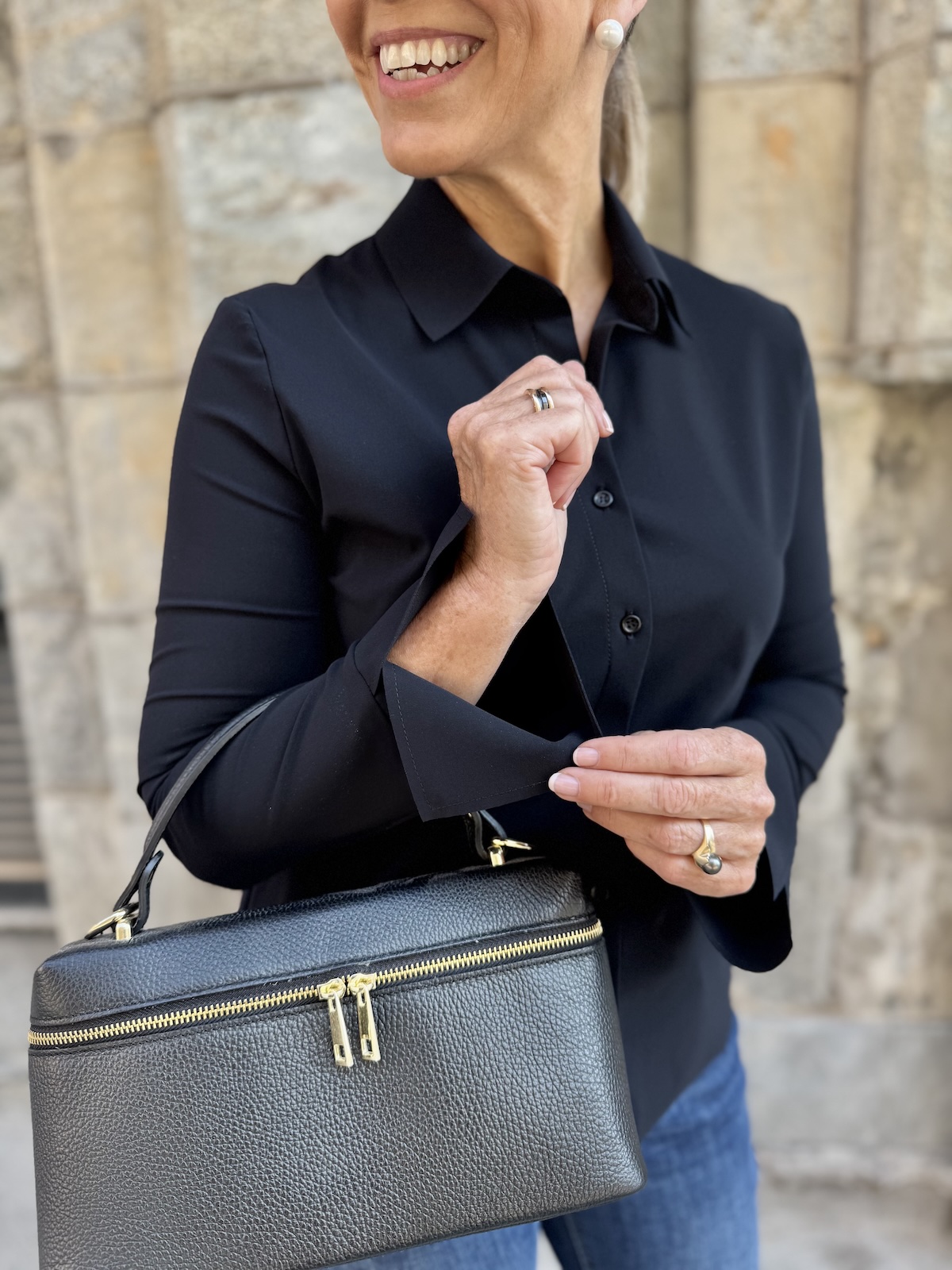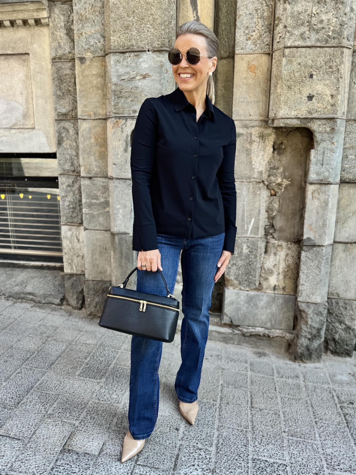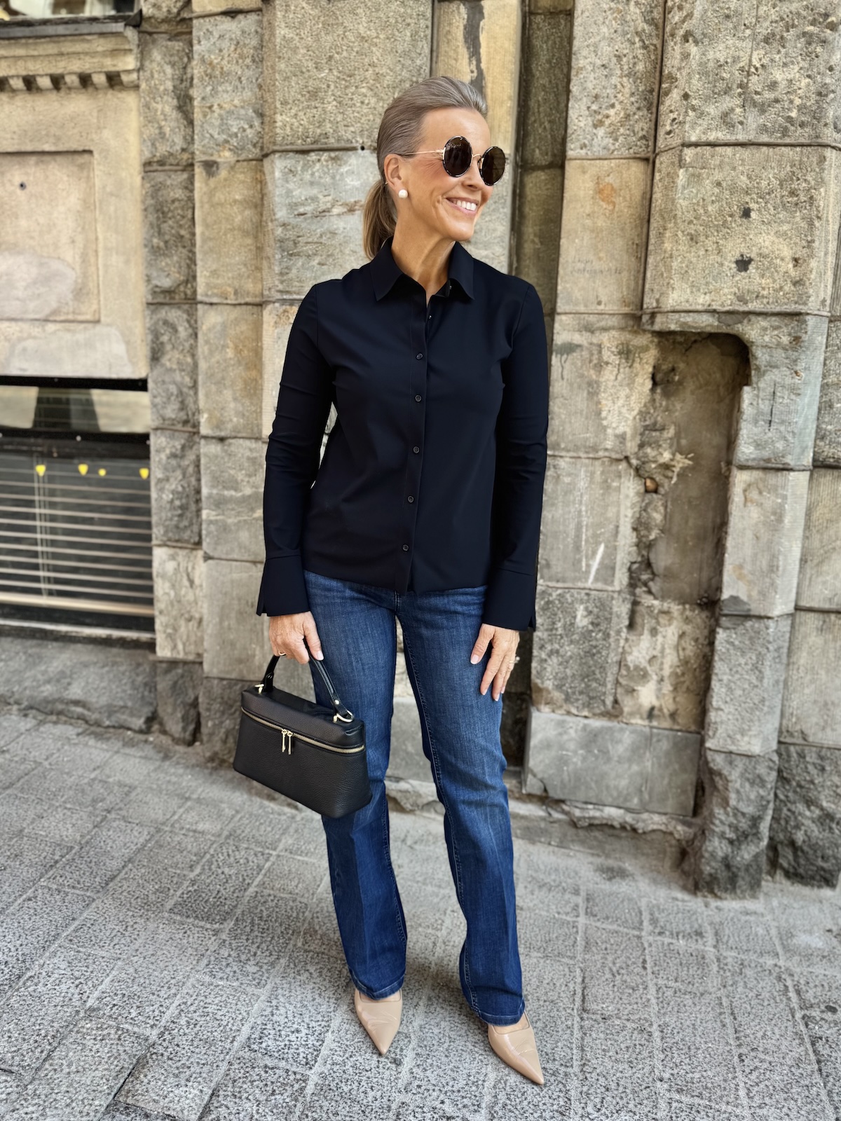 Barcy kauluspaita on aivan ihanaa materiaalia. Paita on joustavaa, pehmoista ja hieman ”Jumppavaatteiden” tyylistä materiaalia. Paidassa on kaulukset ja edessä on napit. Hihat ovat täyspitkät ja hihansuissa on leveät rannekkeet, jotka voi kääntää. Malliltaan paita on suora ja se loppuu lantiolle, lonkkaluiden alapuolelle. Katalla on paidasta päällä koko 36.