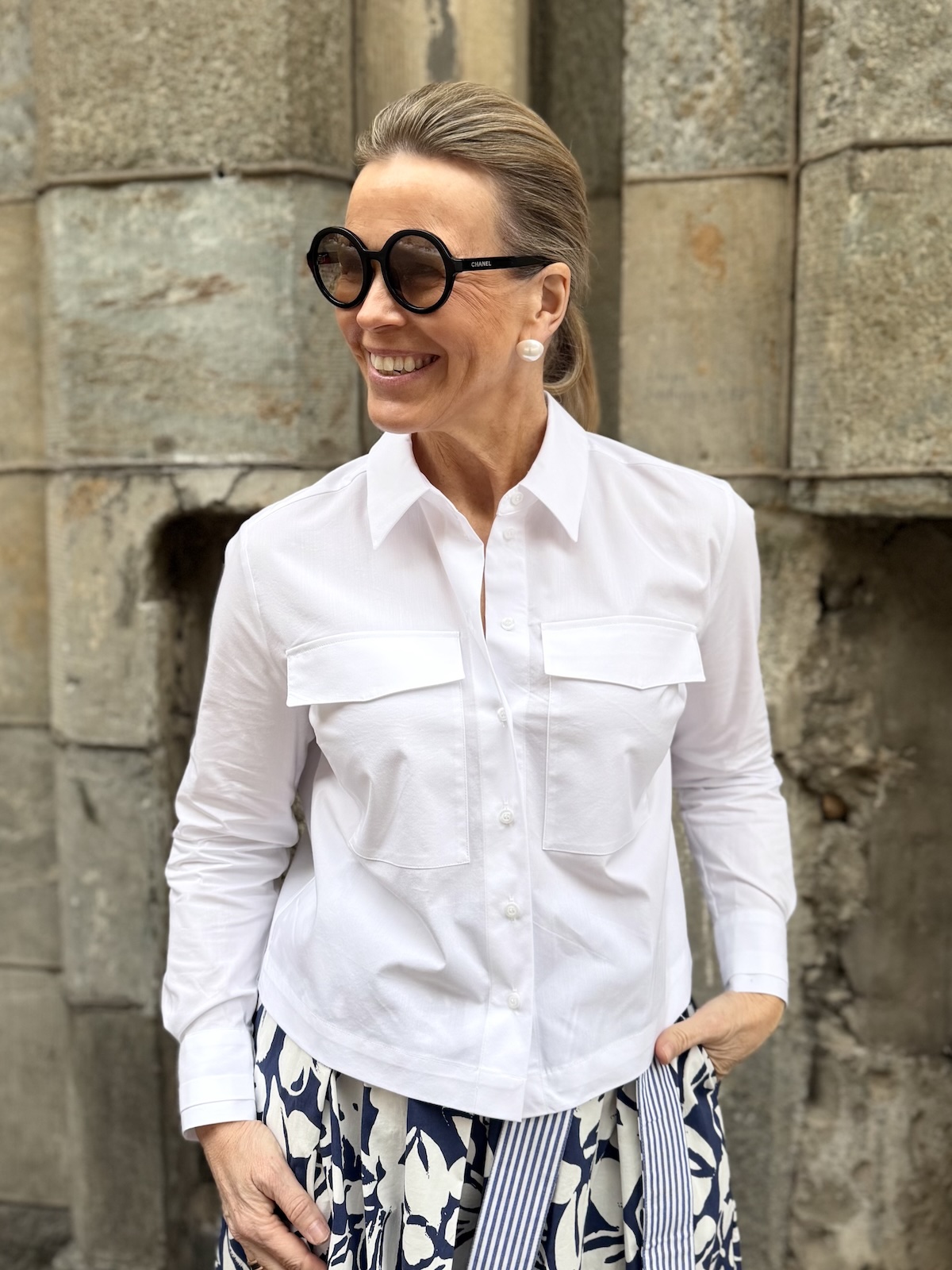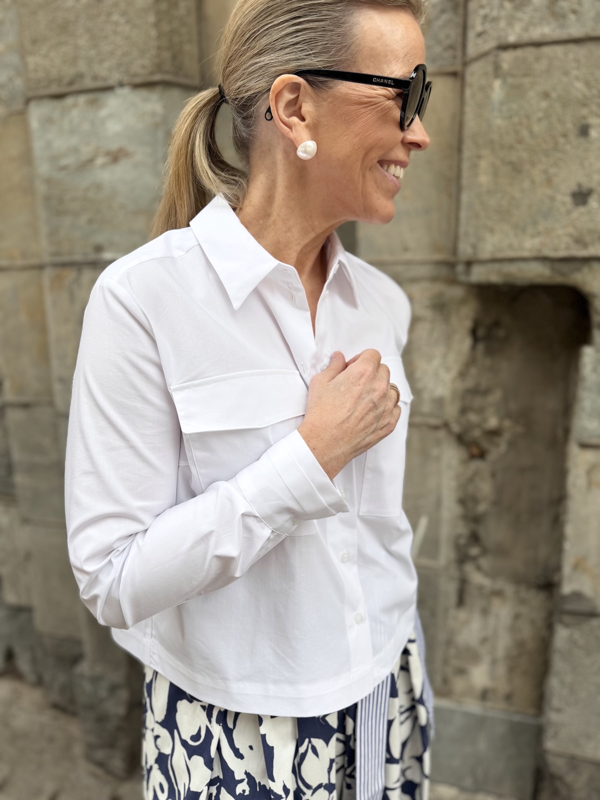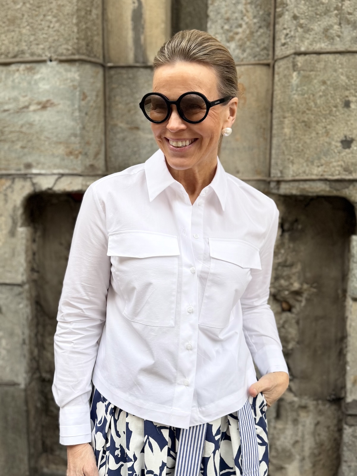 Myla on lyhyehkö paitapusero joka sopii niin housujen kuin hameidenkin kanssa pidettäväksi. Paitapuserossa on kaulukset ja edessä on napit. Hihat ovat täyspitkät ja rannekkeissa on kaunis, tyylikäs yksityiskohta. Malliltaan paita on suora, boximainen ja sen helma on kauniisti pyöristetty. Paita ylettyy noin lonkkaluiden kohdalle. Katalla on paidasta päällä koko 34.