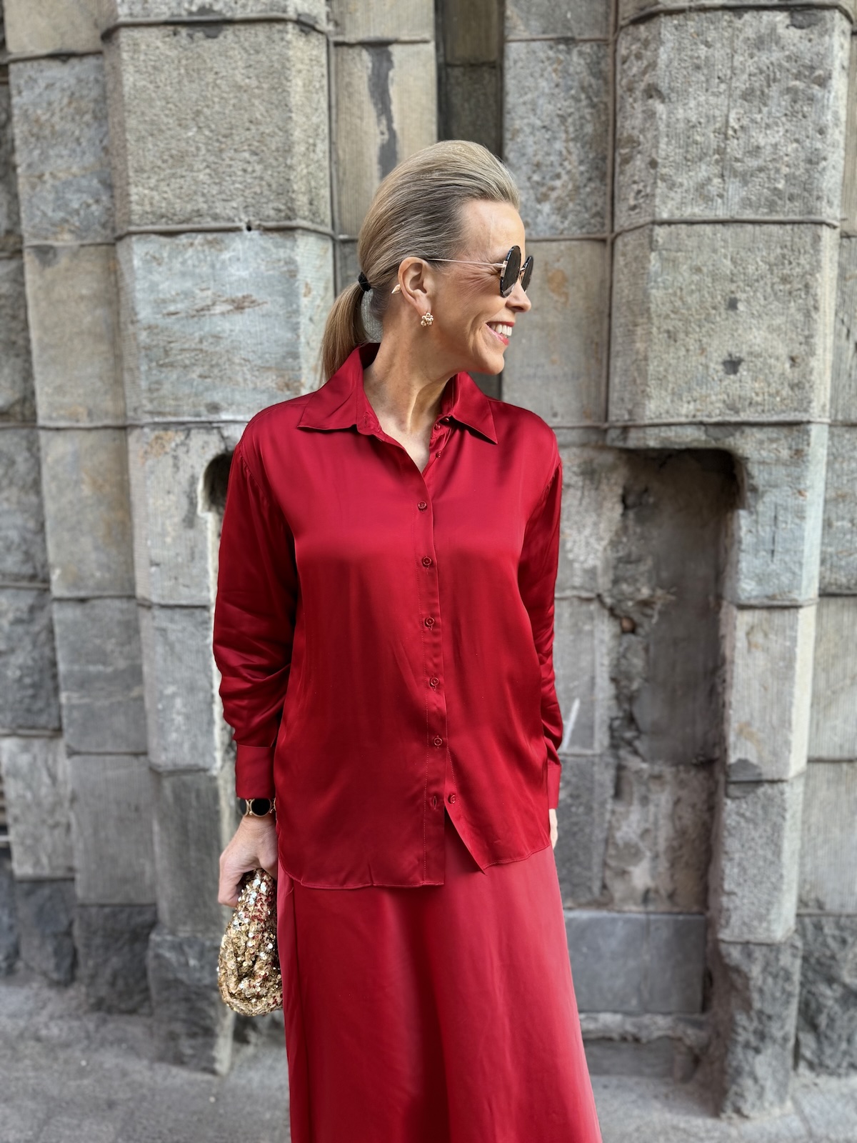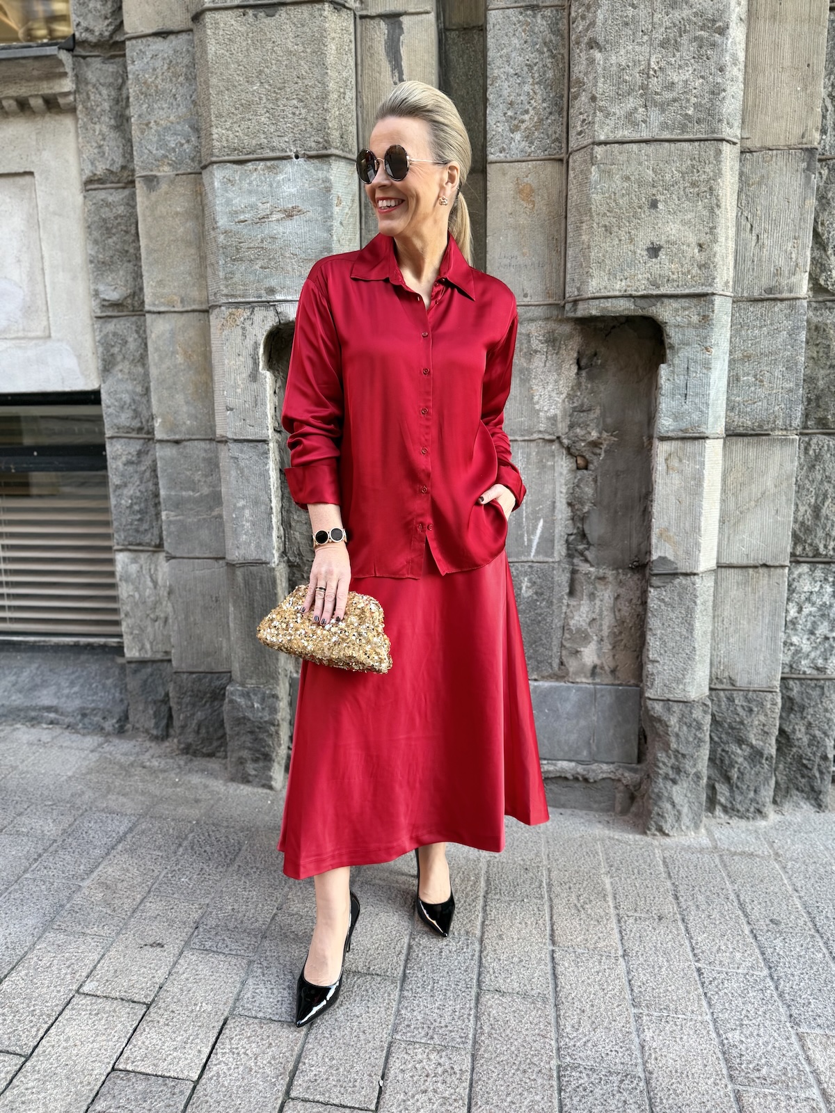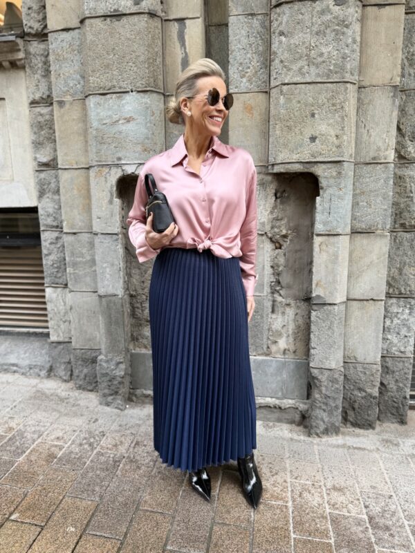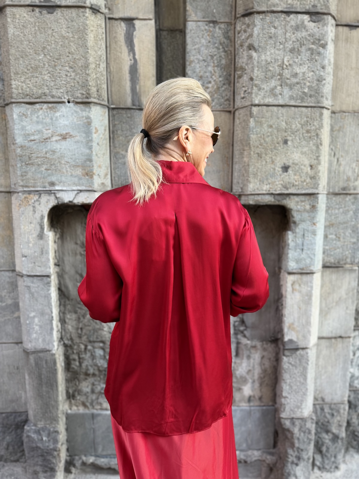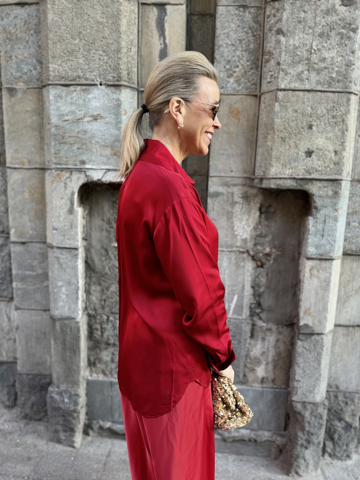 Pauline on kaunis viskoosipaitapusero. Paidassa on kaulukset ja edessä on napit. Hihat ovat täyspitkät ja hihansuissa on leveät rannekkeet, jotka voi kääntää. Malliltaan paita on suora ja se loppuu lantiolle. Paita on takaa noin 5 cm pidempi kuin edestä. Katalla on paidasta päällä koko 34.