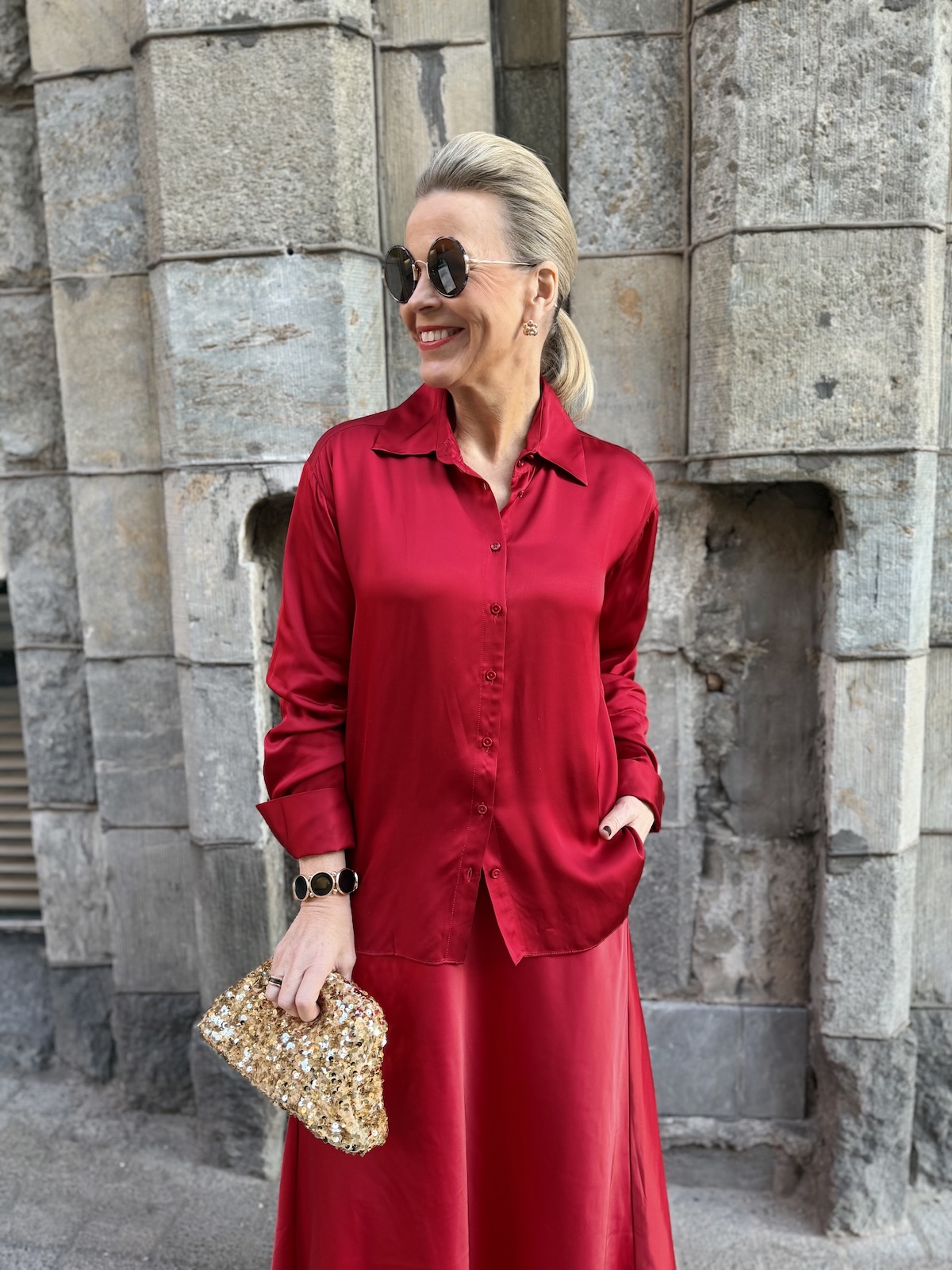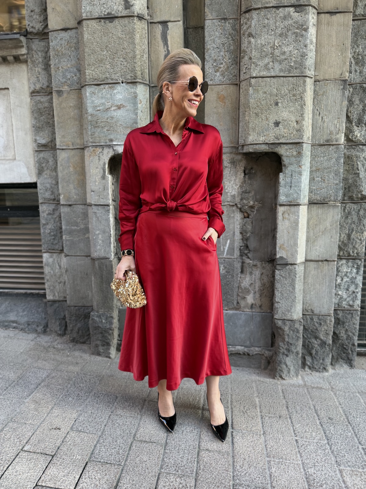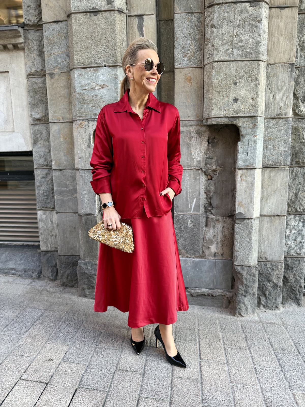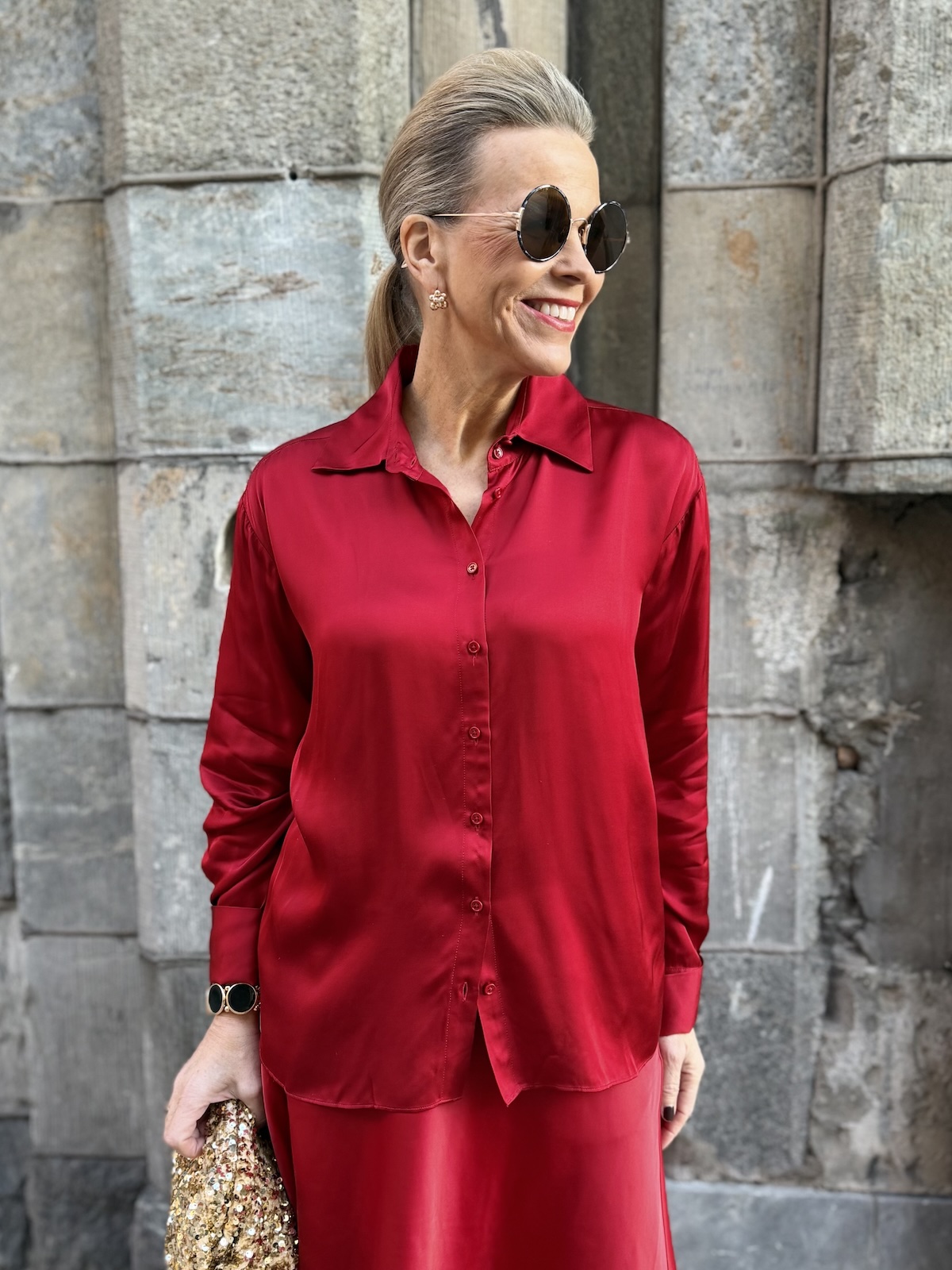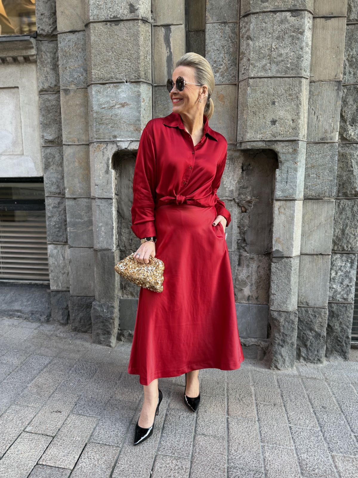 Pauline on kaunis viskoosipaitapusero. Paidassa on kaulukset ja edessä on napit. Hihat ovat täyspitkät ja hihansuissa on leveät rannekkeet, jotka voi kääntää. Malliltaan paita on suora ja se loppuu lantiolle. Paita on takaa noin 5 cm pidempi kuin edestä. Katalla on paidasta päällä koko 34.