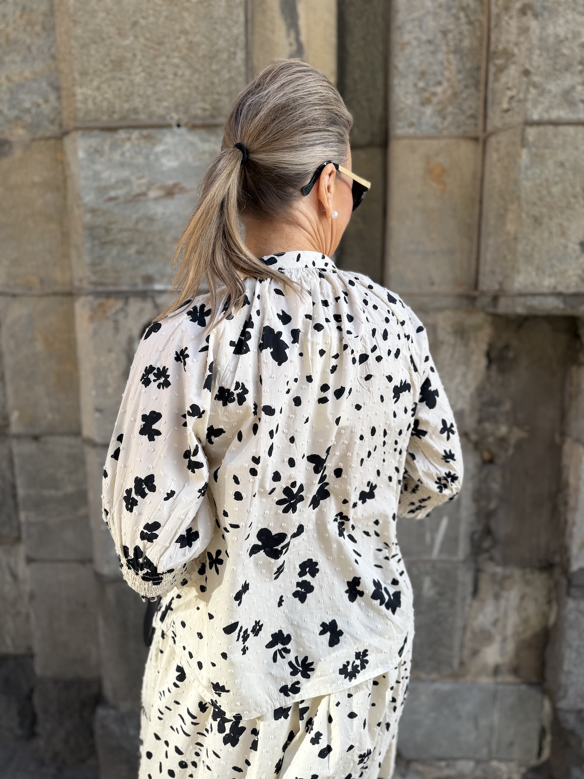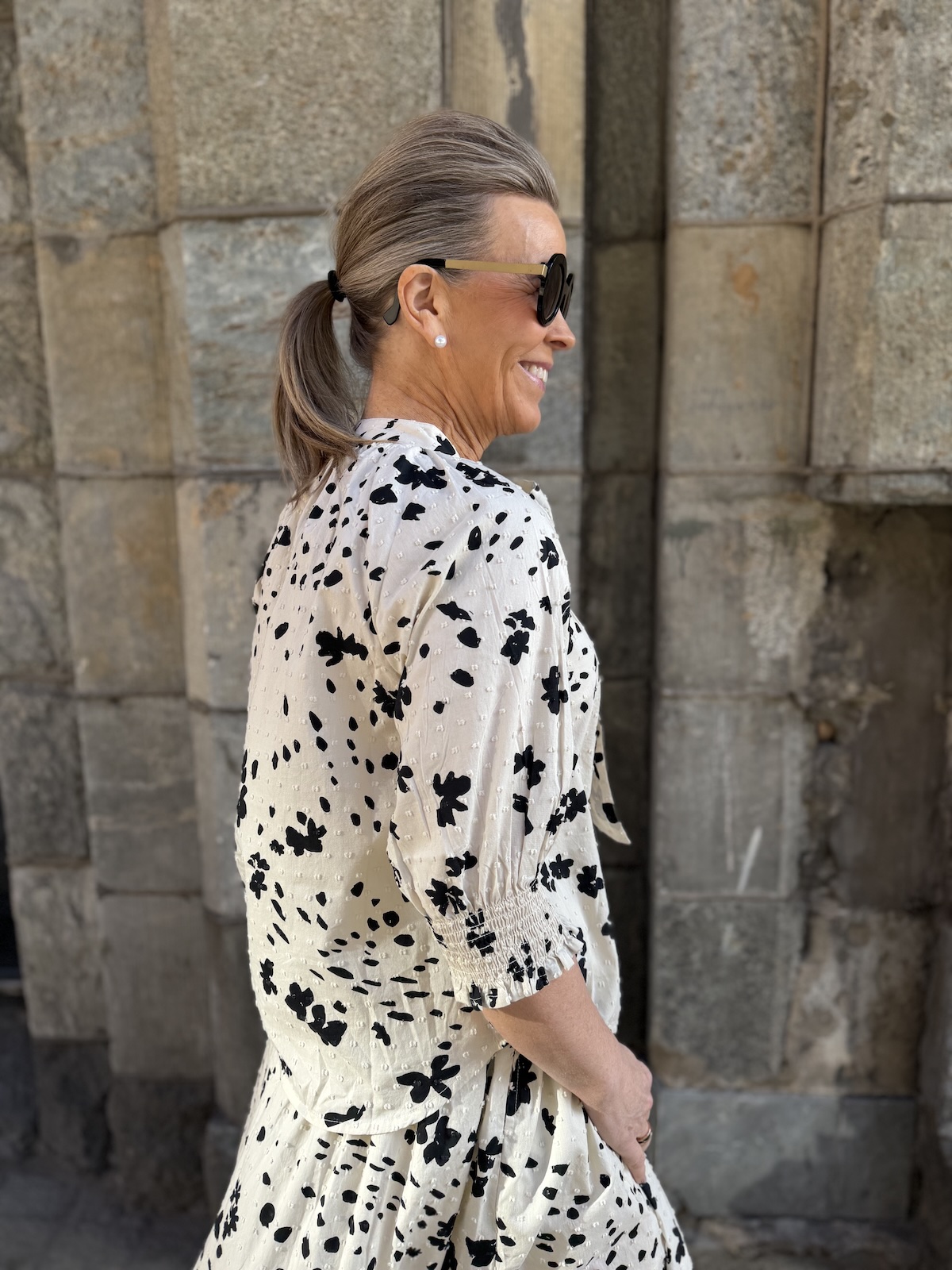 Almera on puuvillainen paita, jonka pinnassa on pientä kohokuviota. paidassa on O-kaula-aukko, jossa on nauhat. Hihat ovat raglan malliset ja ne loppuvat juuri kyynerpäiden kohdalle. Hihansuissa on leveät kumilanka resorit. Malliltaan paita on suora ja sen helma on kauniisti pyöristetty. Edessä on piilonapitus. Katalla on paidasta päällä koko 34. Paita vastaa normaalia kokoa.