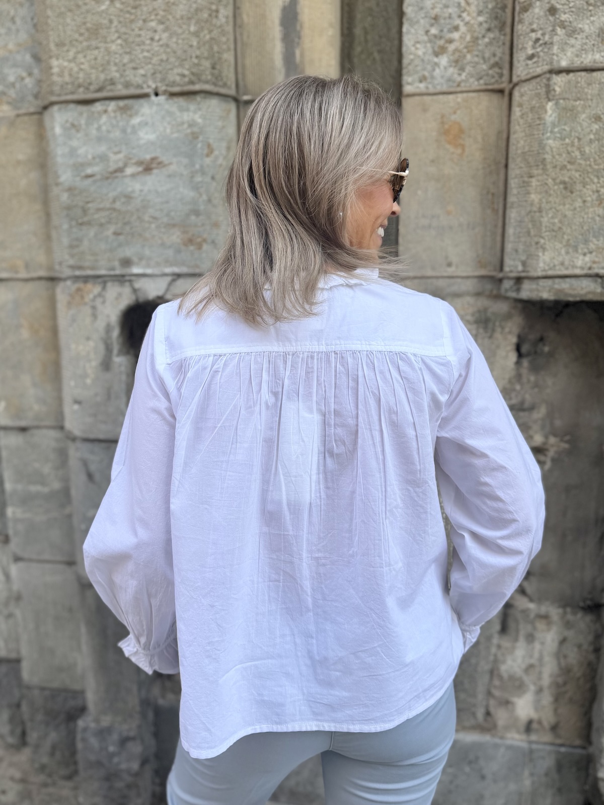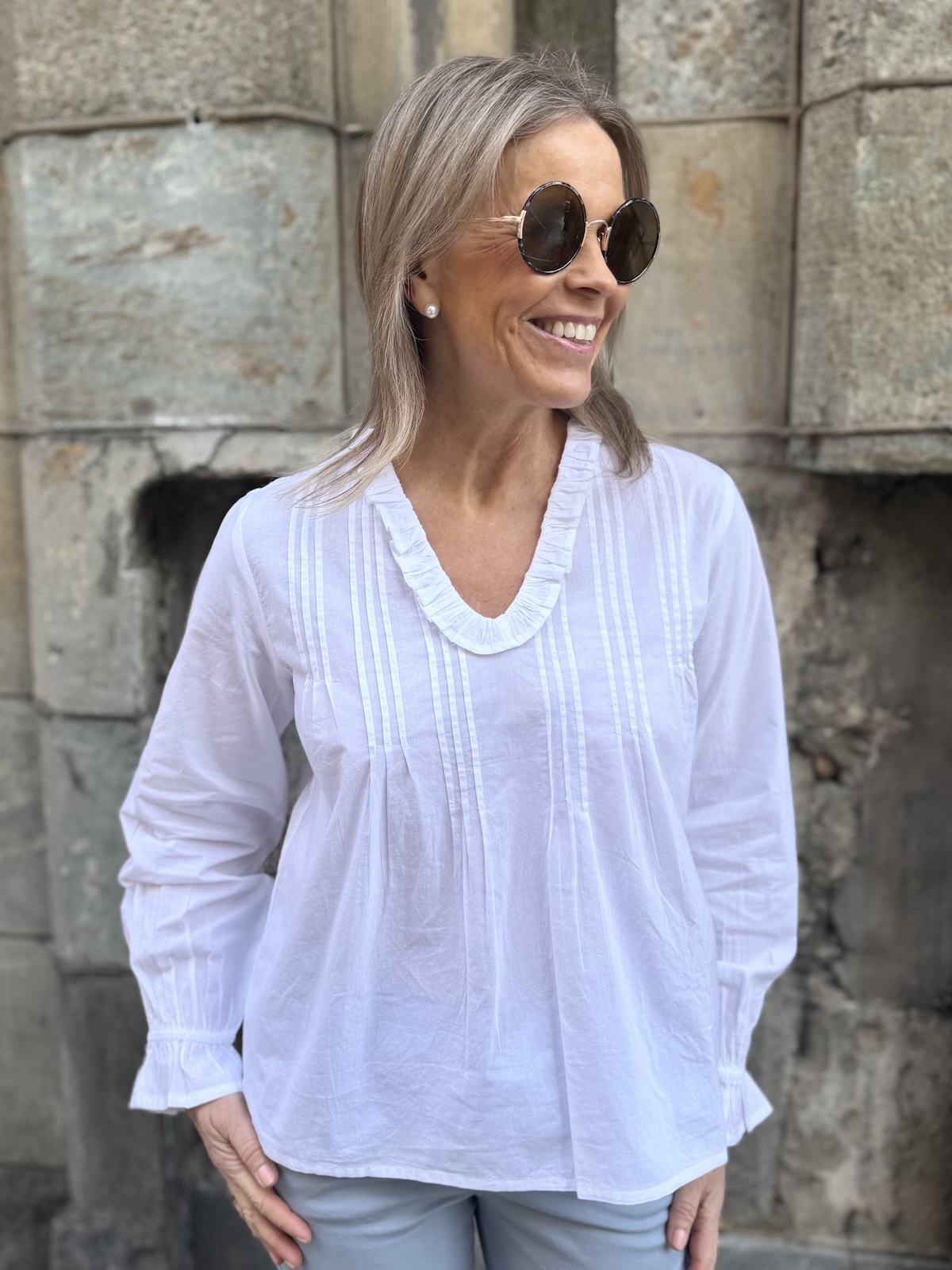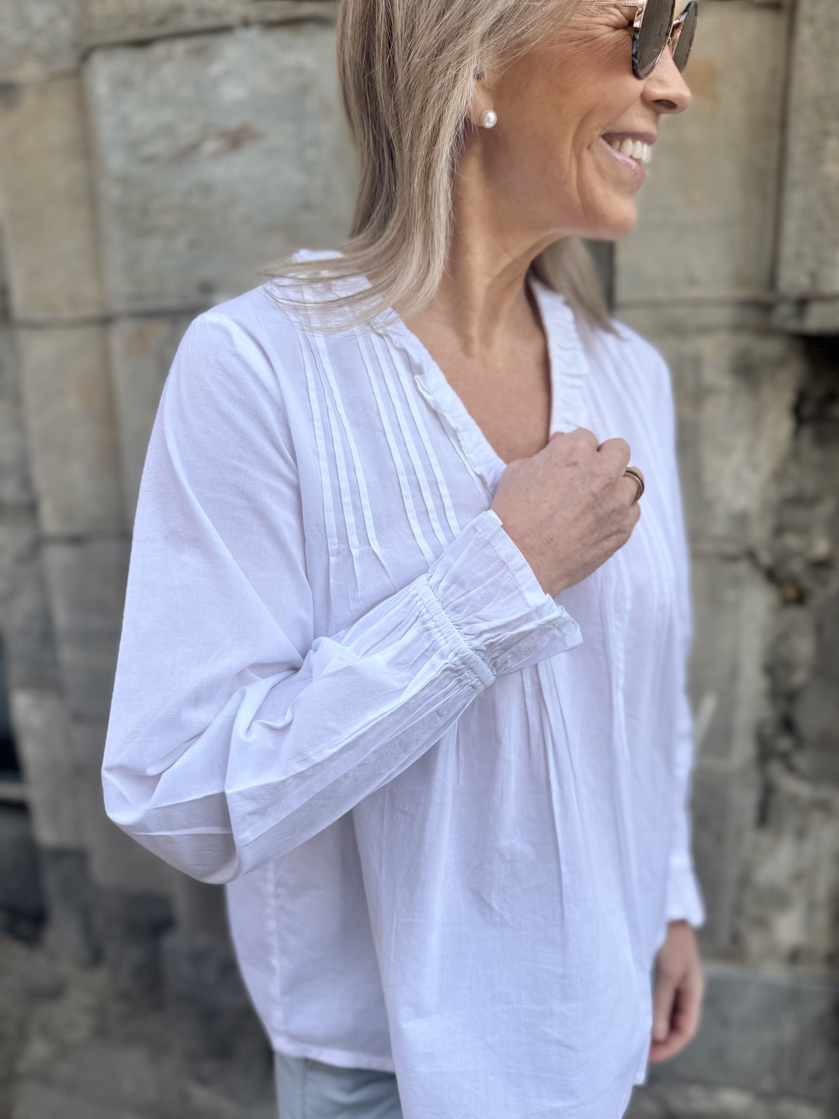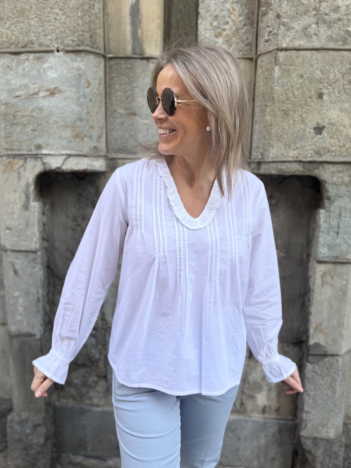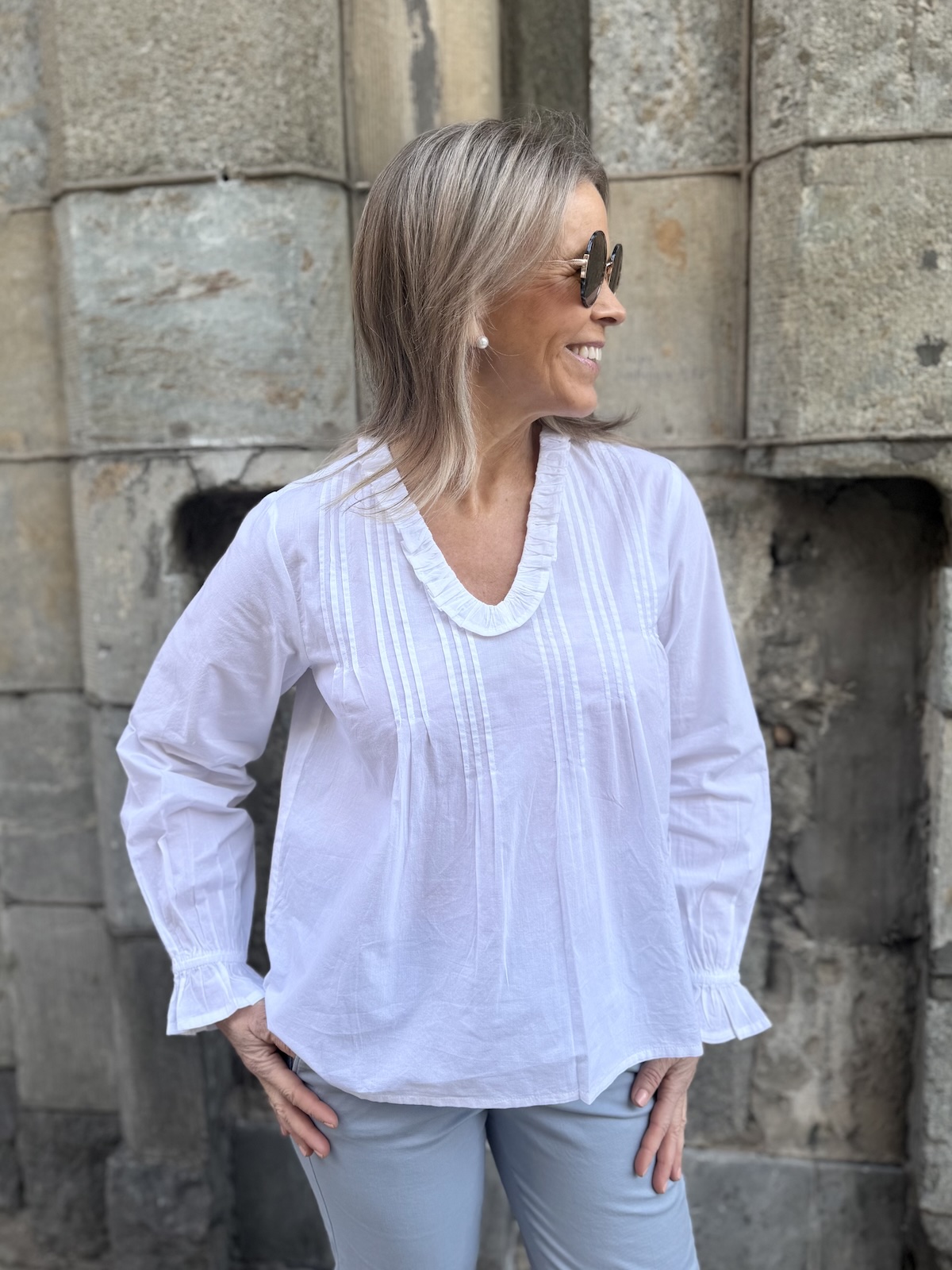 Amilla on ohuehko ja ilmava puuvillapaita, jossa on kaunis V-kaula-aukko. Kaula-aukon reunaa kiertää pieni salsakantti. Edessä on hiuslaskoksia. Hihat ovat pussimaiset ja hihansuissa on kuminauhat ja salsakantti. Paita levenee kevyesti alaspäin ja loppuu lantiolle. Katalla on paidasta päällä koko 34. Paita on reiluhkoa kokoa.