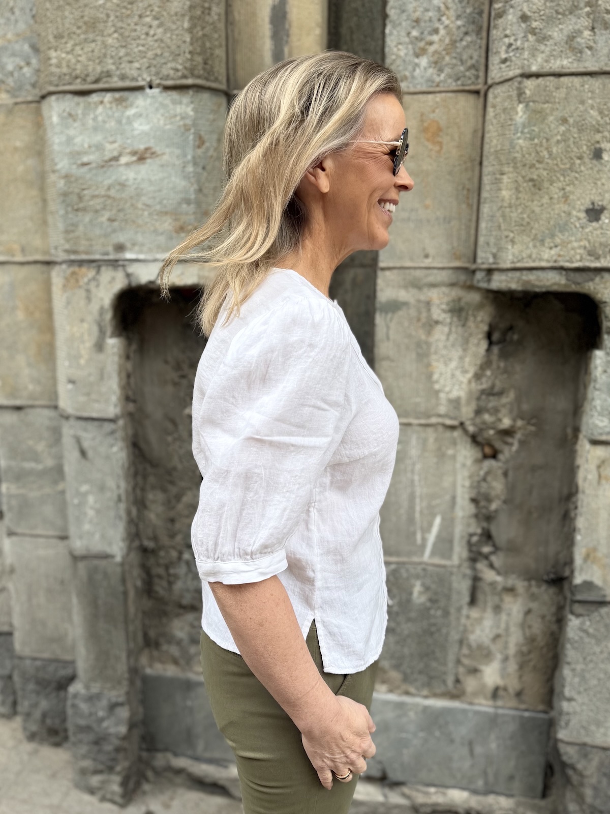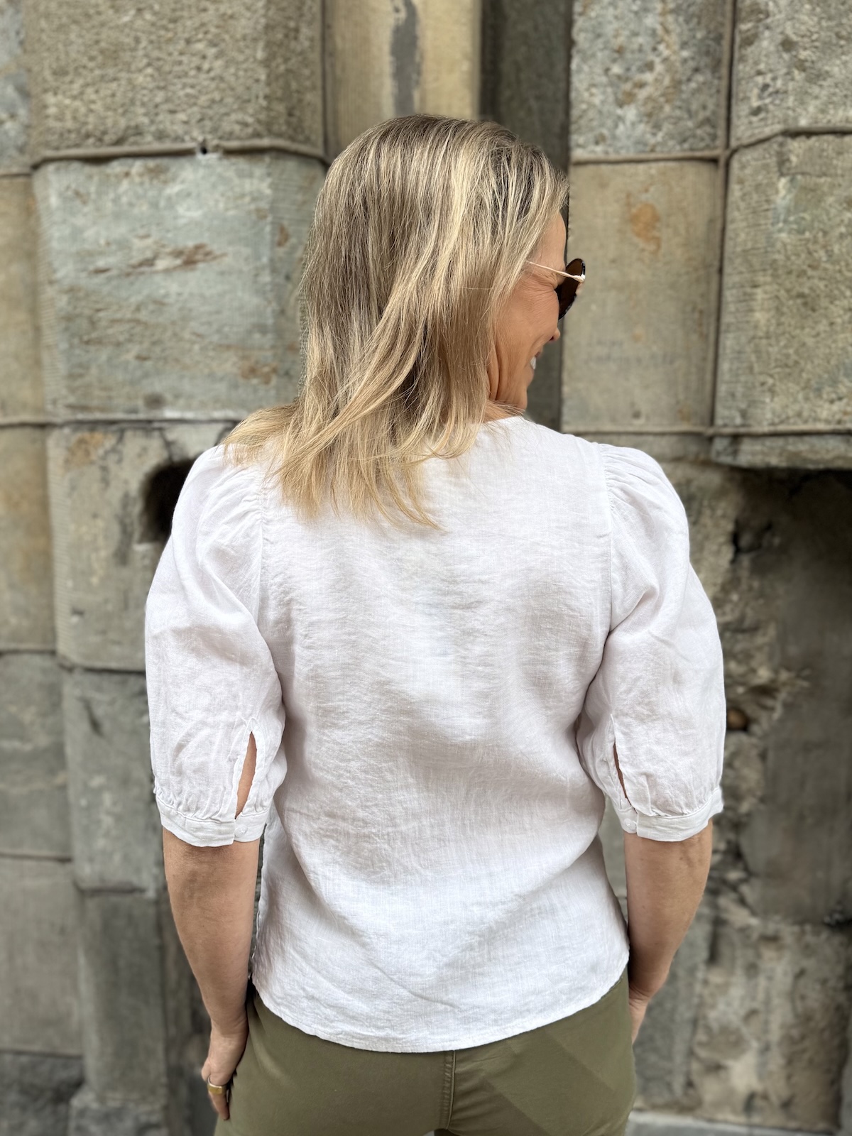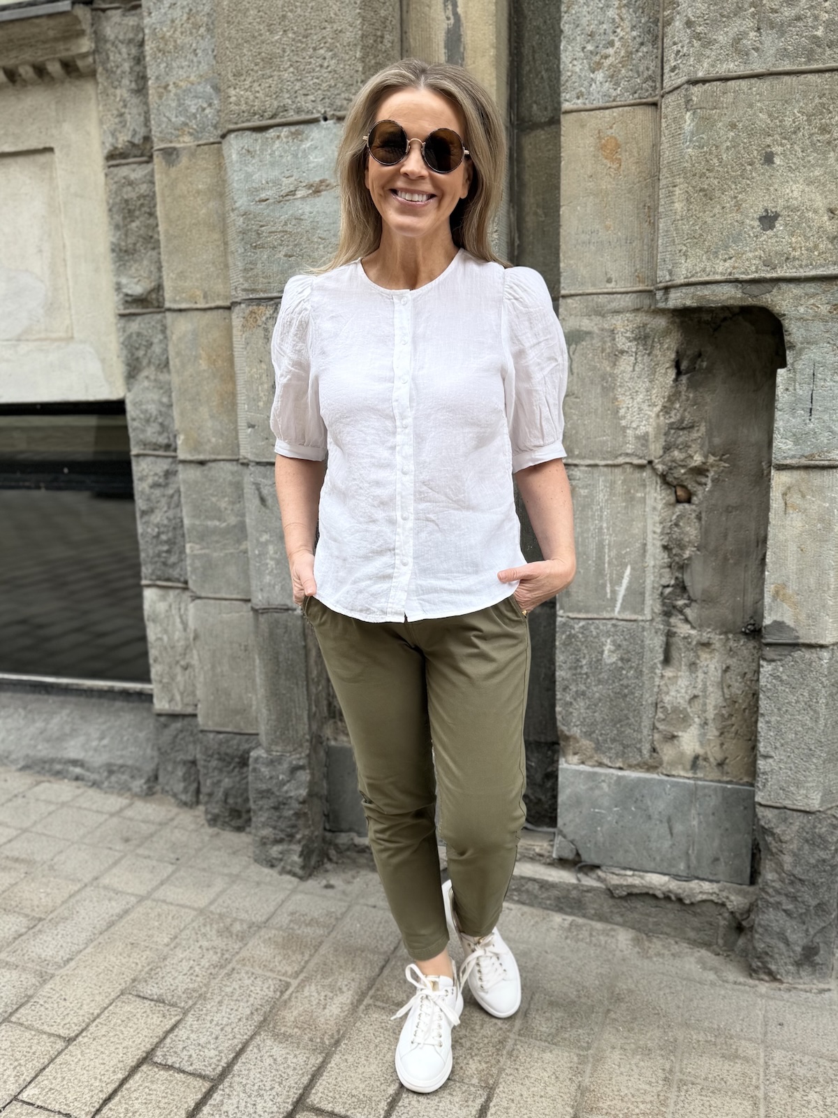 Pellavapaita on söpö. Paidassa on pussimaiset hihat, jotka ylettyvät kyynerpäiden kohdalle. Hihasuissa on kantit. Kaula-aukko on O-mallinen ja edessä on napit. Paita on malliltaan suora ja se ylettyy lantiolle. Katalla on paidasta päällä koko 36. Paita on yhden koon pienempää kokoa kuin normaalisti.