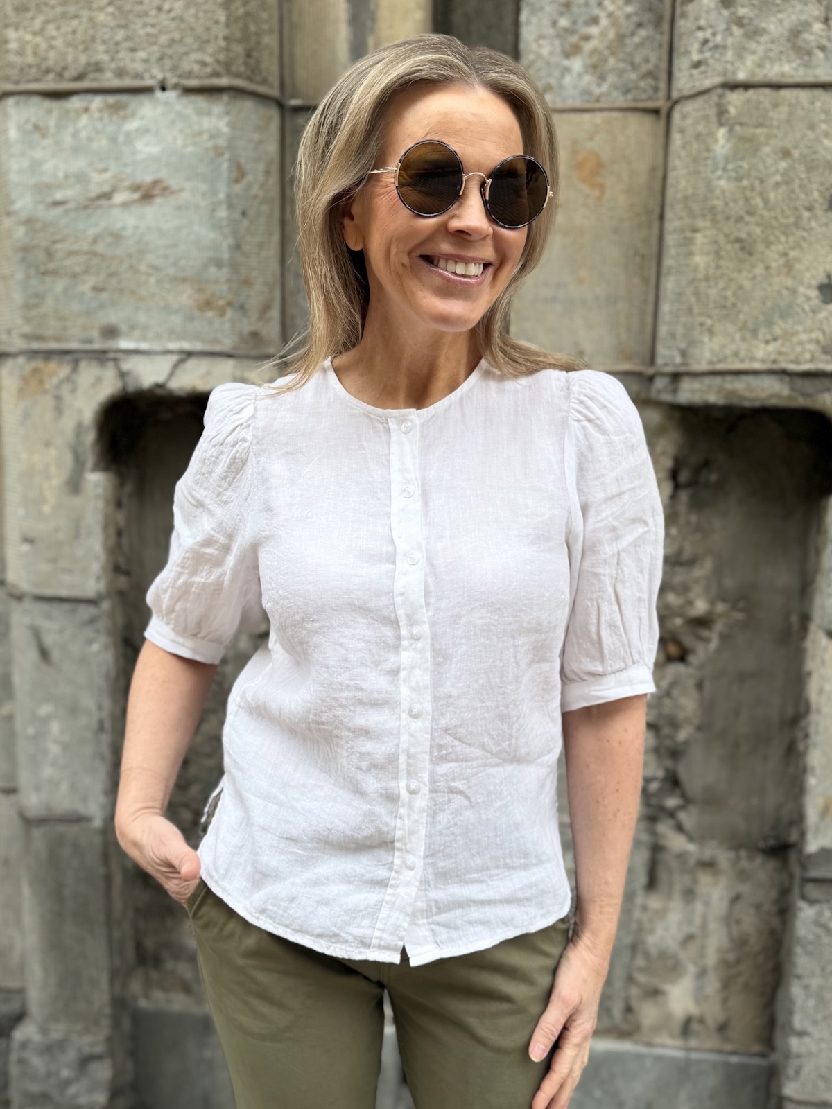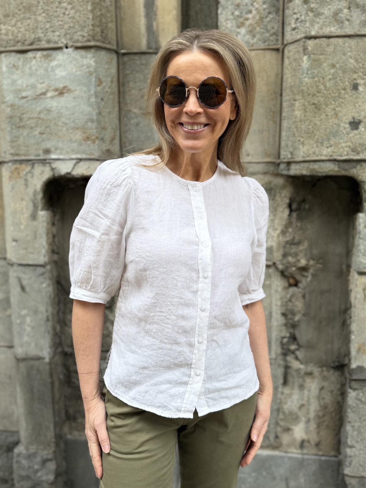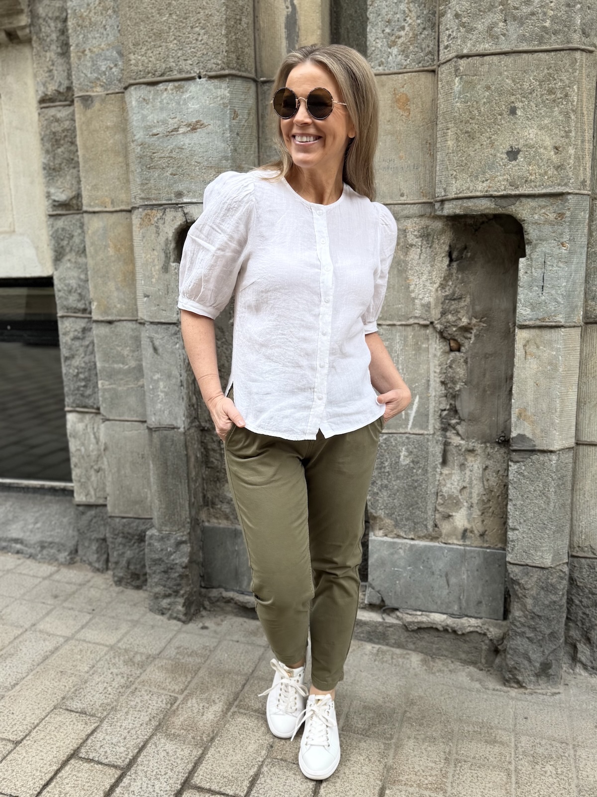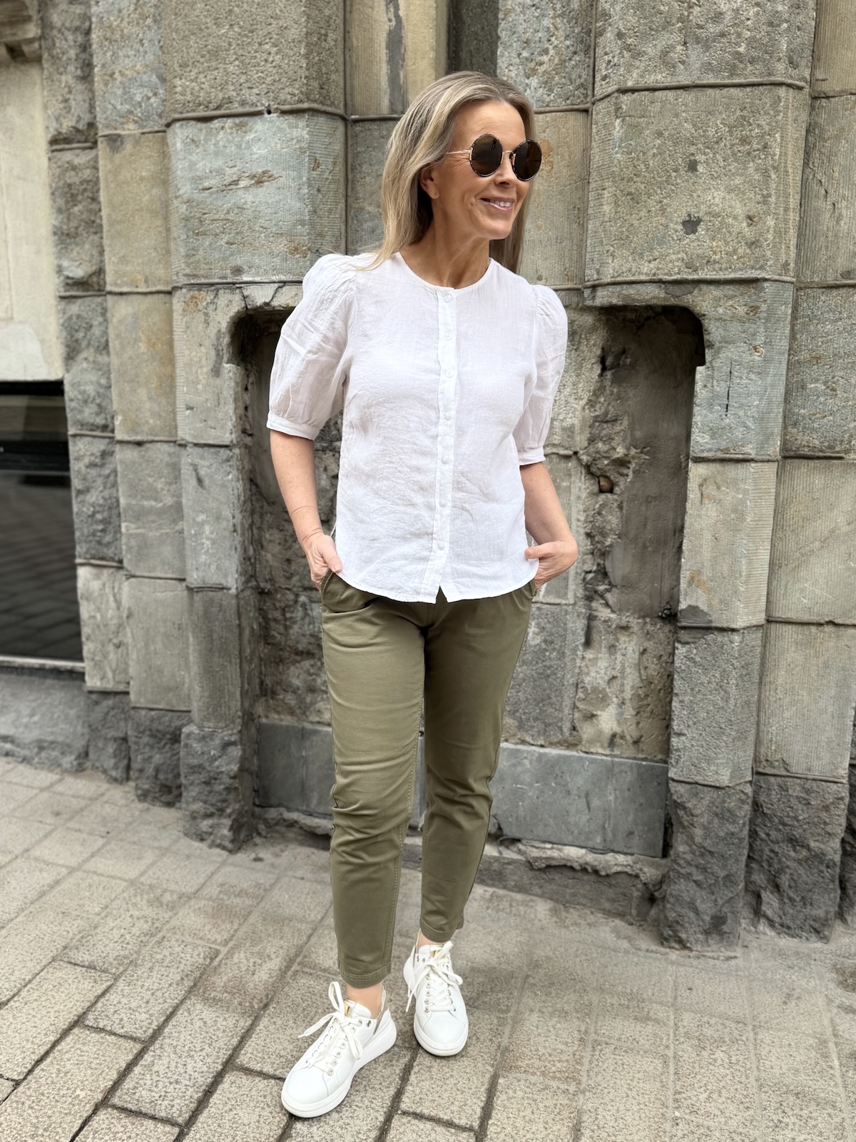 Pellavapaita on söpö. Paidassa on pussimaiset hihat, jotka ylettyvät kyynerpäiden kohdalle. Hihasuissa on kantit. Kaula-aukko on O-mallinen ja edessä on napit. Paita on malliltaan suora ja se ylettyy lantiolle. Katalla on paidasta päällä koko 36. Paita on yhden koon pienempää kokoa kuin normaalisti.