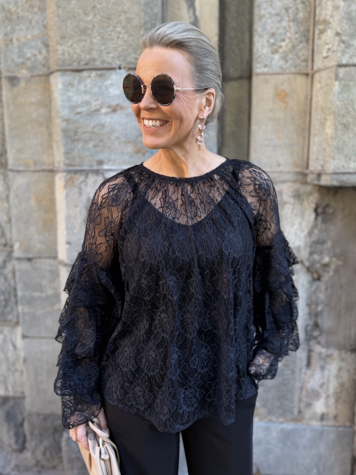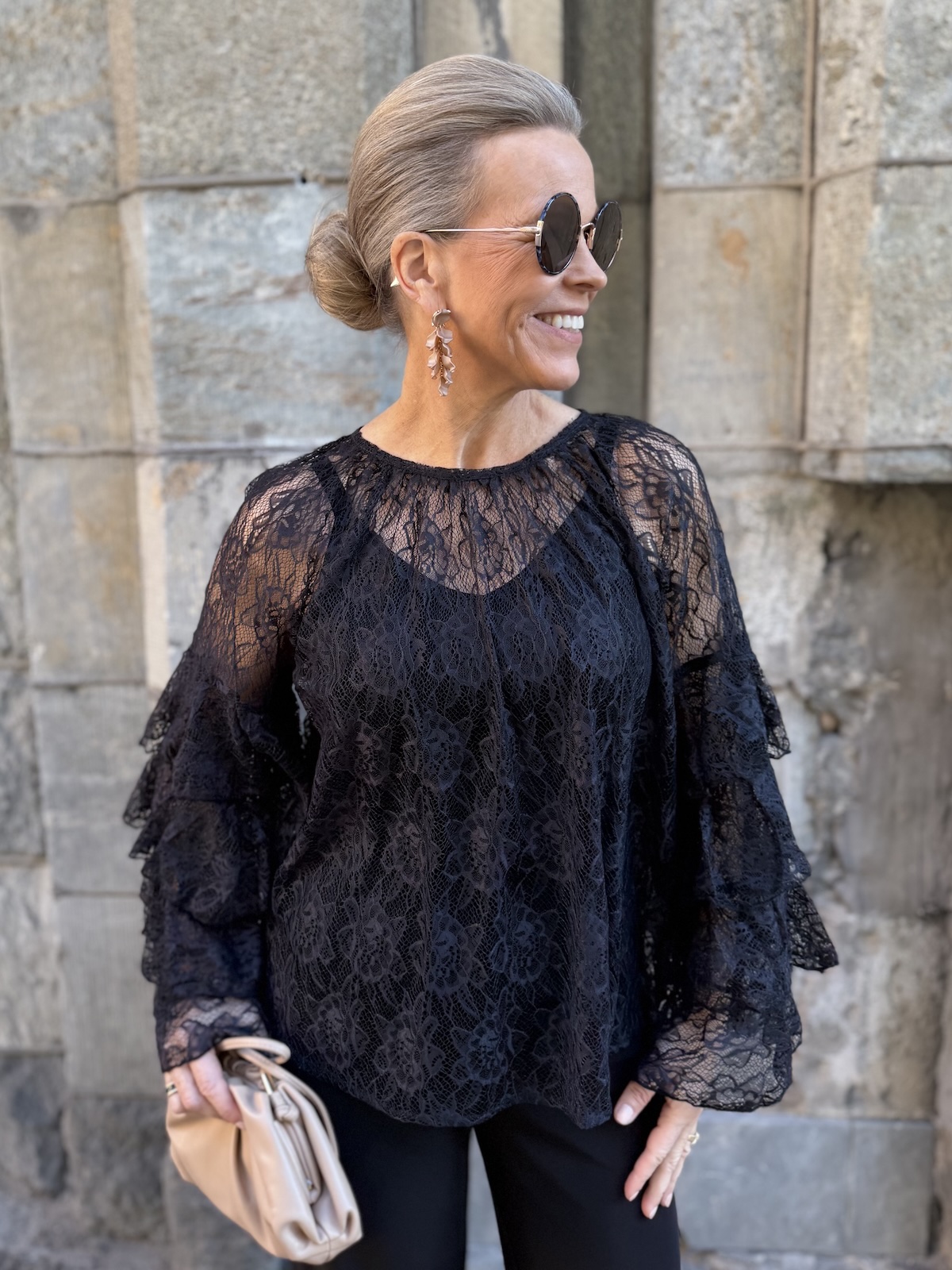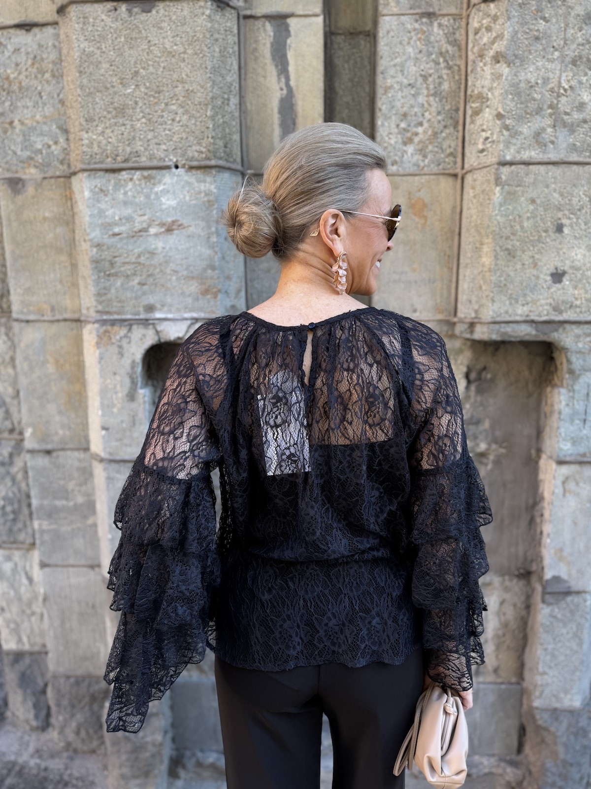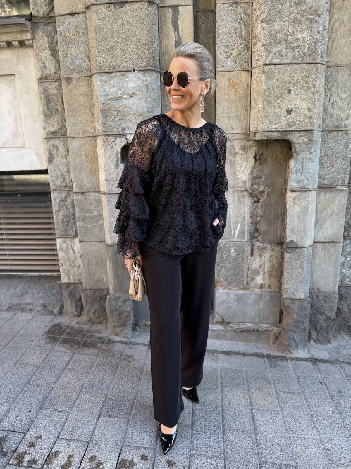 Clemency on näyttävä juhlapaita! Paidassa on pehmoinen pitsikangas, se tuntuu hyvältä iholla. Paidassa on O-kaula-aukko ja upeat hihat. Hihoissa on pitsifrillakantteja. Malliltaan paita levenee kevyesti alaspäin ja loppuu lantiolle. Paita on läpikuultava ja paidan alla on musta Hydda toppi. Katalla on paidasta päällä koko XS. Paita on reilua kokoa eli suosittelemme siitä yhtä kokoa pienempää kokoa kuin normaalisti käyttää. Paidan voi pukea myös alaosan sisälle.