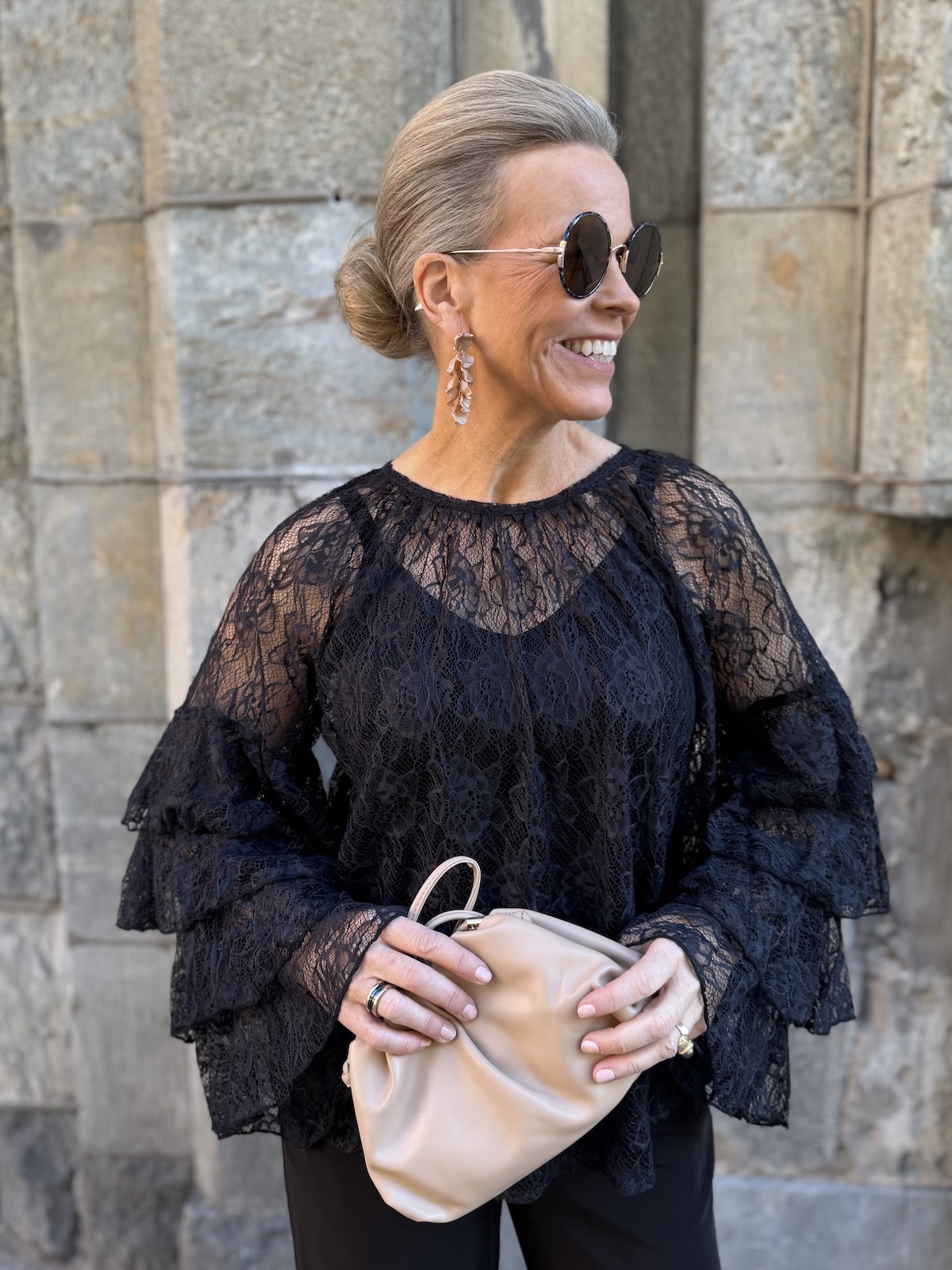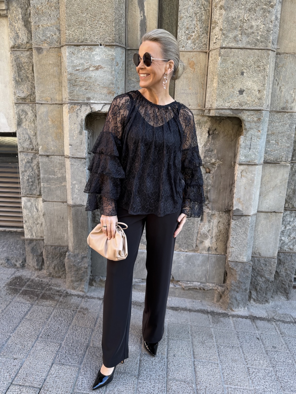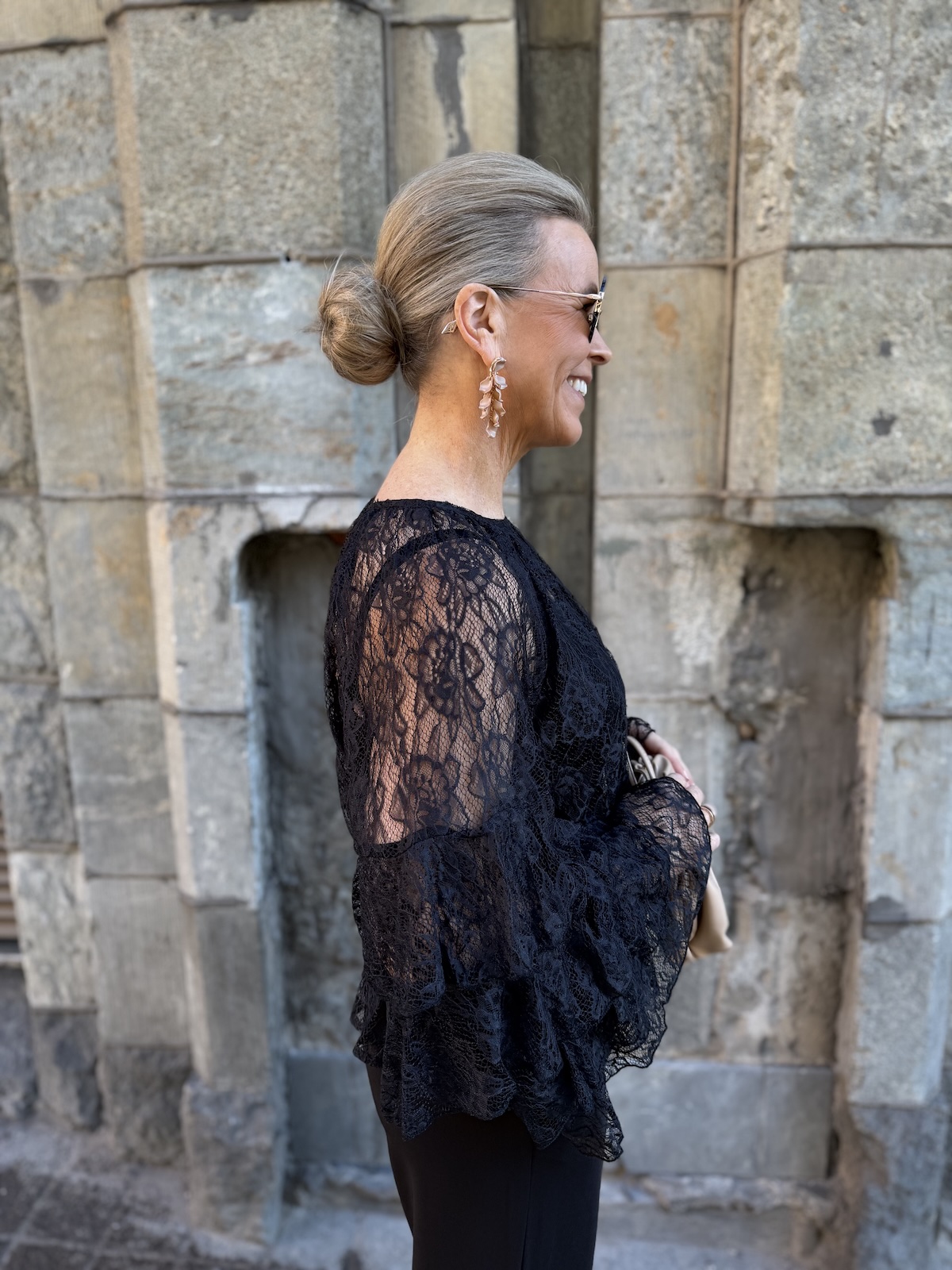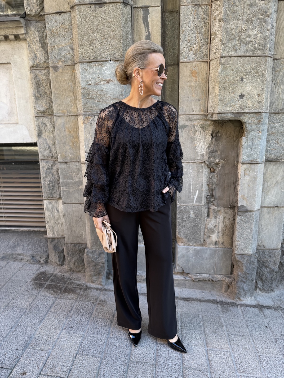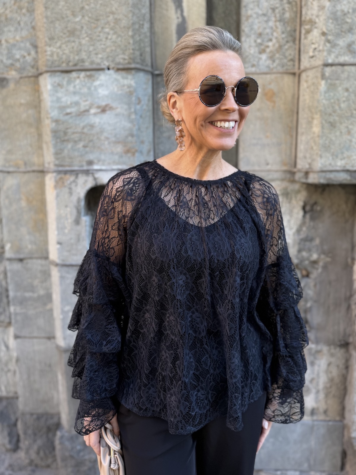Clemency on näyttävä juhlapaita! Paidassa on pehmoinen pitsikangas, se tuntuu hyvältä iholla. Paidassa on O-kaula-aukko ja upeat hihat. Hihoissa on pitsifrillakantteja. Malliltaan paita levenee kevyesti alaspäin ja loppuu lantiolle. Paita on läpikuultava ja paidan alla on musta Hydda toppi. Katalla on paidasta päällä koko XS. Paita on reilua kokoa eli suosittelemme siitä yhtä kokoa pienempää kokoa kuin normaalisti käyttää. Paidan voi pukea myös alaosan sisälle.