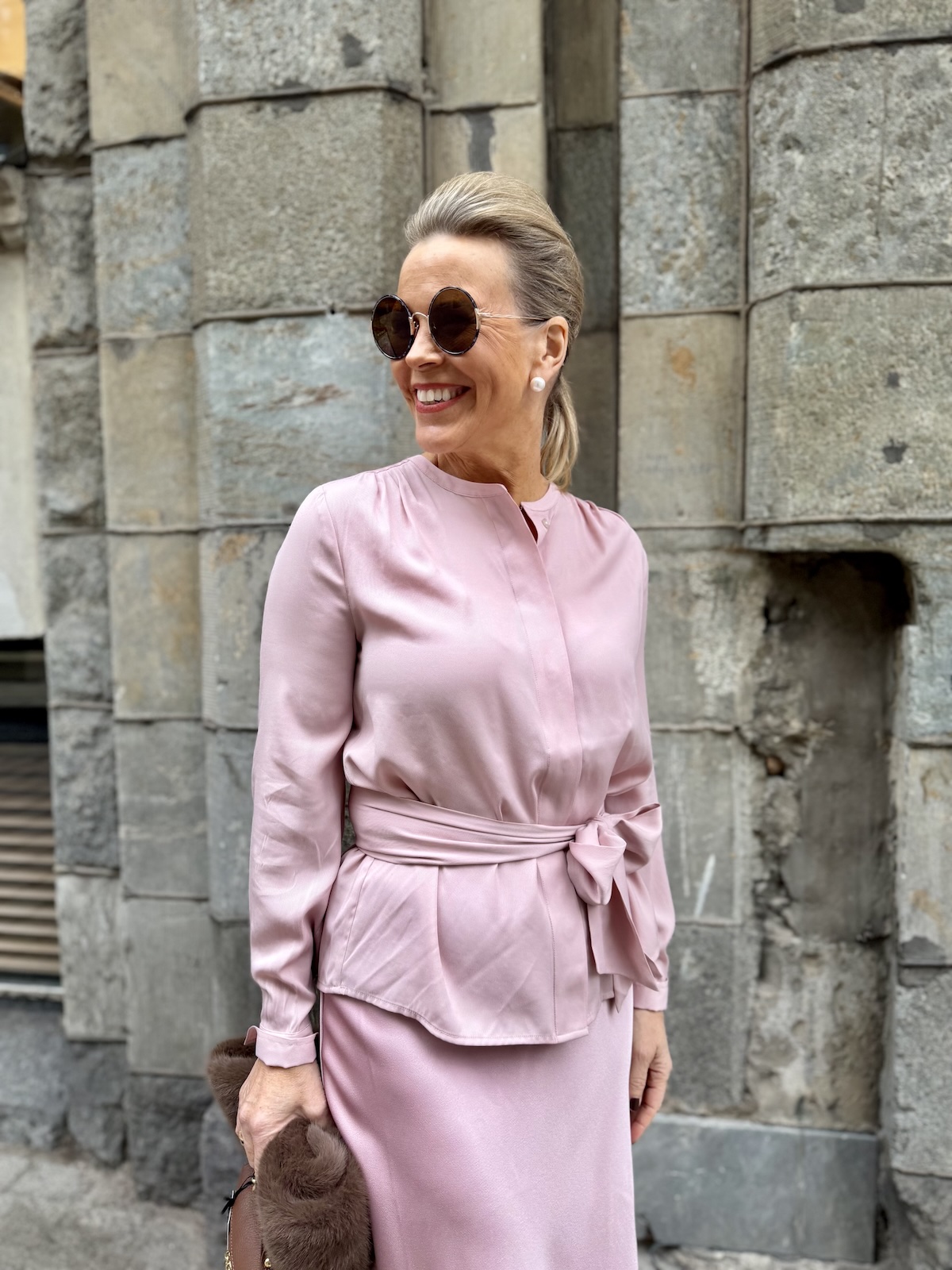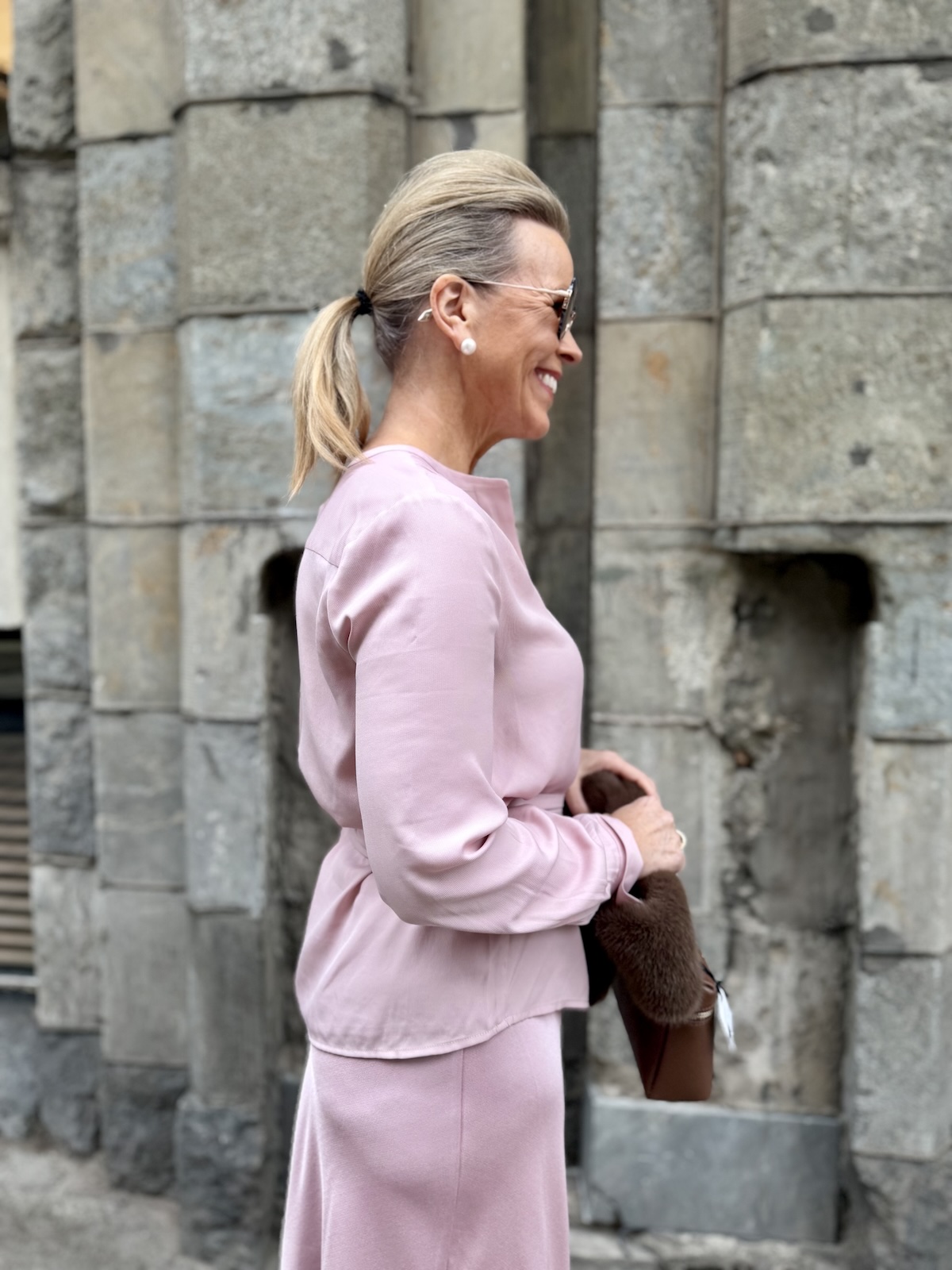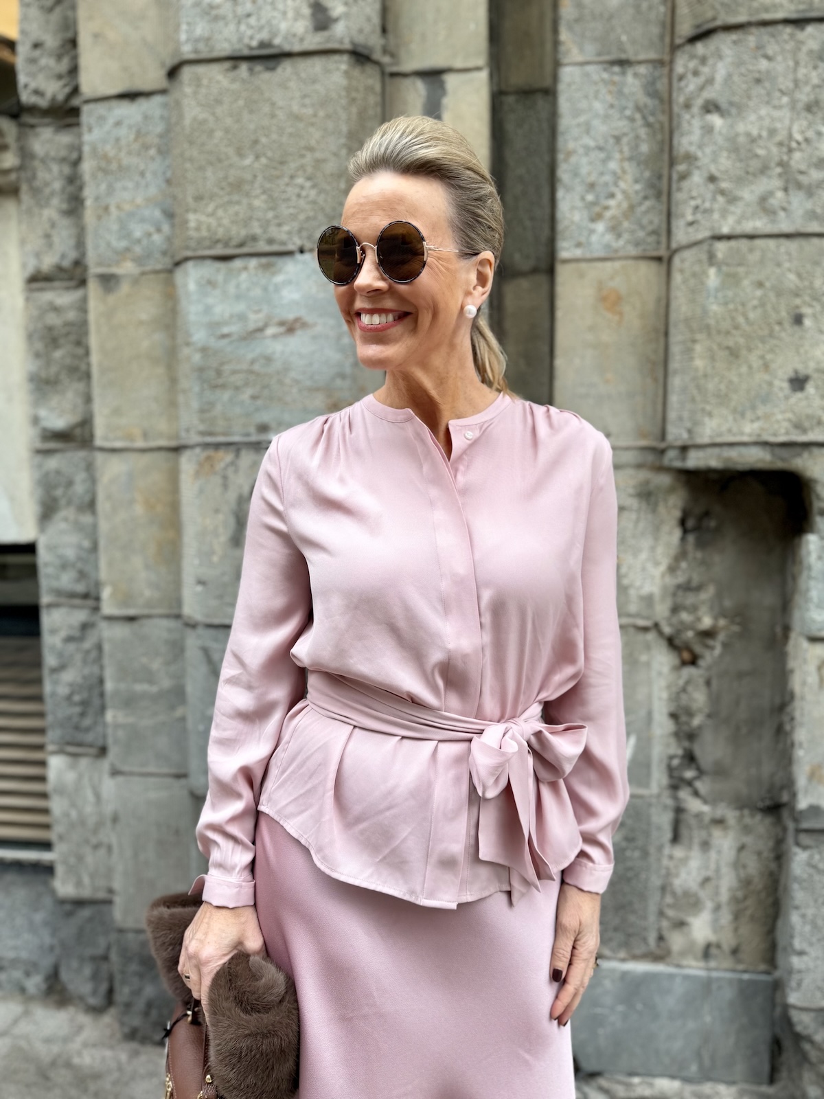 Gennifer paita on super kaunis ja väri täydellinen! Paidassa on O-kaula-aukko ja edessä on piilonapitus eli paidan saa kokonaan auki. Hihat ovat täyspitkät ja hihansuissa on rannekkeet napeilla. Malliltaan paita on suora ja se loppuu lantiolle. Paitaan kuuluu leveä nauha, jonka voi sitoa vyötärölle tai kaulaan useallakin eri tavalla. Katalla on paidasta päällä koko 34.