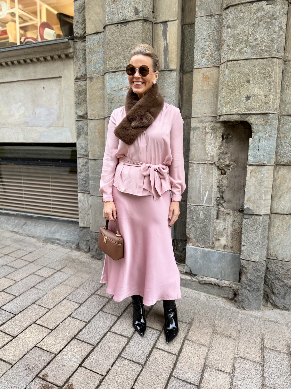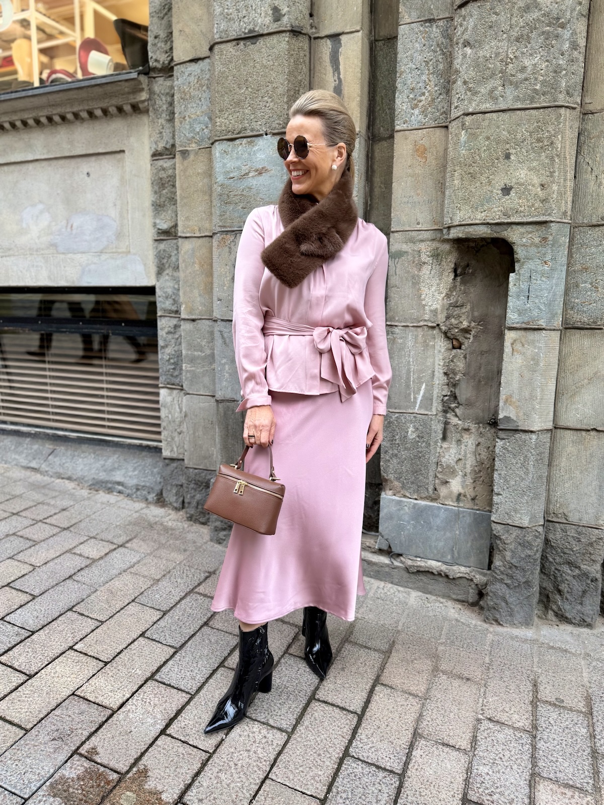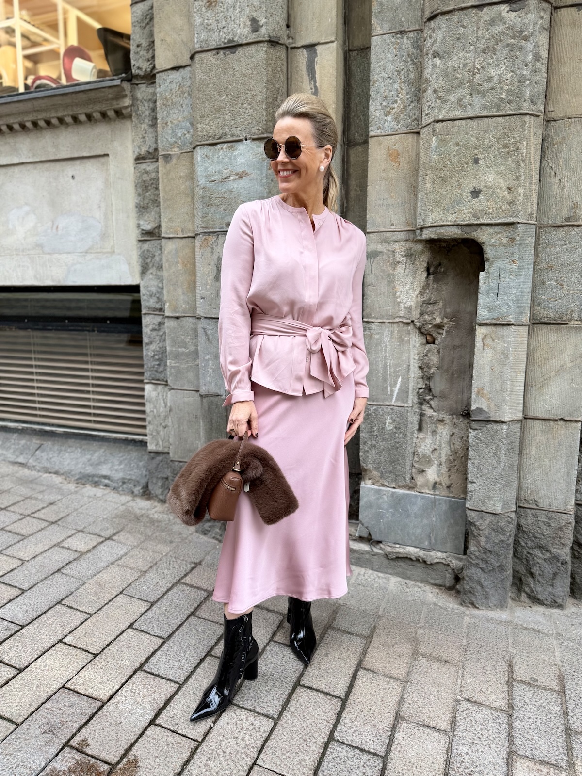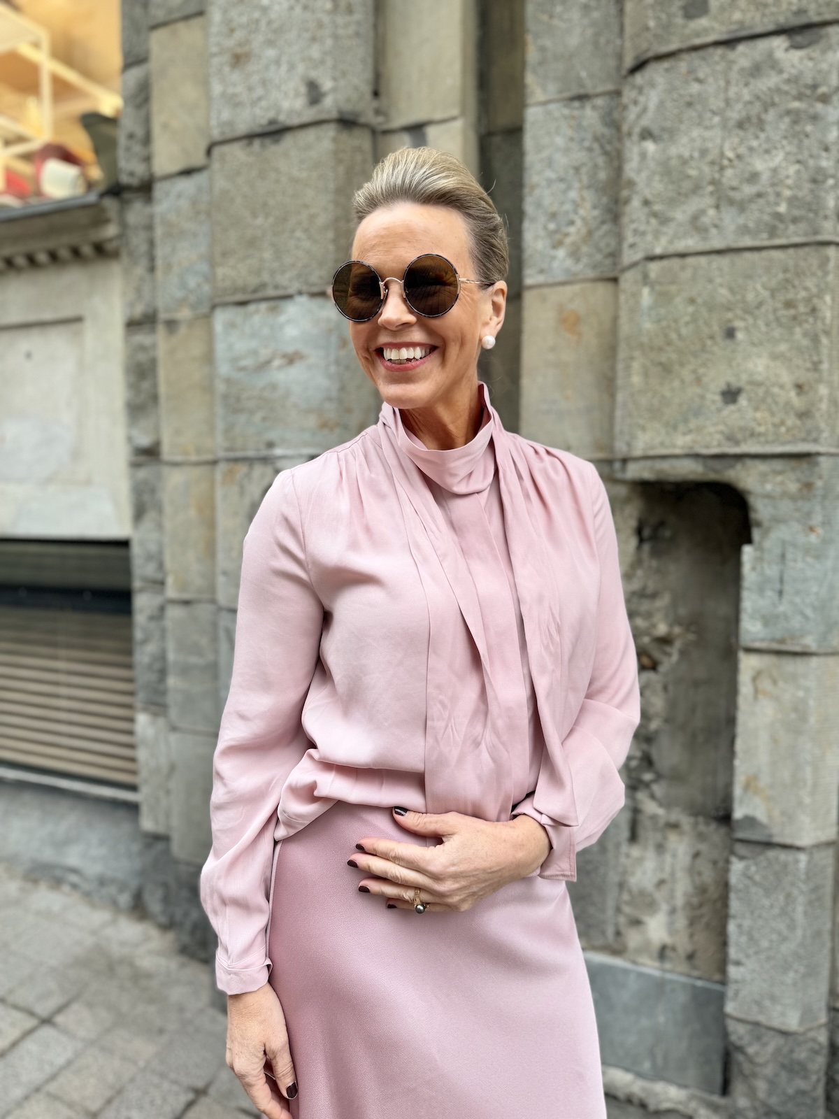Gennifer paita on super kaunis ja väri täydellinen! Paidassa on O-kaula-aukko ja edessä on piilonapitus eli paidan saa kokonaan auki. Hihat ovat täyspitkät ja hihansuissa on rannekkeet napeilla. Malliltaan paita on suora ja se loppuu lantiolle. Paitaan kuuluu leveä nauha, jonka voi sitoa vyötärölle tai kaulaan useallakin eri tavalla. Katalla on paidasta päällä koko 34.