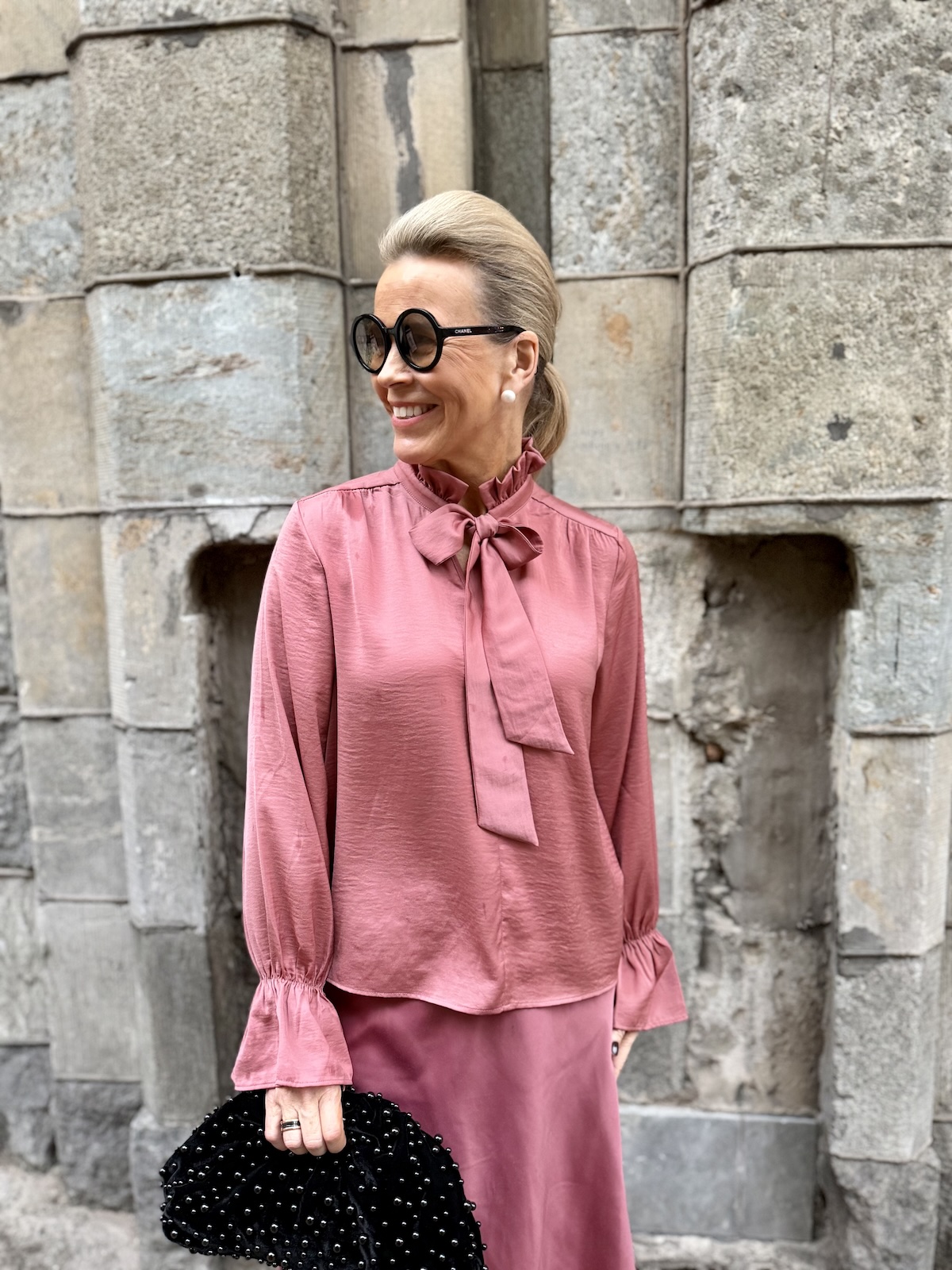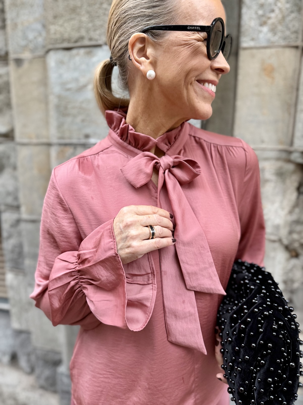 Gracie röyhelöpaita on super söpö. Paidassa on pystykaulus ja sen reunaa kiertää pieni salsakantti. Edessä on V-kaula-aukko ja kaula-aukossa on nauhat. Hihat ovat hieman pussimaiset ja hihoissa on kuminauha ja salsakantti. Paita levenee aavistuksen alaspäin ja se loppuu lantiolle. Helma on minimaalisesti pyöristetty. Katalla on paidasta päällä koko 34. Paita on reiluhkoa kokoa.