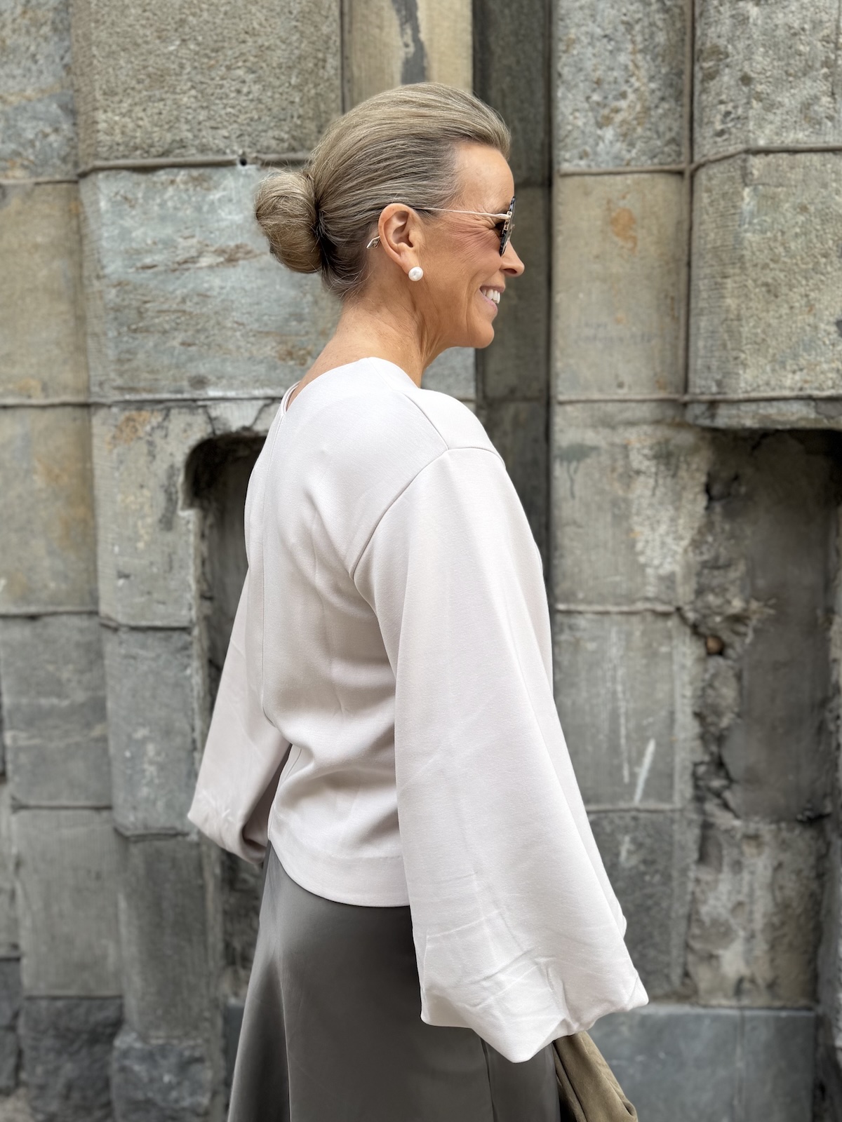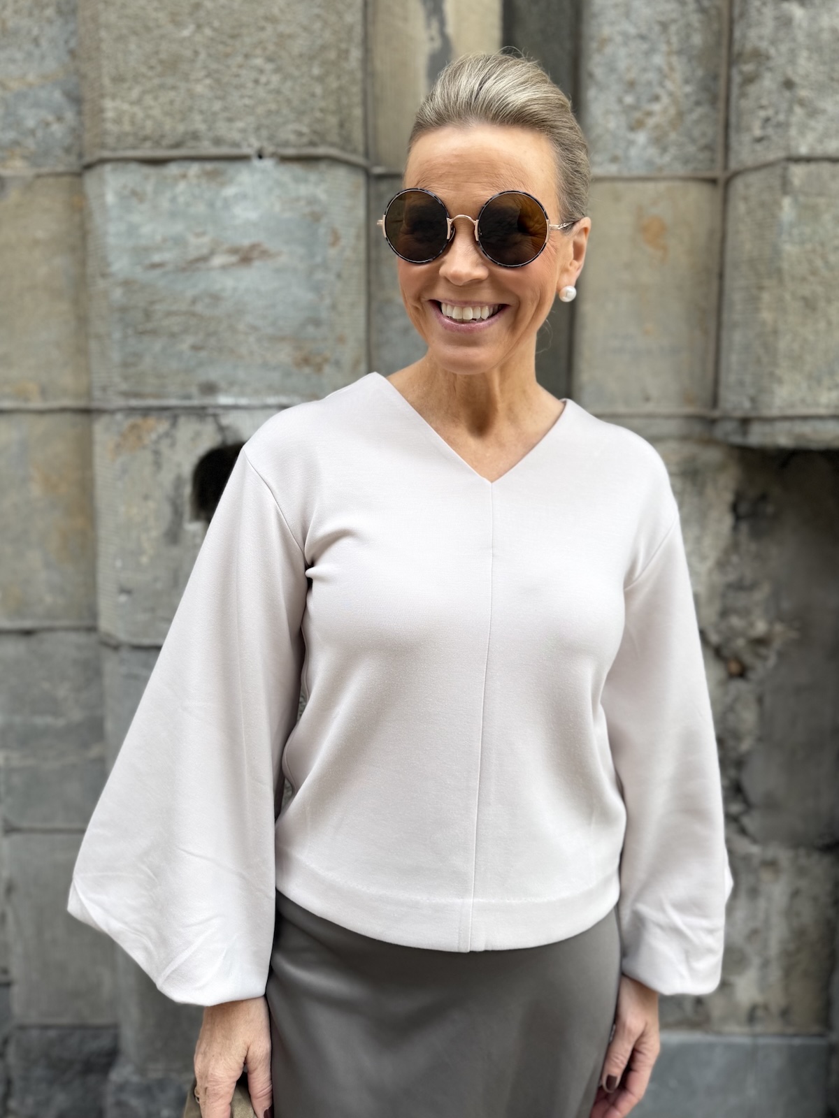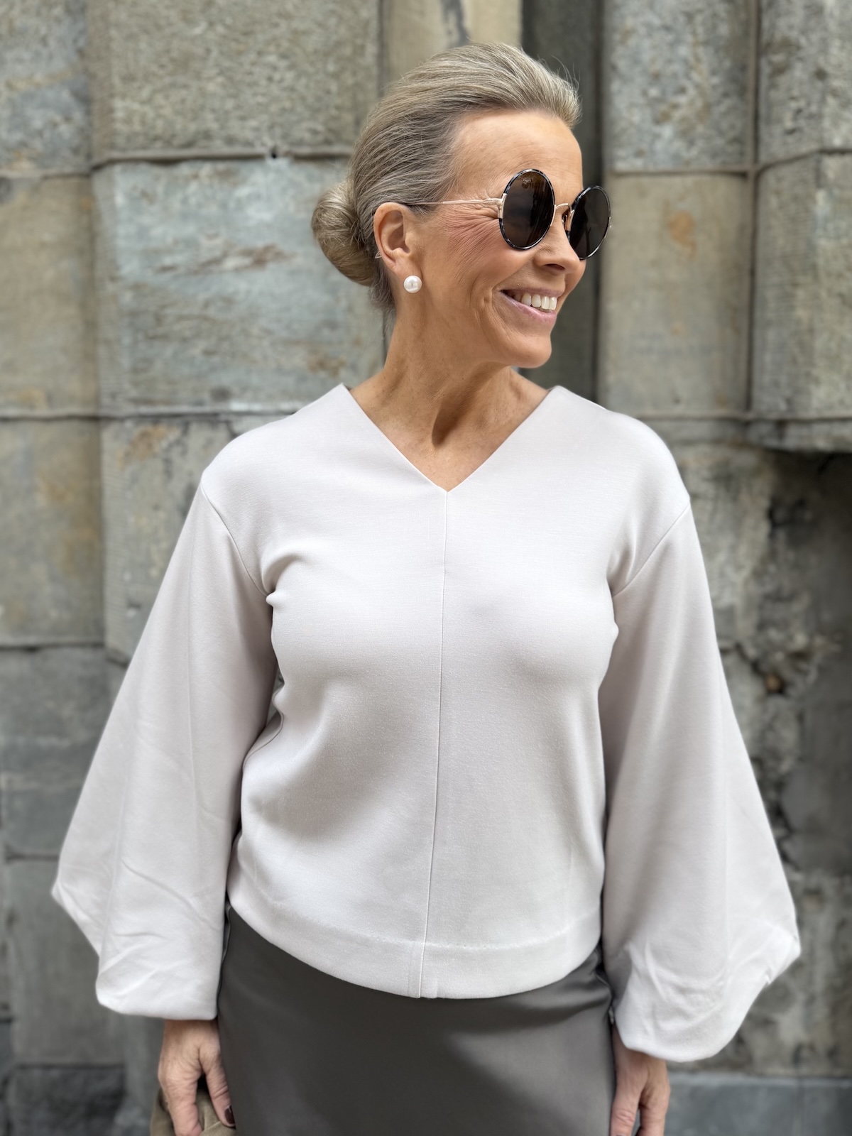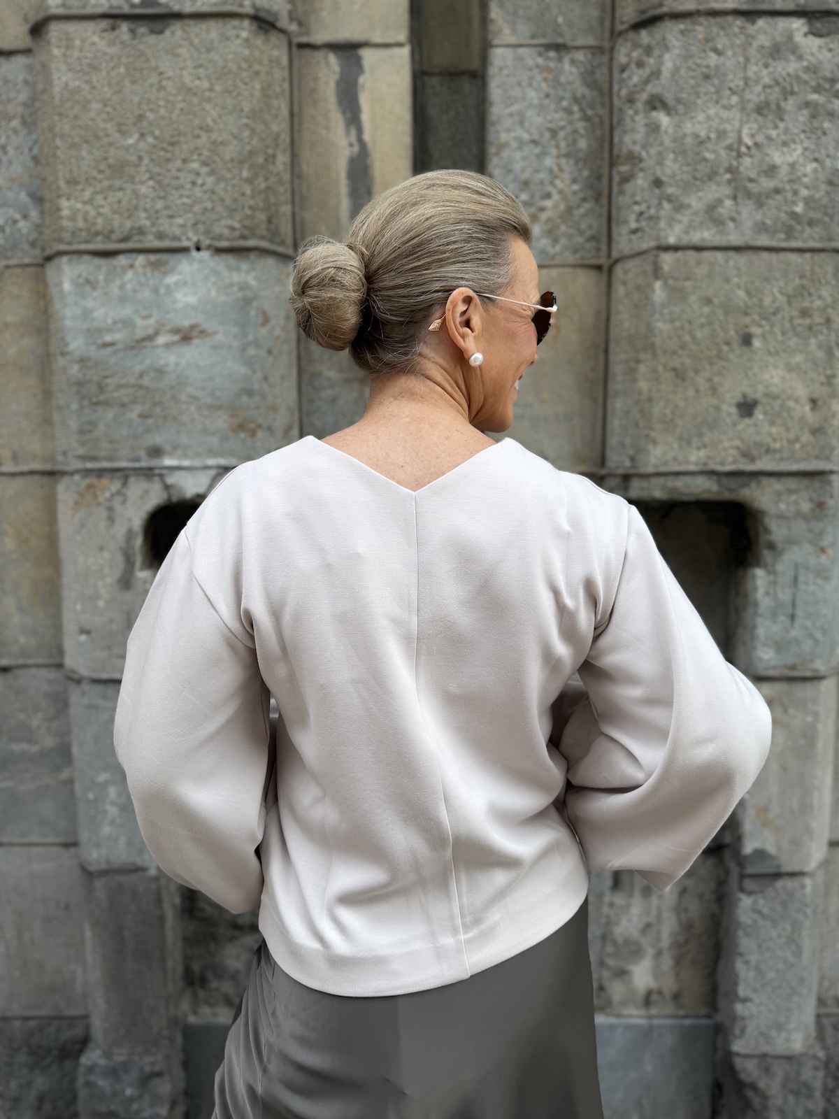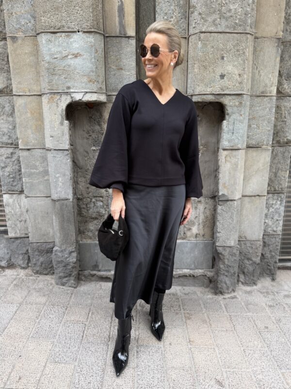 Kincent paita kuuluu ihanaan ”pumpulia iholle” olevaan sarjaan. Paidan edessä on V-aukko ja myös takana on V-aukko. Takana oleva v-aukko on pienempi kuin edessä oleva kaulus. Hihat ovat hauskat, ne levenevät alaspäin ja hihat on käännetty sisälle päin ja niissä on vuori. Näin ne ovat pussimaiset ja hieman vajaamittaiset. malliltaan paita on suora (rinninaympärys ja lantionympärys ovat yhtä leveät) ja se loppuu lonkkaluiden alapuolelle. Helmassa on leveä kantti. Katalla on paidasta päällä koko XS.