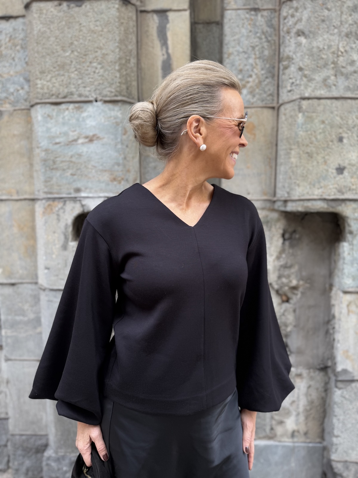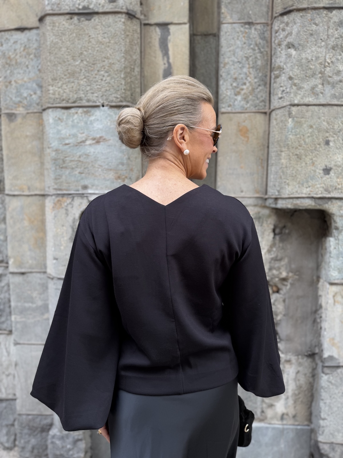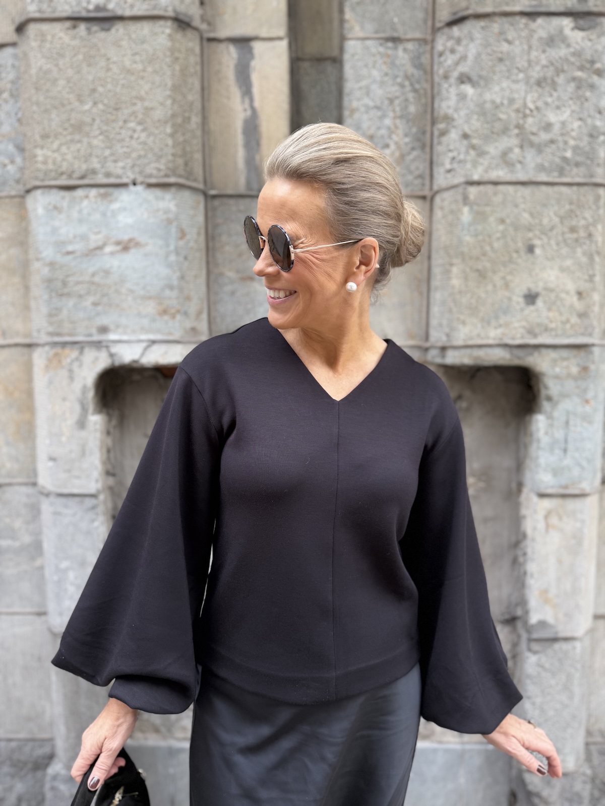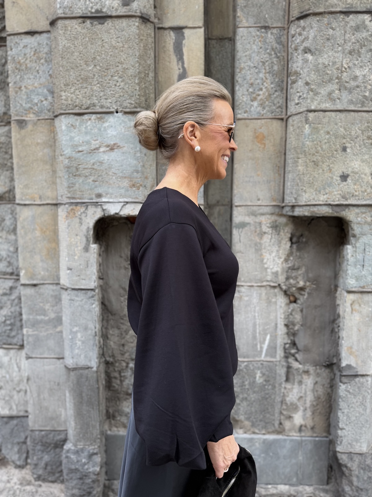 Kincent paita kuuluu ihanaan ”pumpulia iholle” olevaan sarjaan. Paidan edessä on V-aukko ja myös takana on V-aukko. Takana oleva v-aukko on pienempi kuin edessä oleva kaulus. Hihat ovat hauskat, ne levenevät alaspäin ja hihat on käännetty sisälle päin ja niissä on vuori. Näin ne ovat pussimaiset ja hieman vajaamittaiset. malliltaan paita on suora (rinninaympärys ja lantionympärys ovat yhtä leveät) ja se loppuu lonkkaluiden alapuolelle. Helmassa on leveä kantti. Katalla on paidasta päällä koko XS.