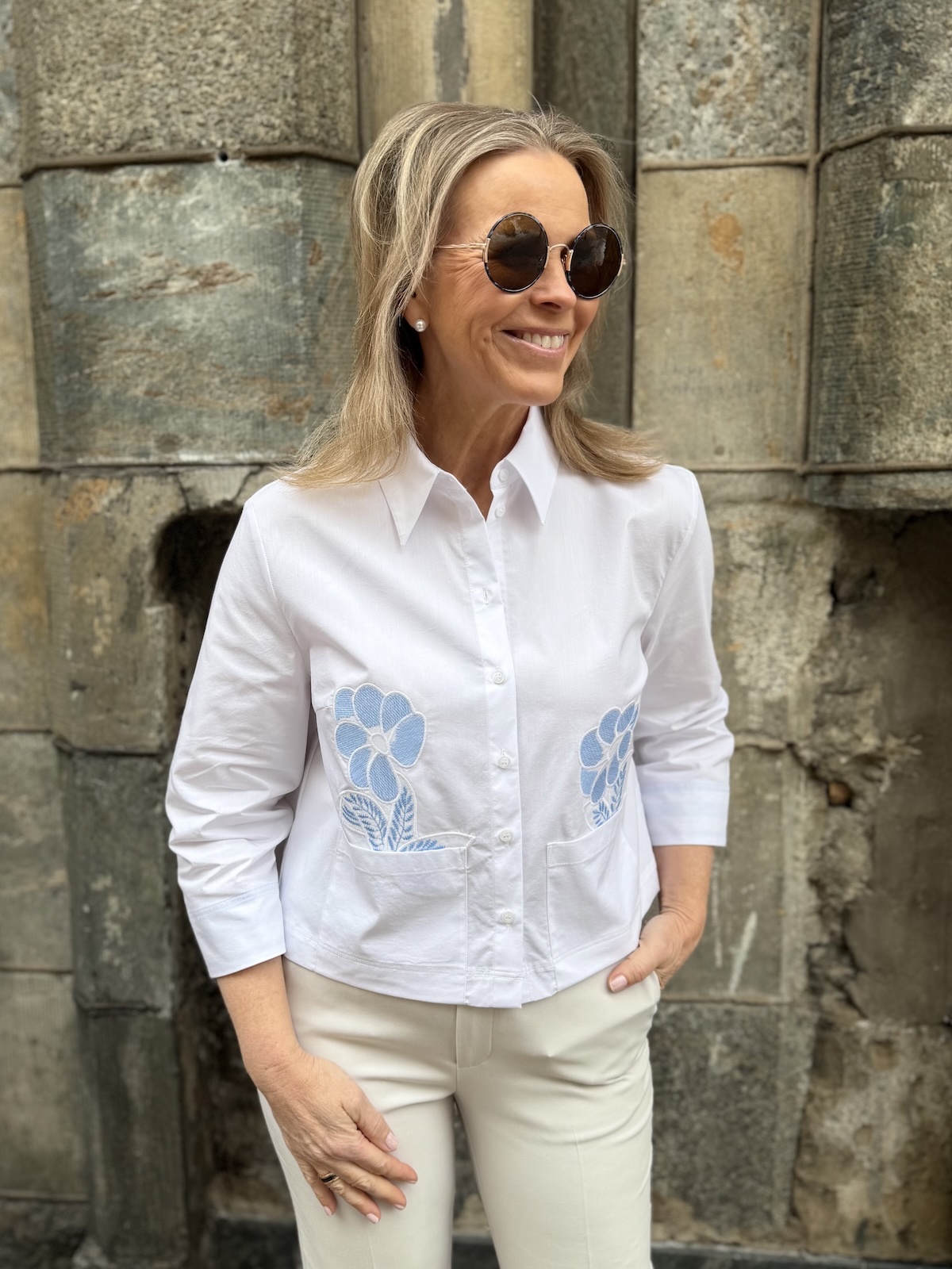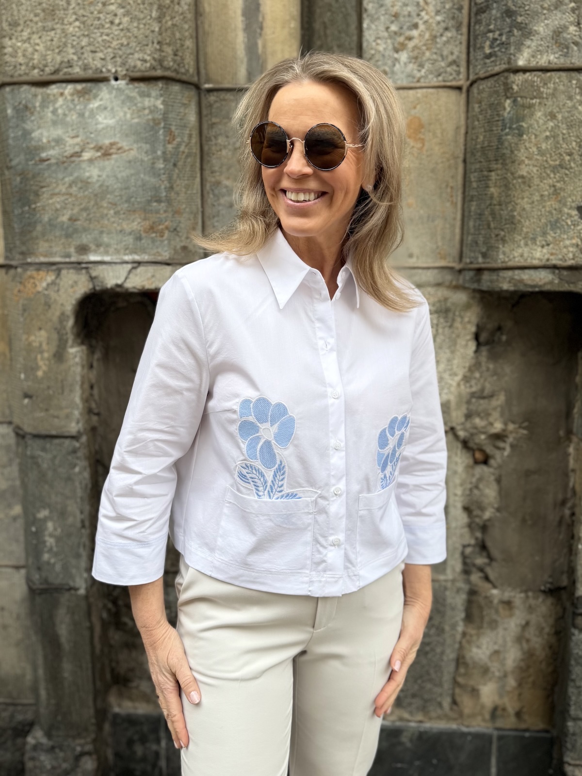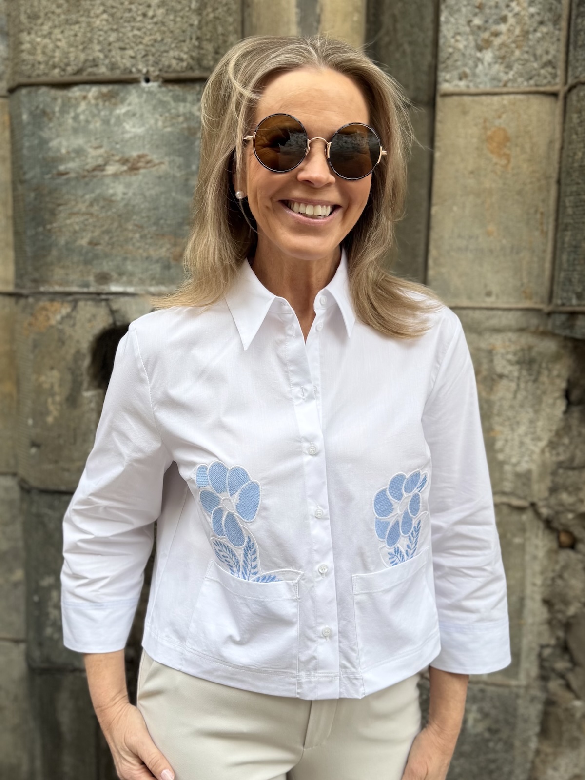 Lizz lyhyt paitapusero kukilla; valkoinen/sininen
