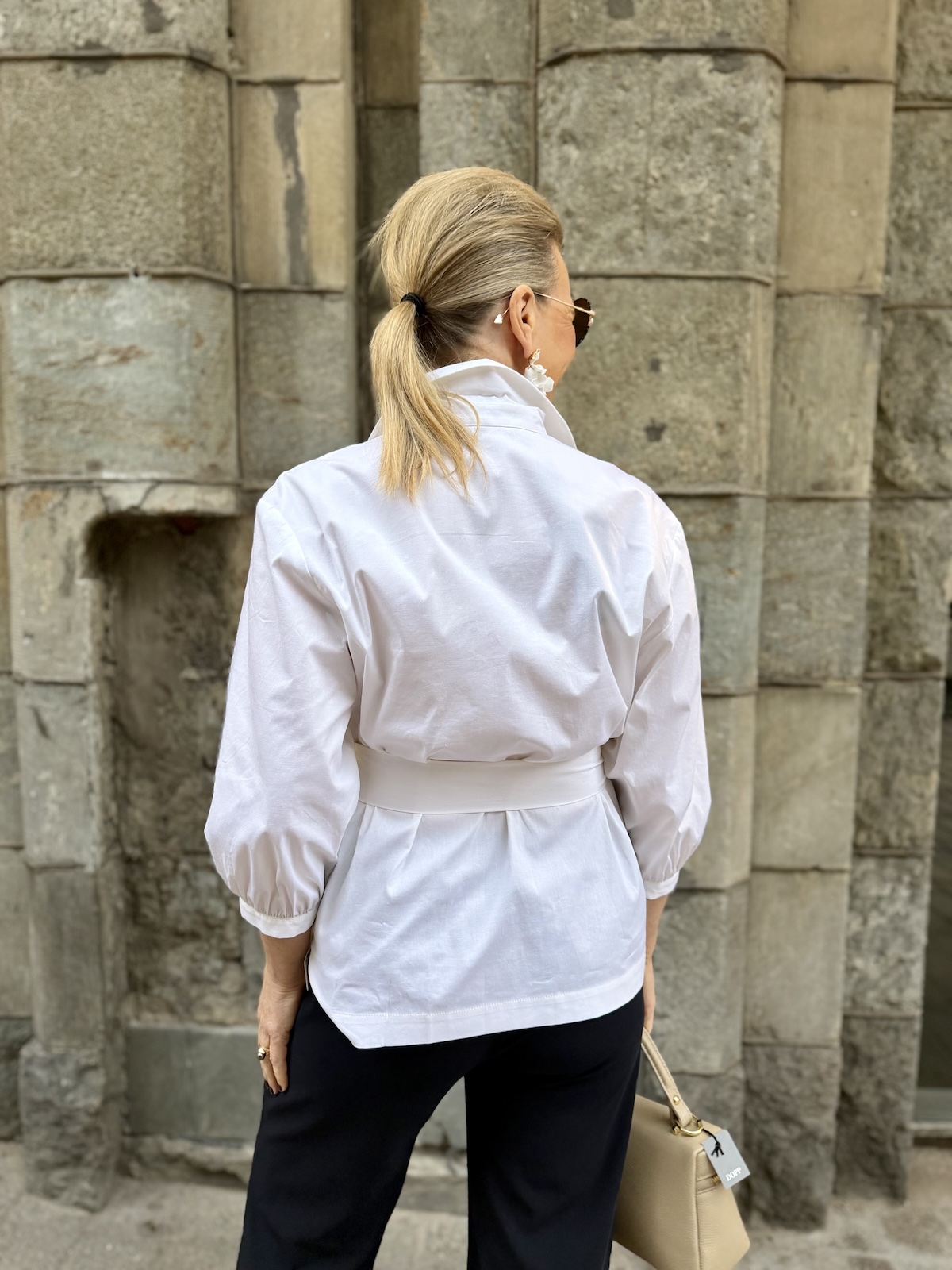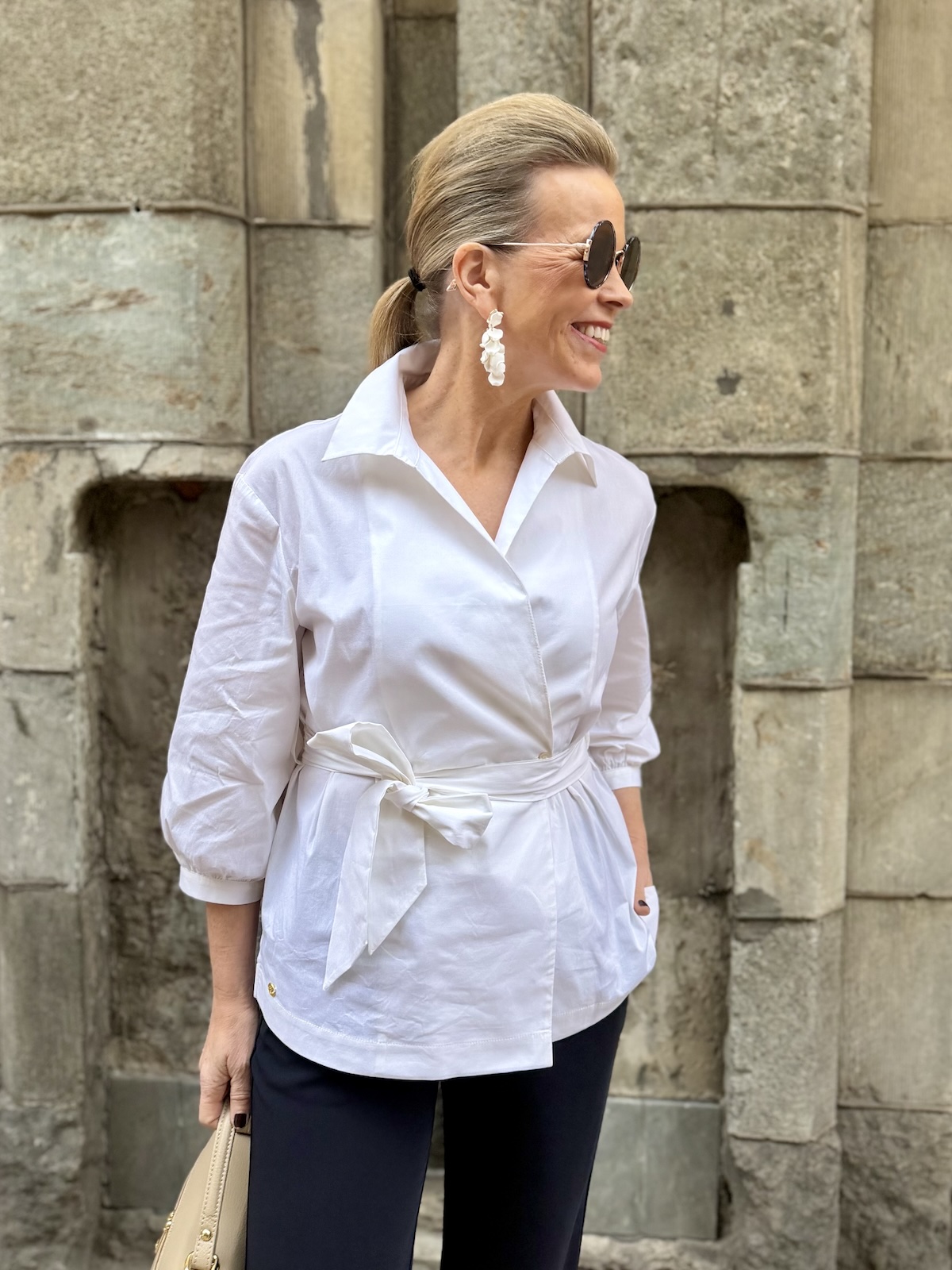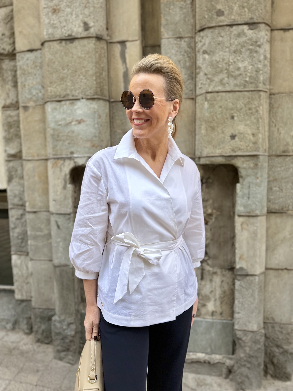 Mara paitapusero on tyylikäs, klassinen paitapusero. Paitapuserossa on kaulukset ja edessä on V-mallinen kaula-auokko. Paidan sivussa on nappi eli etuosa menee kiinni vasemman kyljen kohdalle. Paitapuseron vyö kietaistaa vyötärölle. Hihat ovat vajaamittaset ja hihansuissa on kantti. Sivuissa on pienet halkiot ja paitapusero ylettyy lantiolle. Paitapusero menee loistavasti kiinni edestä, se ei ole avonainen rinnan kohdalta. Paitapusero on malliltaan suora eli sen vyötärönkohtaa ei ole kavennettu. Katalla on paitapuserosta päällä koko 34. Paitapusero on reiluhkoa kokoa.