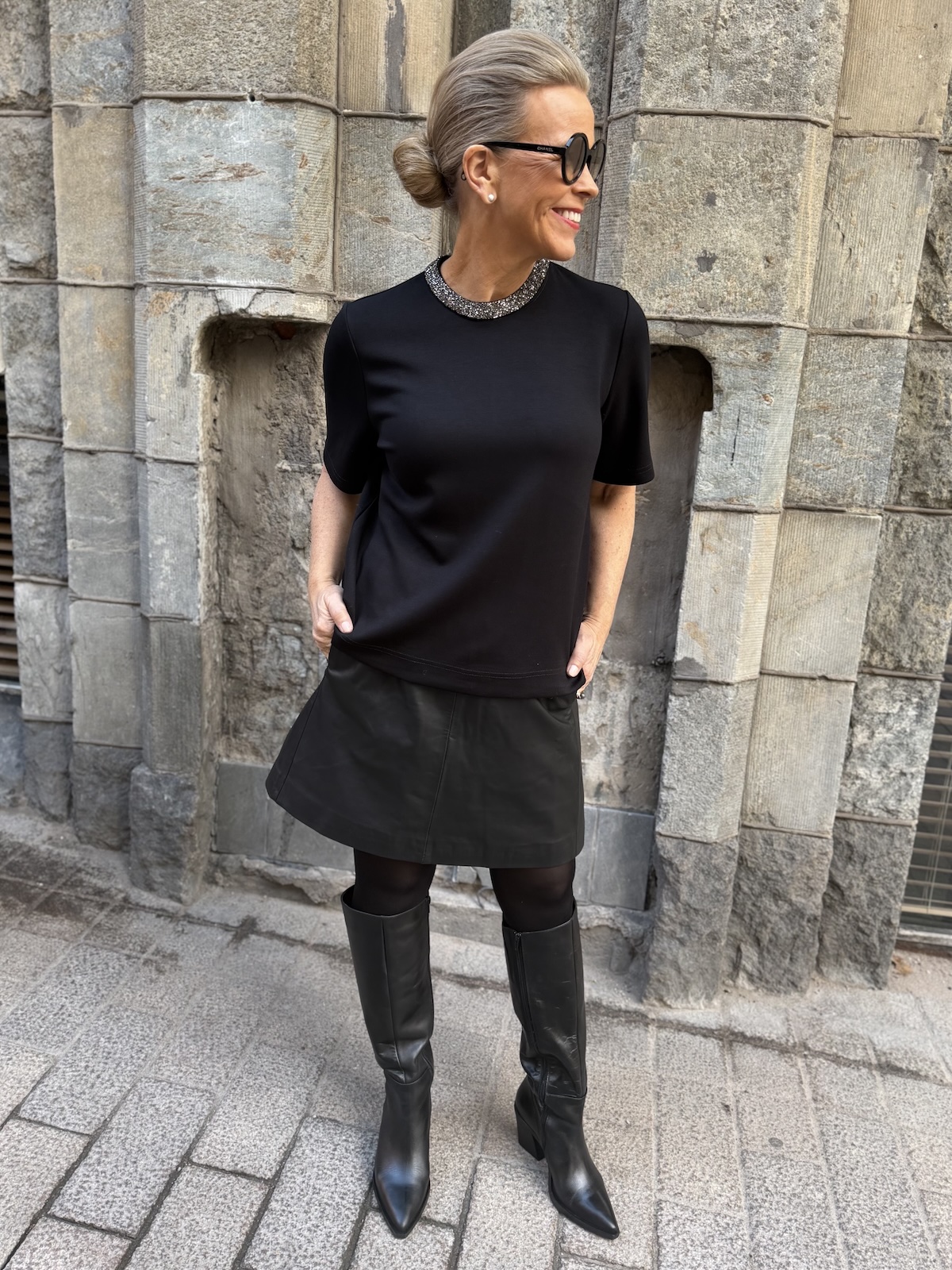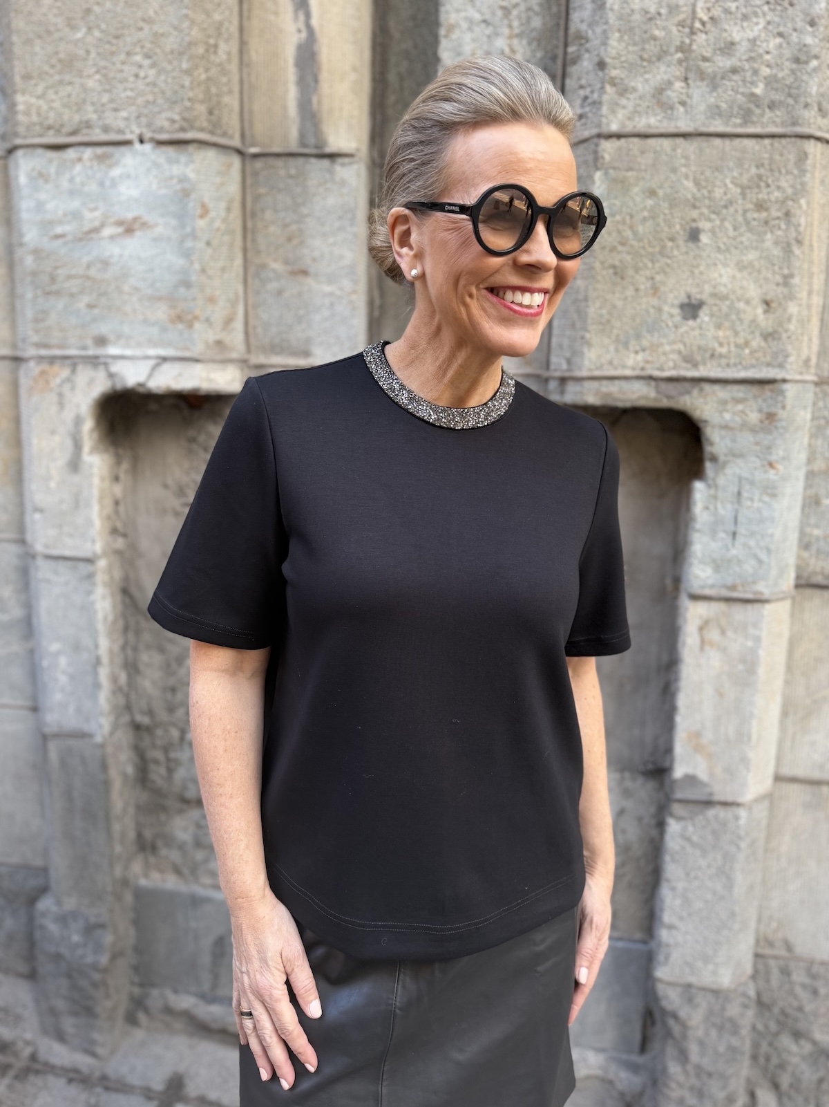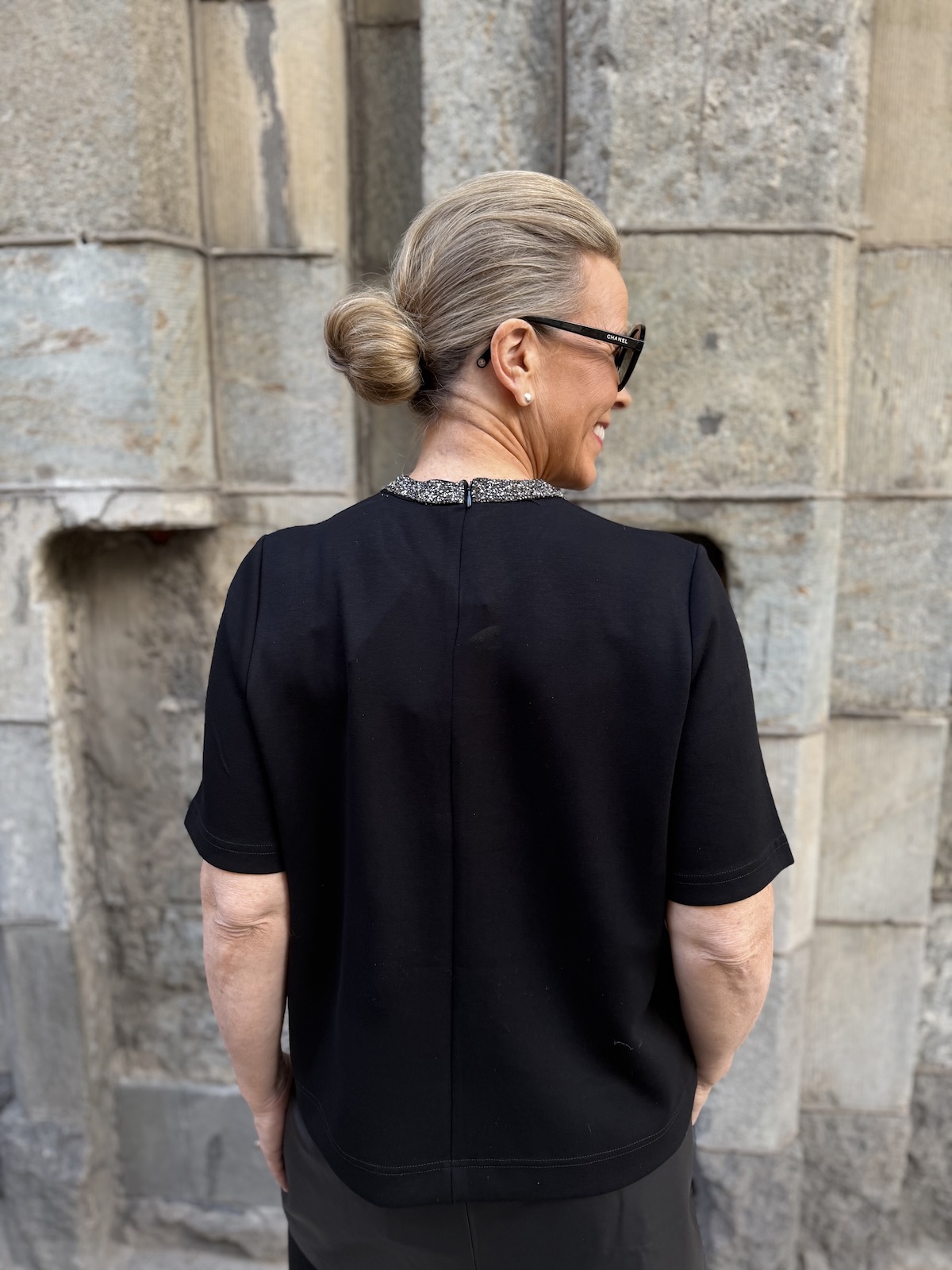 Marigold paita kuuluu ”Pumpulia iholle” olevaan sarjaan. Paidassa on O-kaula-aukko ja löysähköt, noin kyynerpäiden kohdalle ylettyvät hihat. Paidan kaulusta kiertää kaunis strassireunus. Paidan niskassa on vetoketju. Paita on malliltaan suora ja se loppuu lonkkaluiden alapuolelle. Katalla on paidasta päällä koko S.