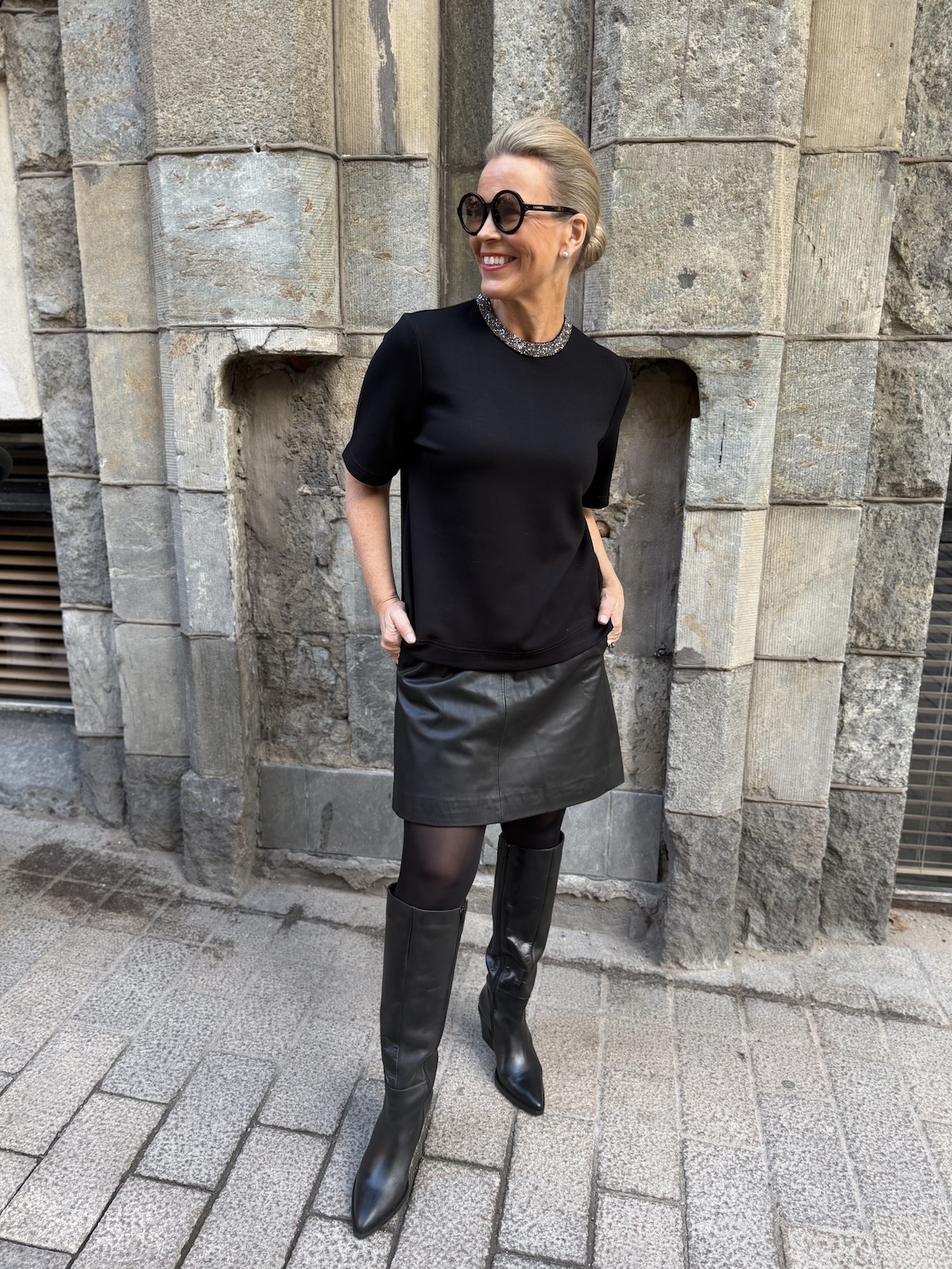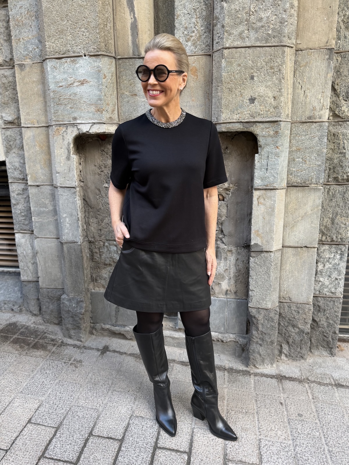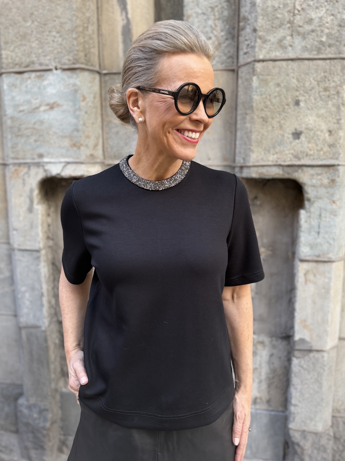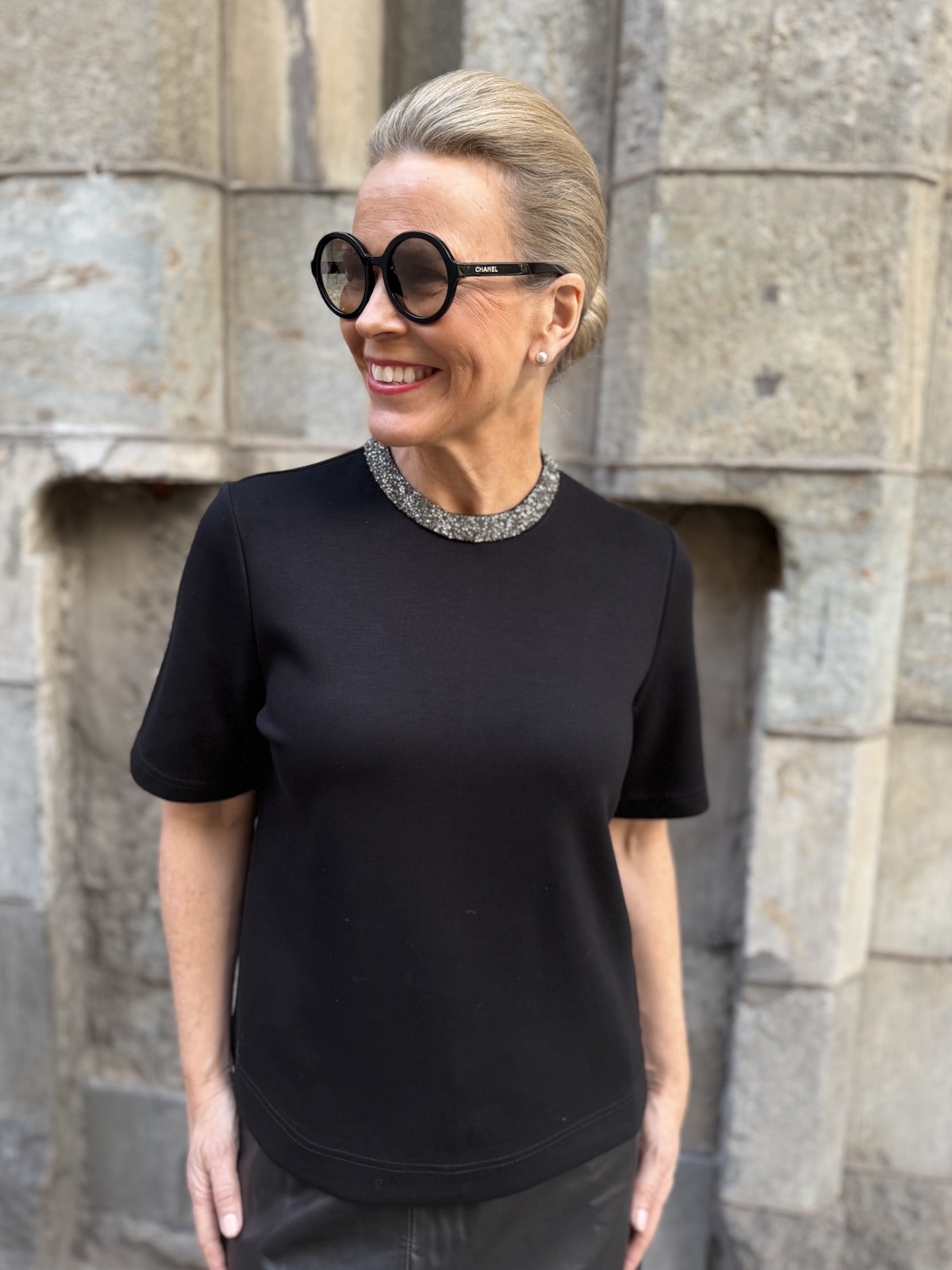 Marigold paita kuuluu ”Pumpulia iholle” olevaan sarjaan. Paidassa on O-kaula-aukko ja löysähköt, noin kyynerpäiden kohdalle ylettyvät hihat. Paidan kaulusta kiertää kaunis strassireunus. Paidan niskassa on vetoketju. Paita on malliltaan suora ja se loppuu lonkkaluiden alapuolelle. Katalla on paidasta päällä koko S.
