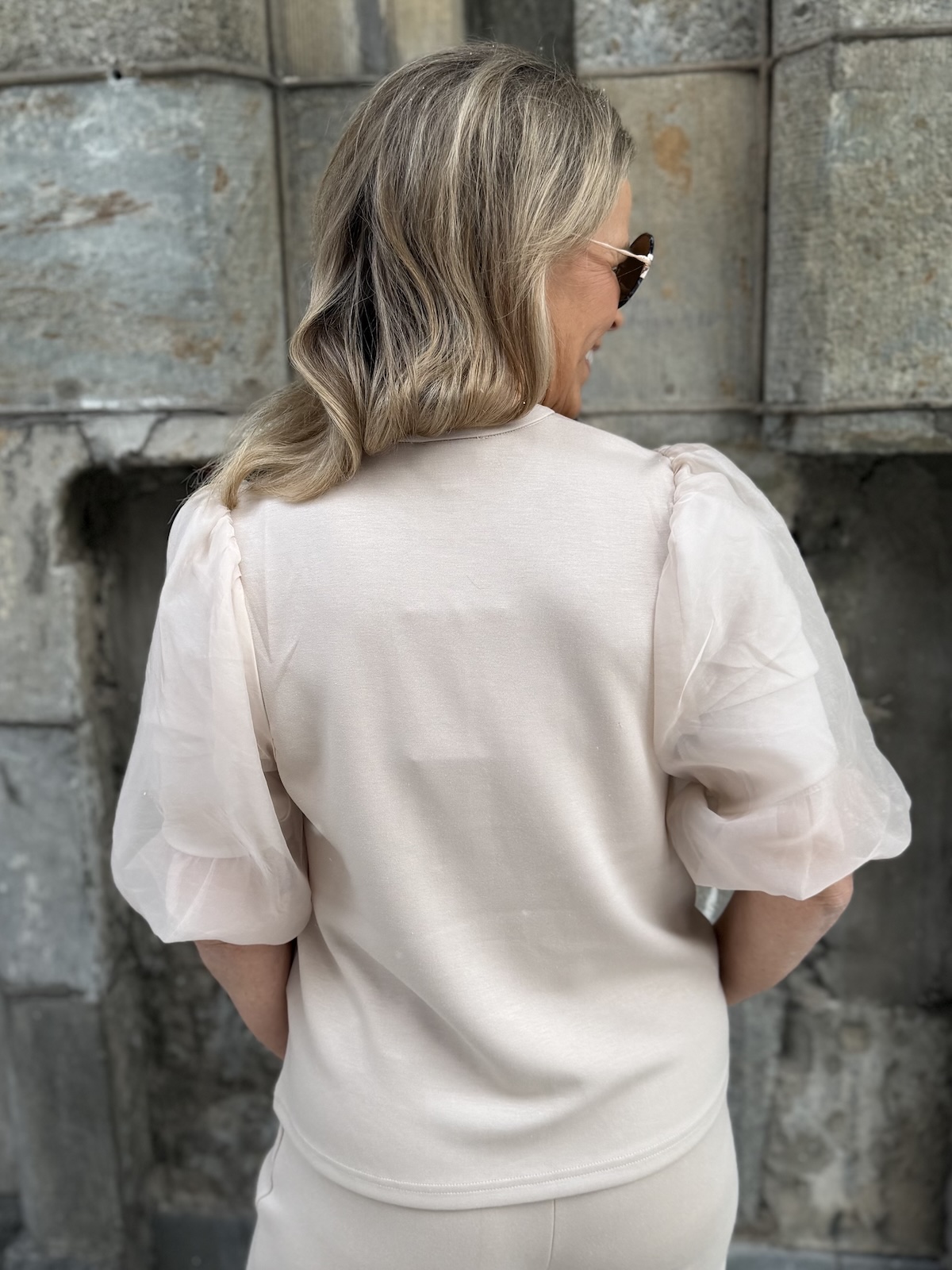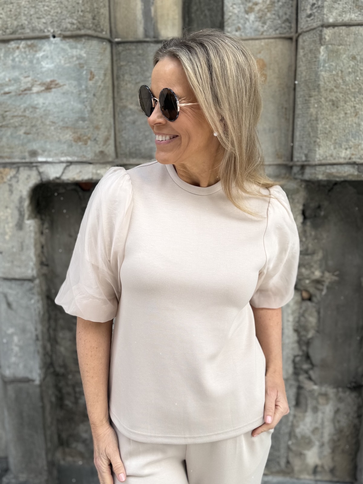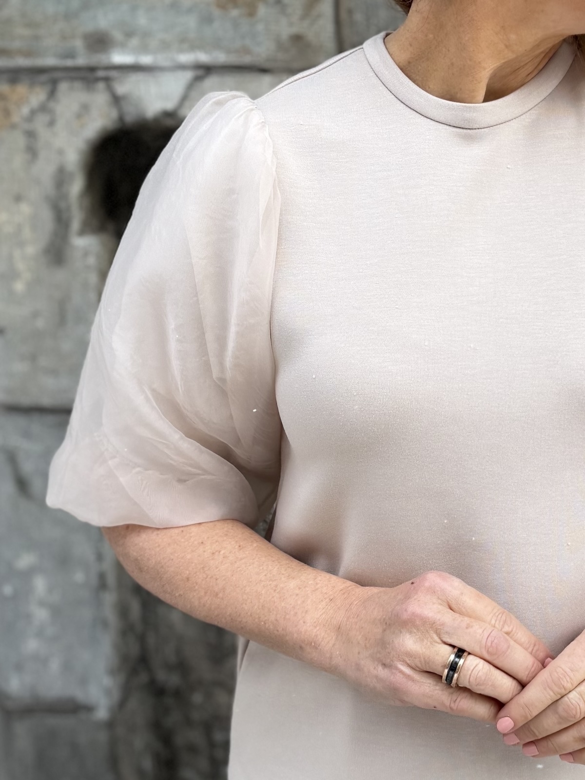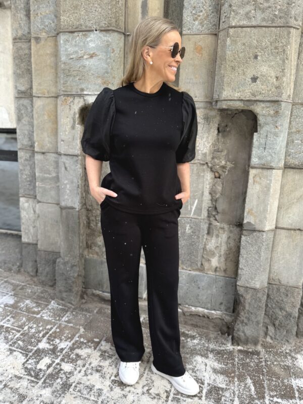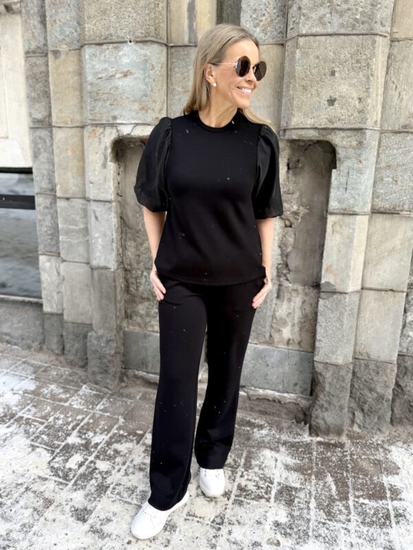 Marigold sarja kuuluu ”pumpulia iholle” olevaan sarjaan. Paidassa on O-kaula-aukko ja super ihanat hihat! Hihat ovat organza kangasta päältä ja niissä on vuori eli ne eivät ole läpikuultavat. Malliltaan paita levenee aavistuksen alaspäin ja se loppuu lantiolle. Katalla on paidasta päällä koko XS. Suosittelemme paidasta ottamaan koon mitä tavallisesti käyttää. Jos on kahden koon välissä, niin pienempi koko. Jos koko on liian pieni voi hihansuut kiristää.