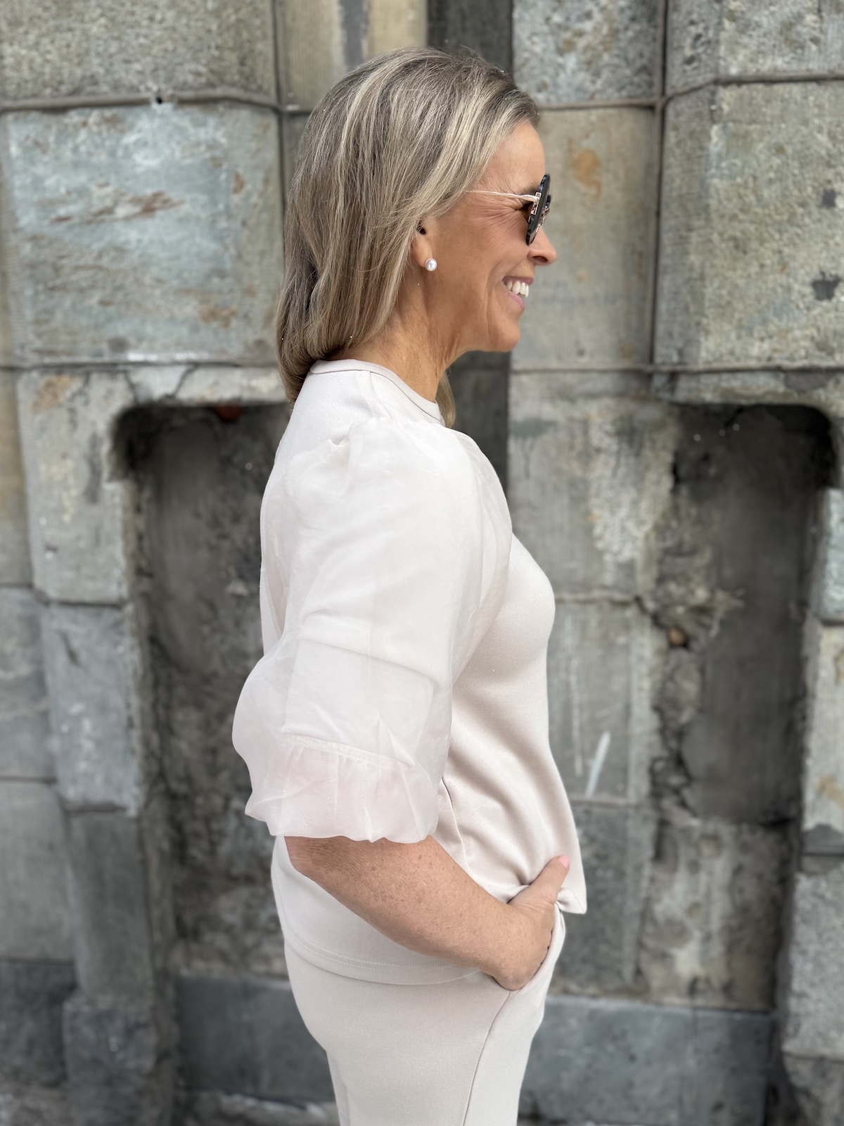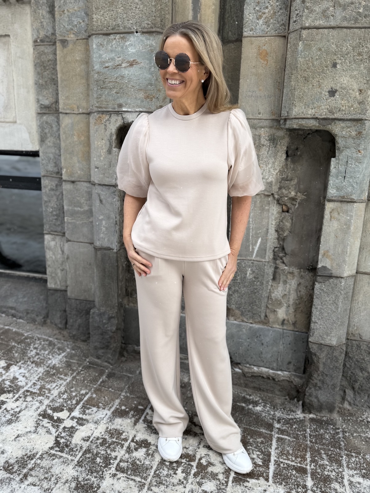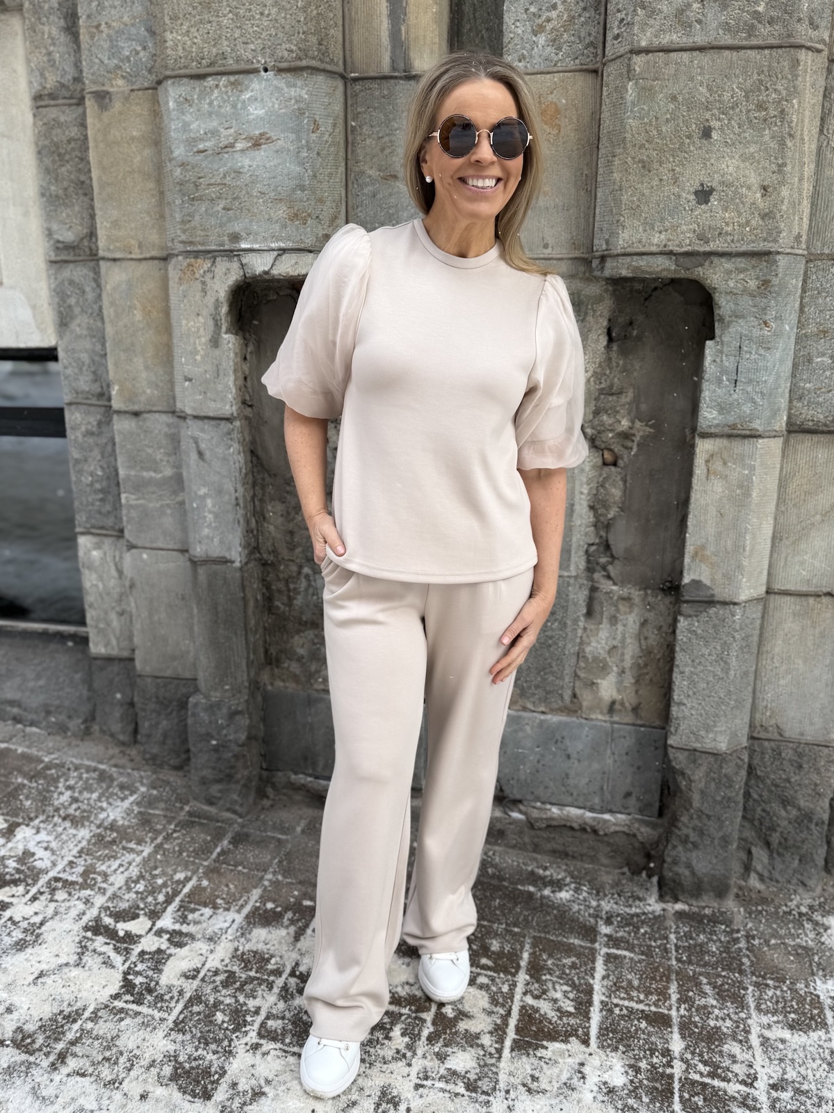 Marigold sarja kuuluu ”pumpulia iholle” olevaan sarjaan. Paidassa on O-kaula-aukko ja super ihanat hihat! Hihat ovat organza kangasta päältä ja niissä on vuori eli ne eivät ole läpikuultavat. Malliltaan paita levenee aavistuksen alaspäin ja se loppuu lantiolle. Katalla on paidasta päällä koko XS. Suosittelemme paidasta ottamaan koon mitä tavallisesti käyttää. Jos on kahden koon välissä, niin pienempi koko. Jos koko on liian pieni voi hihansuut kiristää.