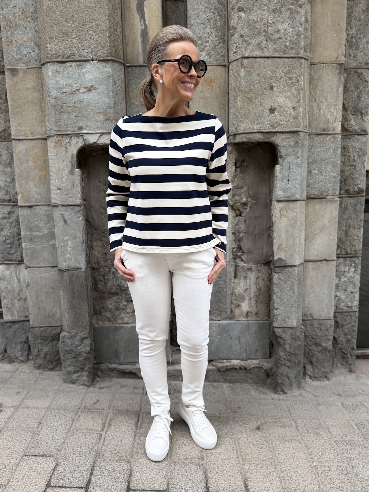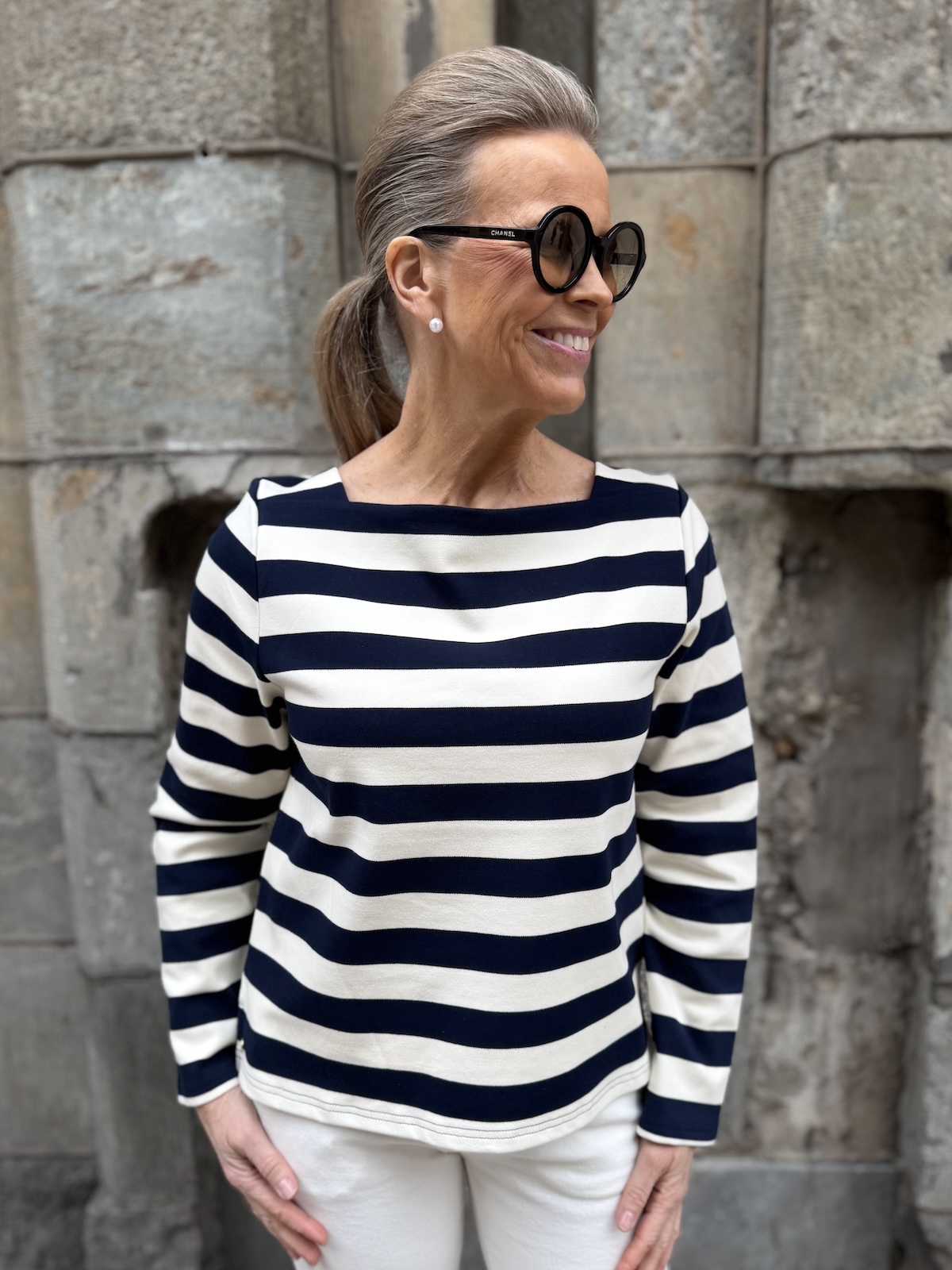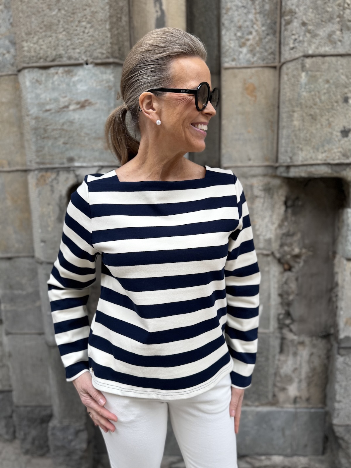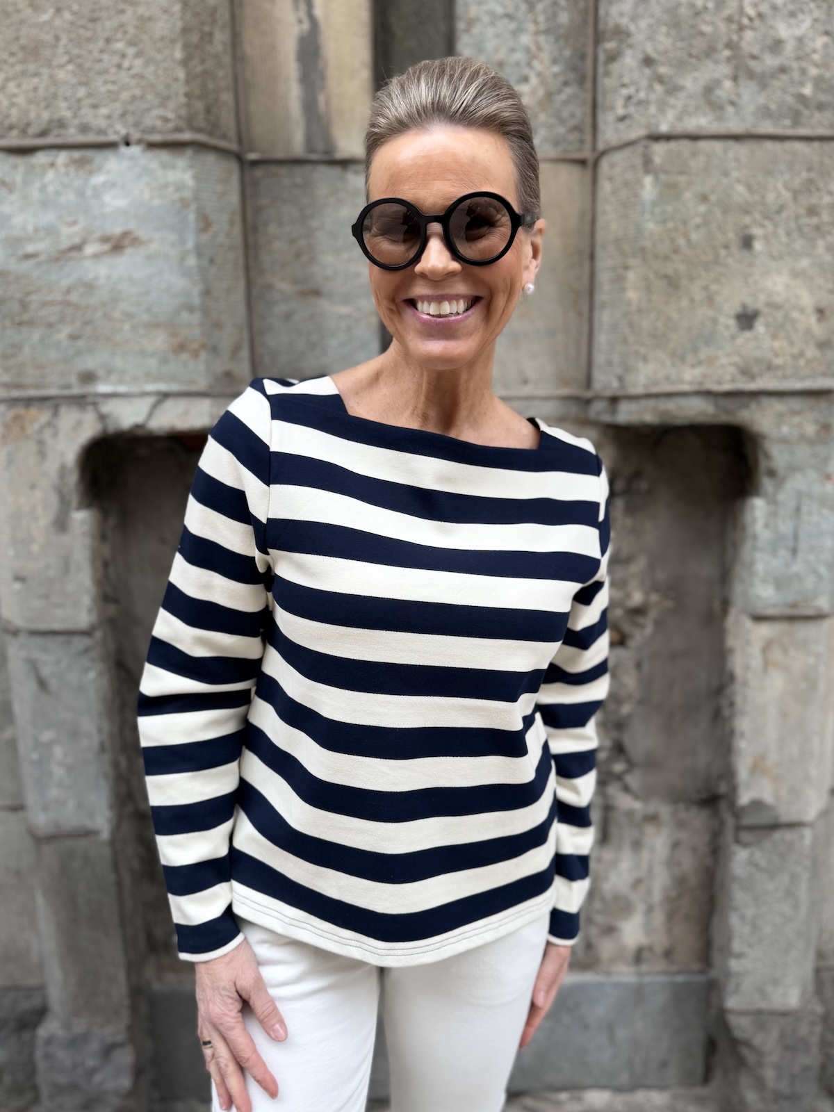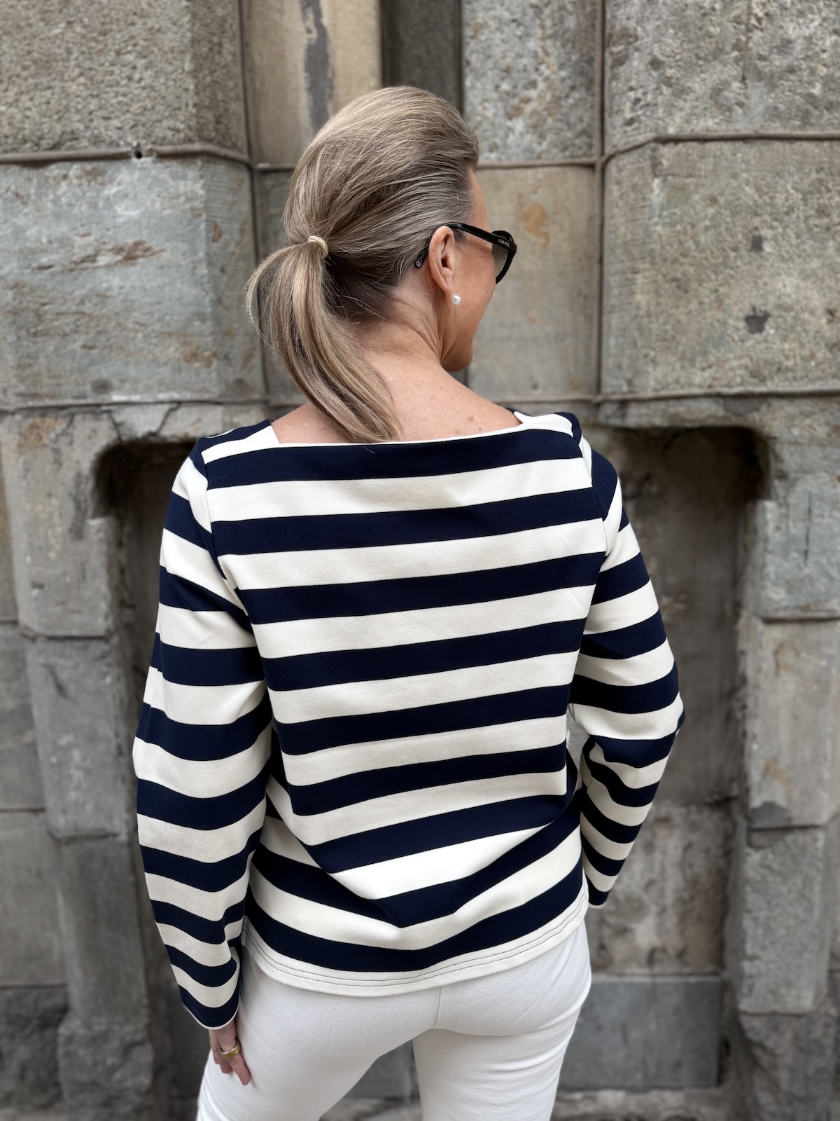 Mary on tyylikäs raitapaita. materiaali on aavistuksen paksumpaa, mutta ei tönkköä materiaalia. Mary paidassa ja samoin mekossa on suorakulmaisen mallinen kaula-akko. Hihat ovat täyspitkät ja malliltaan paita on suora ja se loppuu lantiolle. Padan helmassa on pienet halkiot. Katalla on paidasta päällä koko S, mutta myös XS on hänelle ok koko.