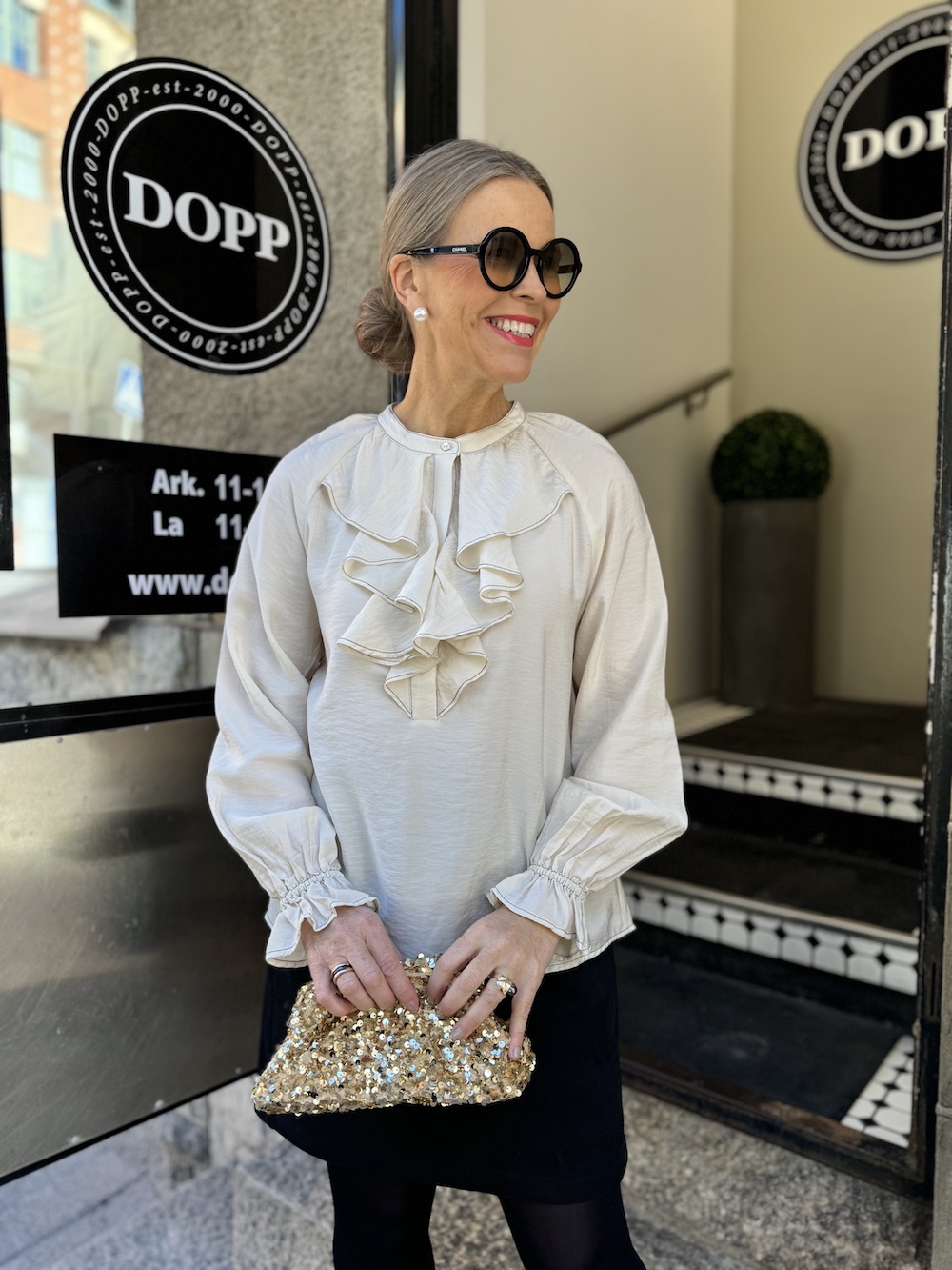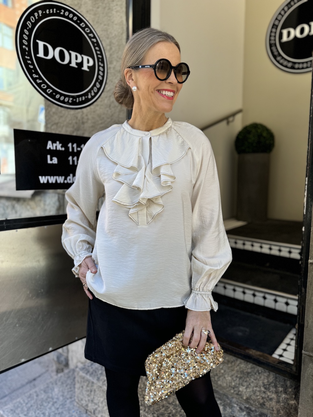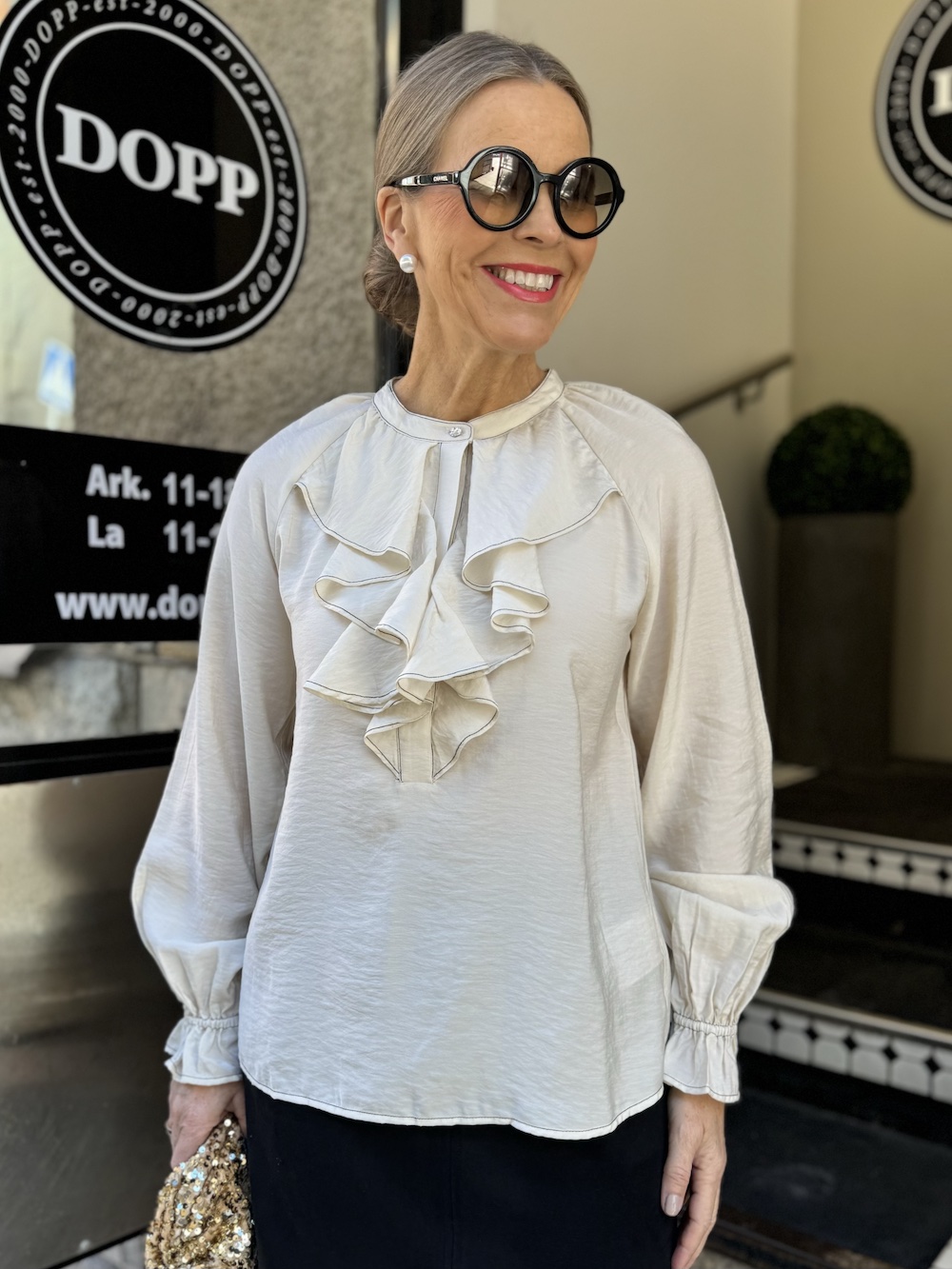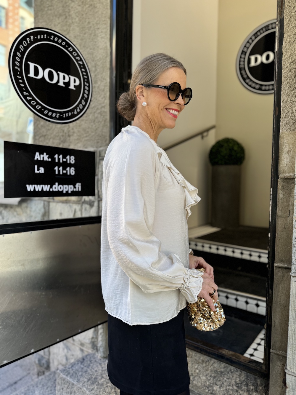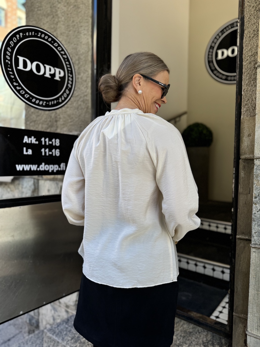 Melba on kaunis paita. Paidan edessä on nappilista rinnan alapuolella asti. . Nappilistan reunassa on näyttävät fyrrykantit. Kaula-aukko on O-mallinen ja kaula-aukossa on kaunis nappi. Hihat ovat pussimaiset ja rannekkeissa on kumnauha ja pieni fyrrykantti. Malliltaan paita on suora ja sen helma on kauniisti pyöristetty. Katalla on paidasta päällä koko 34.