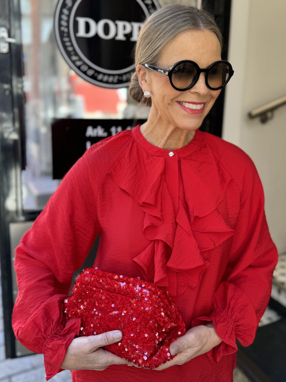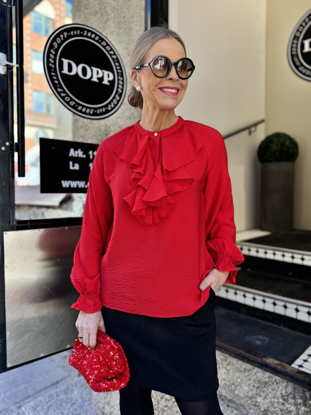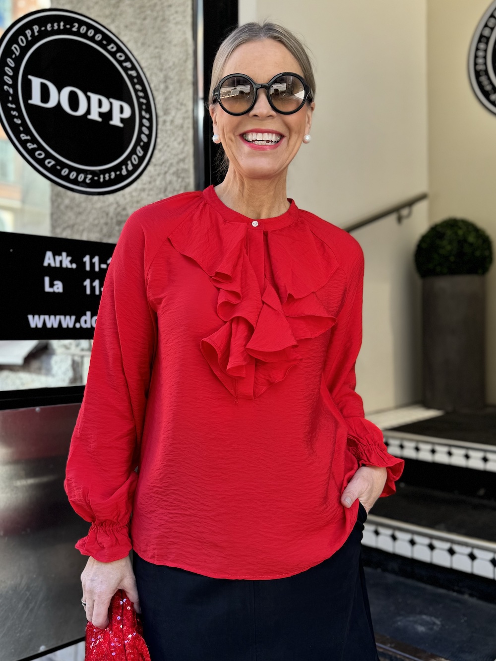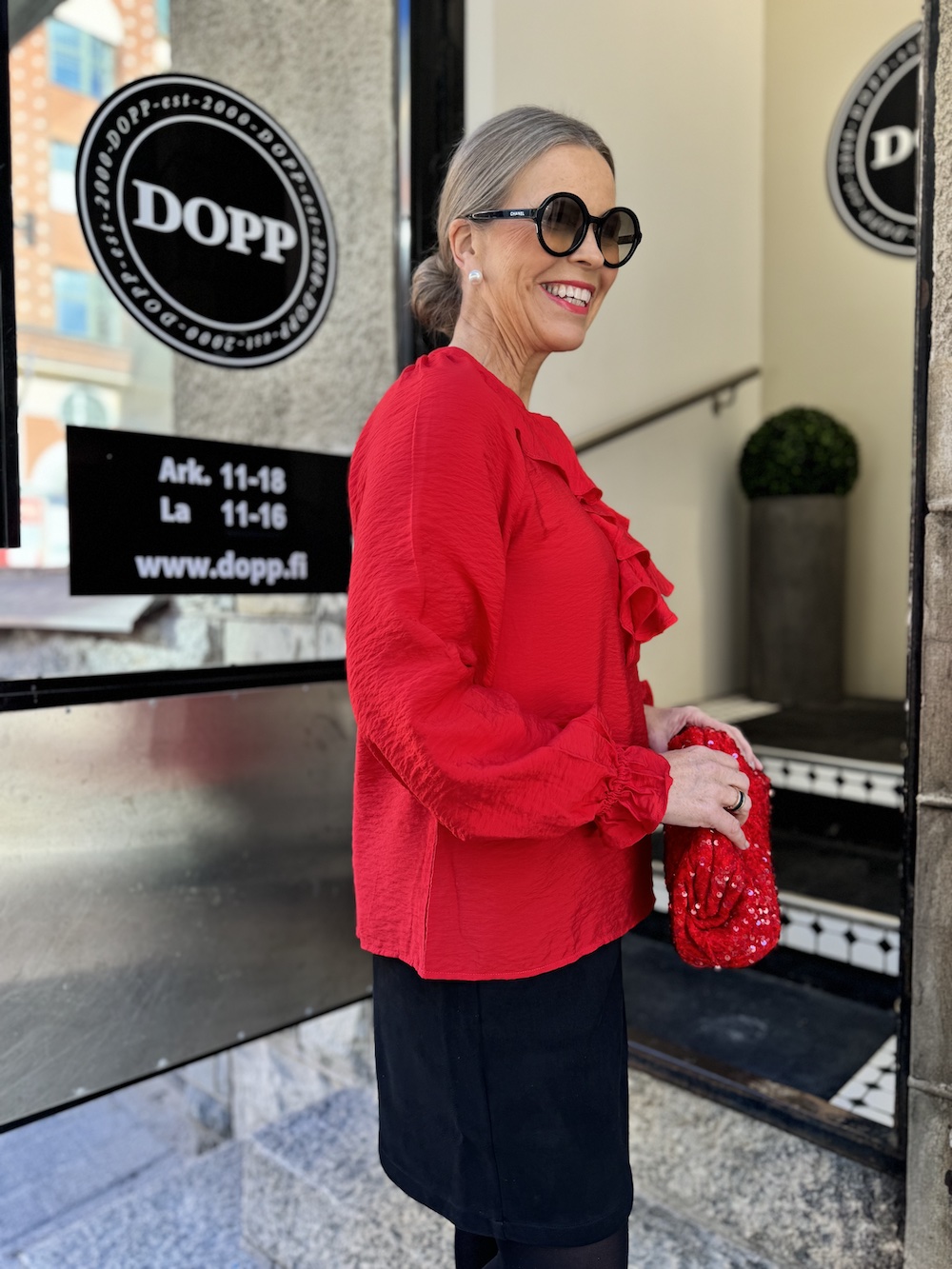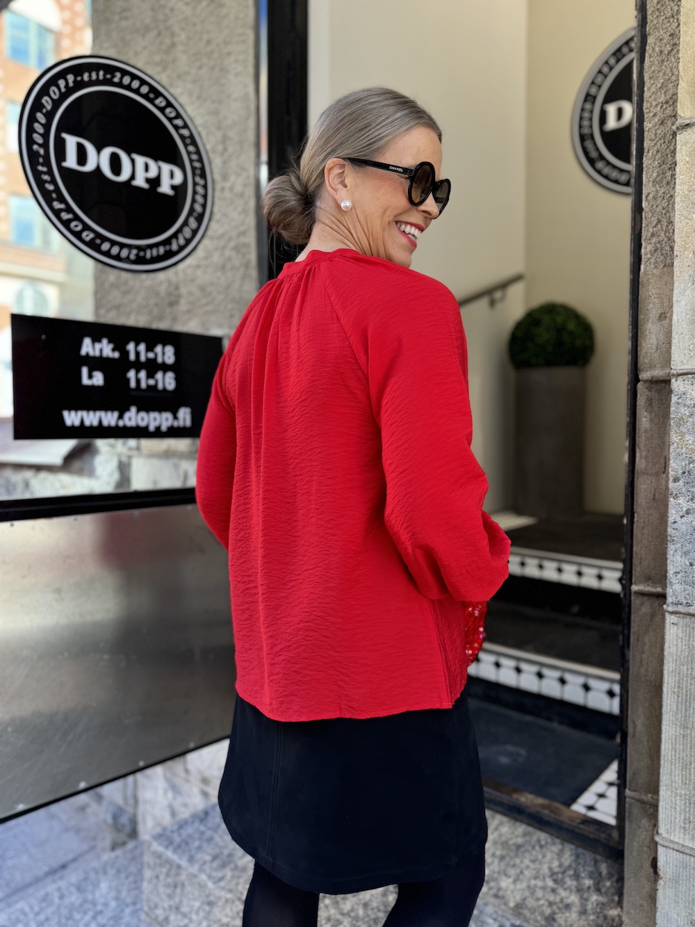 Melba on kaunis paita. Paidan edessä on nappilista rinnan alapuolella asti. . Nappilistan reunassa on näyttävät fyrrykantit. Kaula-aukko on O-mallinen ja kaula-aukossa on kaunis nappi. Hihat ovat pussimaiset ja rannekkeissa on kumnauha ja pieni fyrrykantti. Malliltaan paita on suora ja sen helma on kauniisti pyöristetty. Katalla on paidasta päällä koko 34.