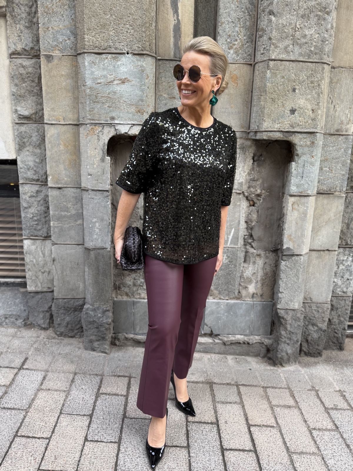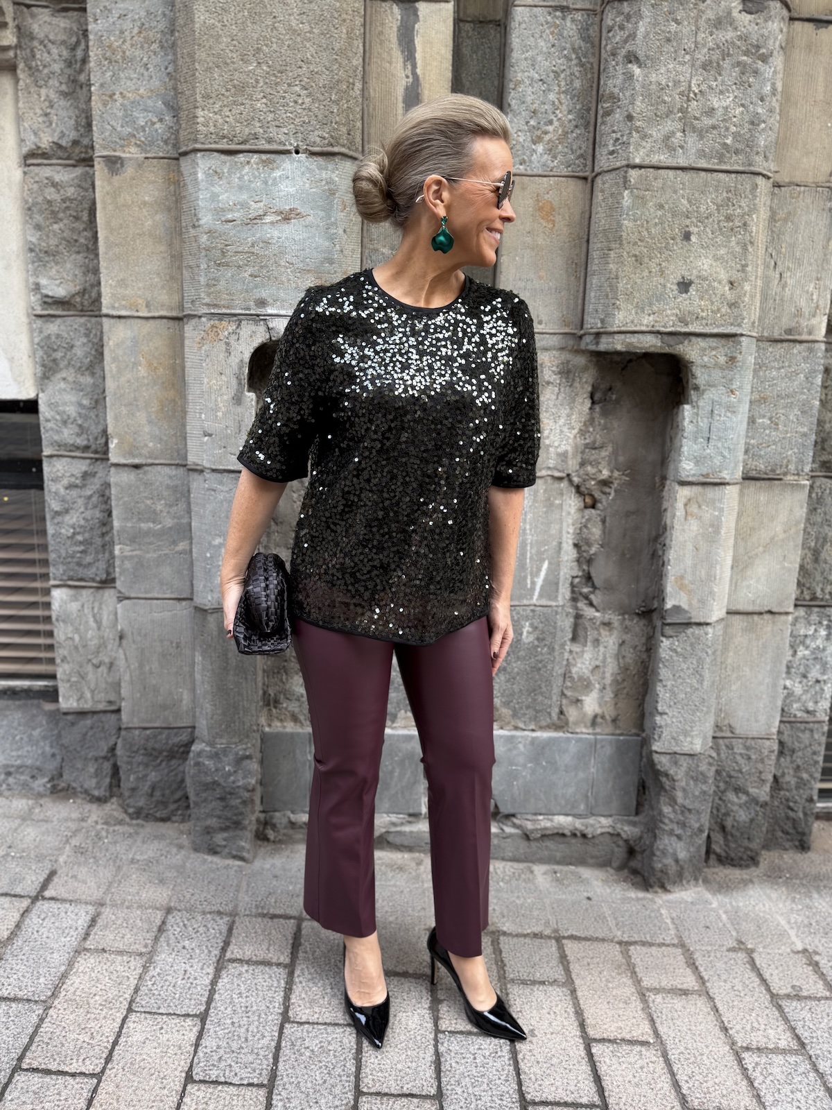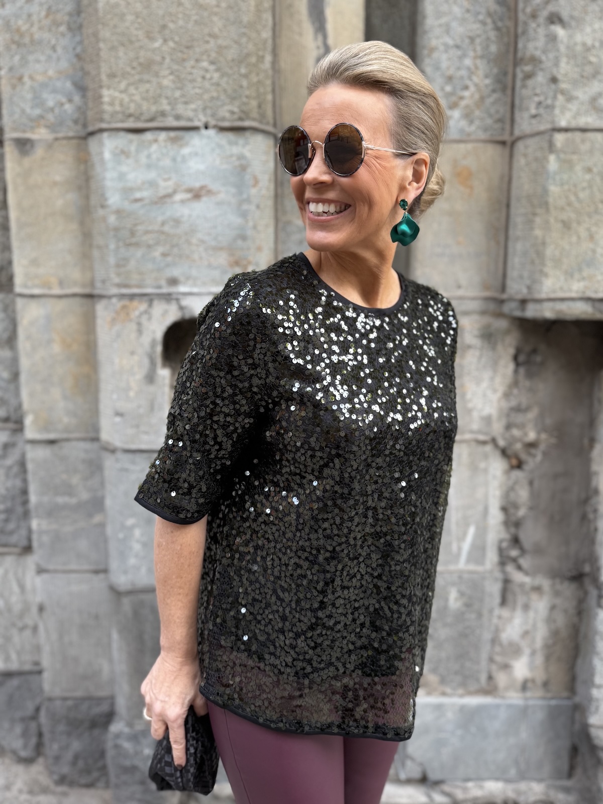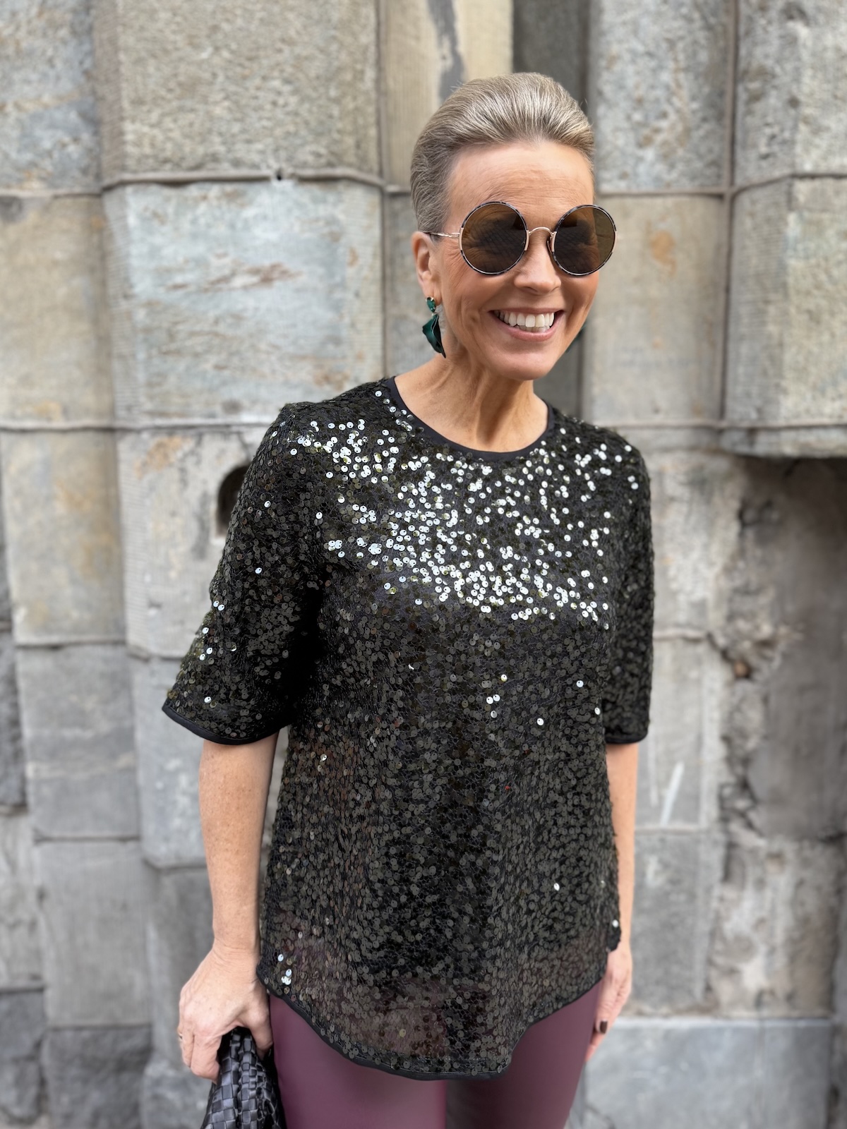 Melia paita on upea, koska se on oliivinvihreä. Harvoin näkee vihreitä paljettiasuja! Paidassa on O-kaula-aukko ja kyynerpäiden kohdalle ylettyvät hihat. Malliltaan paita on suora ja se loppuu noin haarasauman kohdalle. Katalla on paidasta päällä koko S, koska hän haluasi paidasta hieman pidemmän istuvien tekonahkahousujen takia. Muuten hän käyttää paidasta koko XS. Paita vastaa normaalia/hieman reilumpaa kokoa kuin normaalisti.