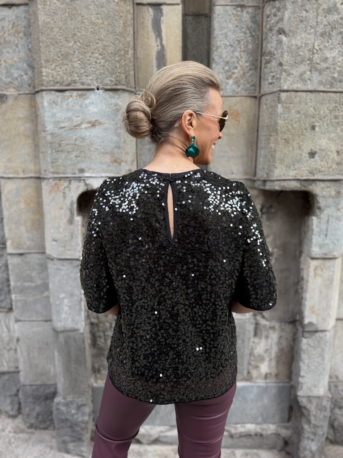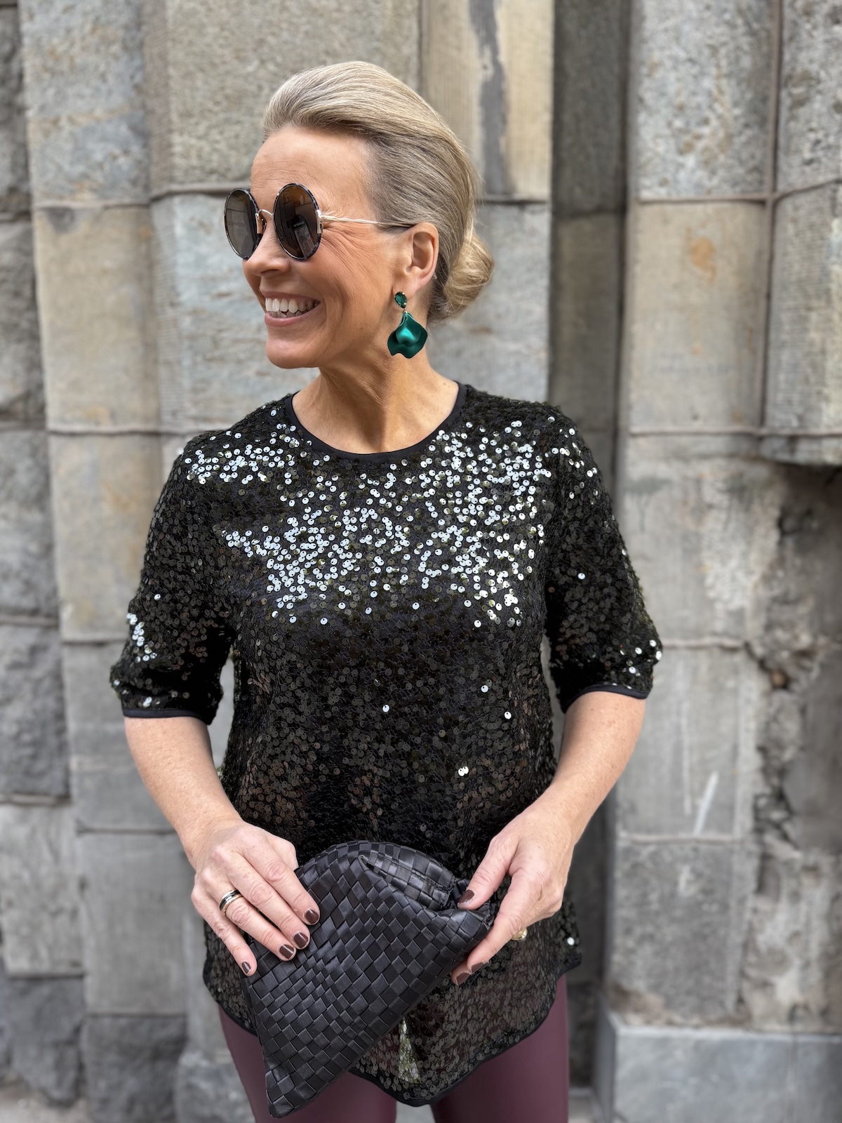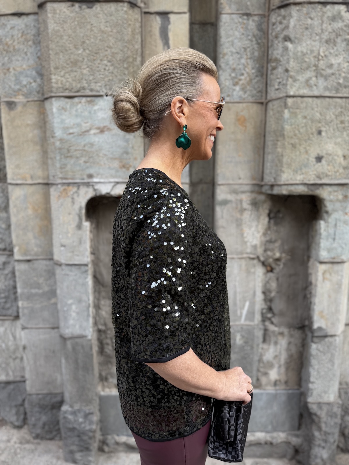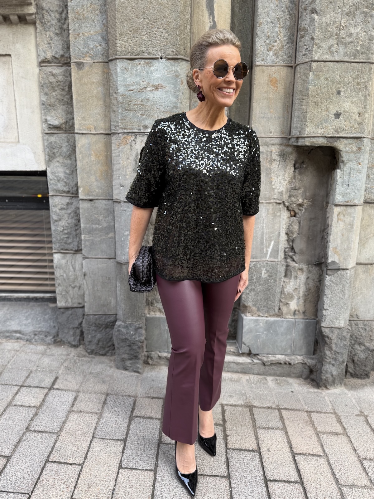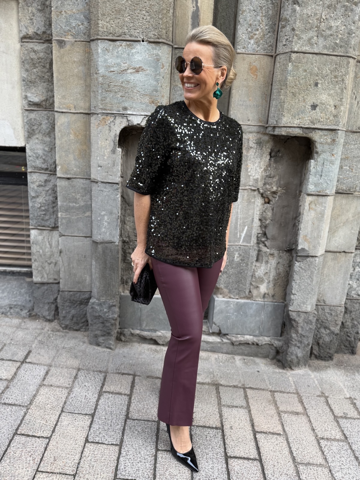 Melia paita on upea, koska se on oliivinvihreä. Harvoin näkee vihreitä paljettiasuja! Paidassa on O-kaula-aukko ja kyynerpäiden kohdalle ylettyvät hihat. Malliltaan paita on suora ja se loppuu noin haarasauman kohdalle. Katalla on paidasta päällä koko S, koska hän haluasi paidasta hieman pidemmän istuvien tekonahkahousujen takia. Muuten hän käyttää paidasta koko XS. Paita vastaa normaalia/hieman reilumpaa kokoa kuin normaalisti.
