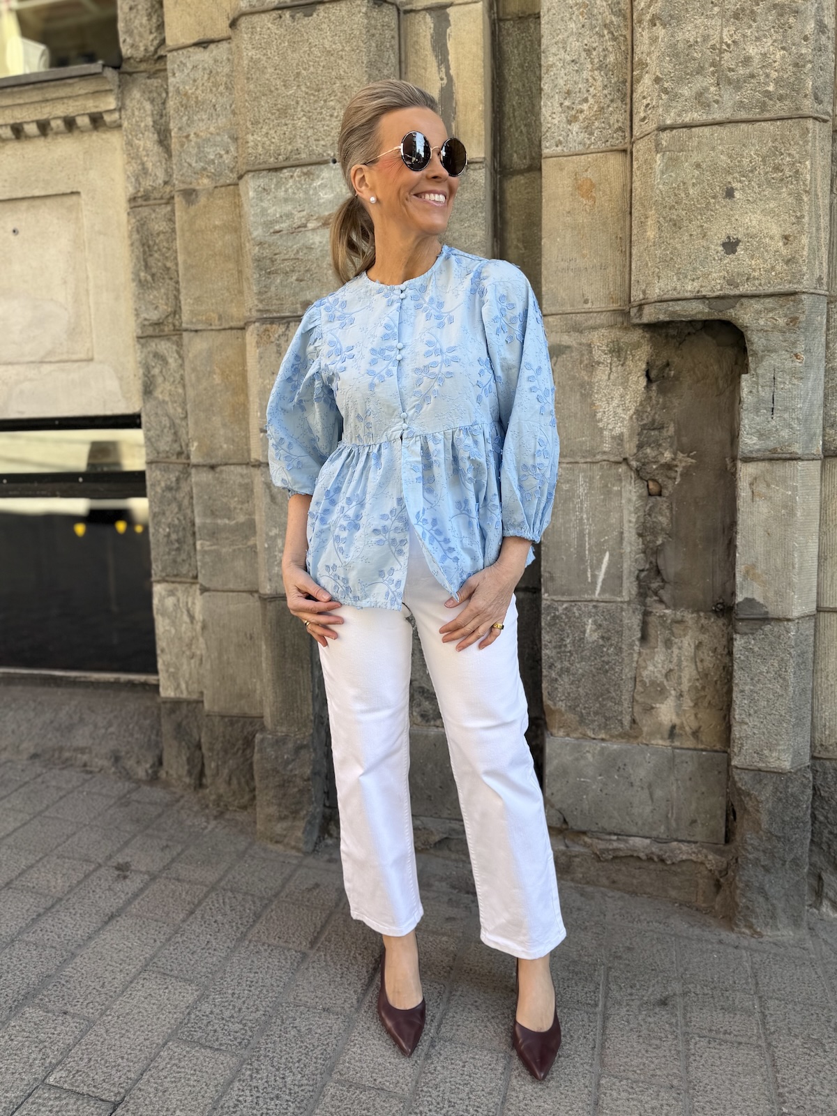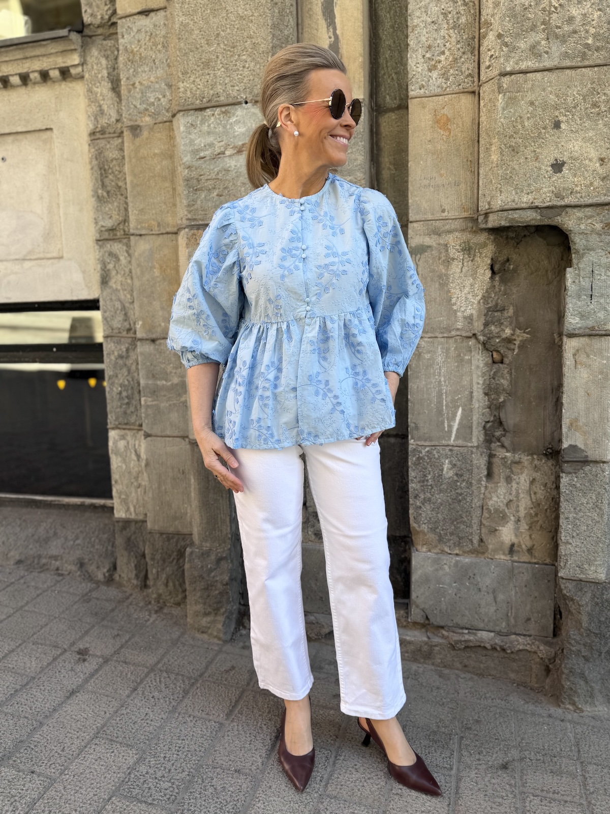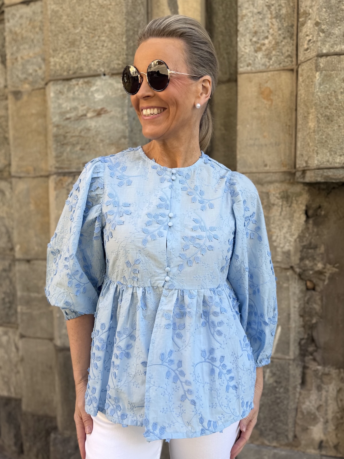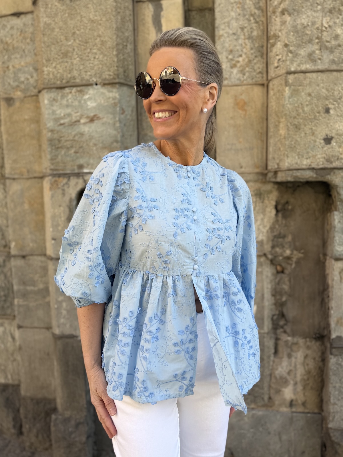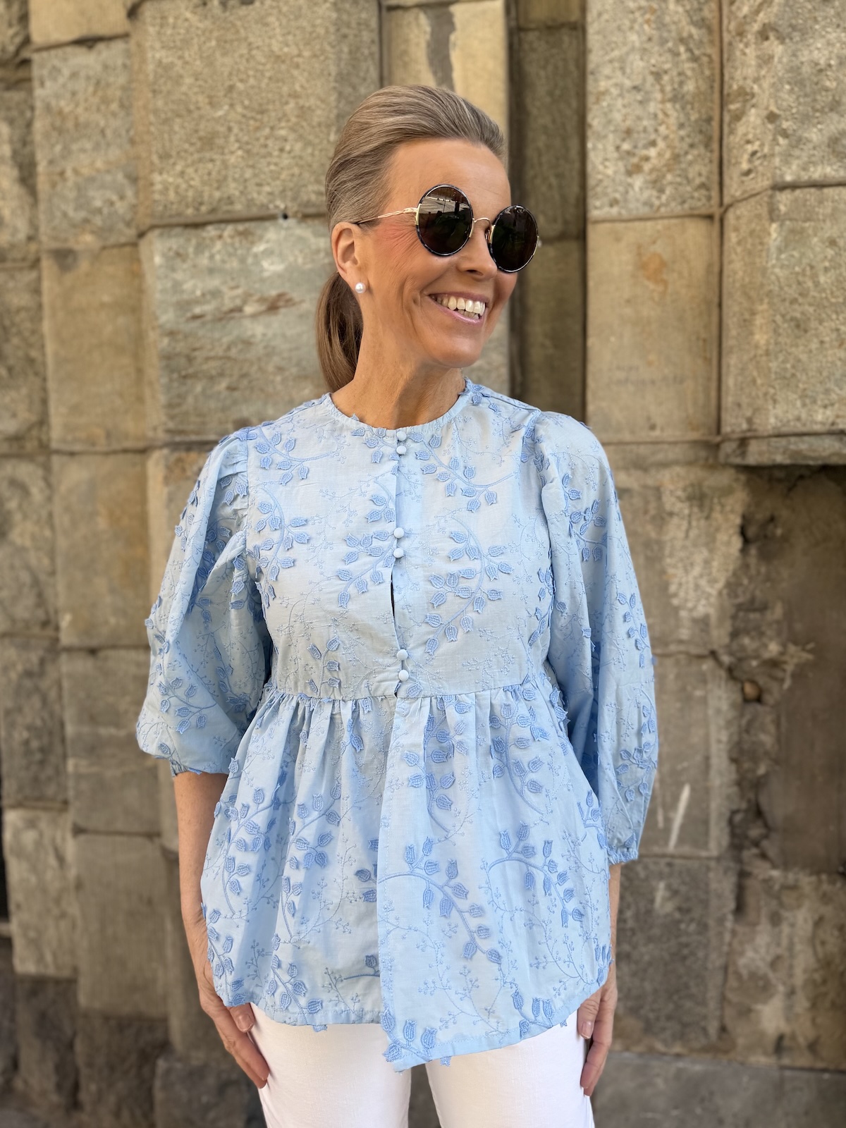 Moni Neda paita kukkakirjailulla; vaaleansininen