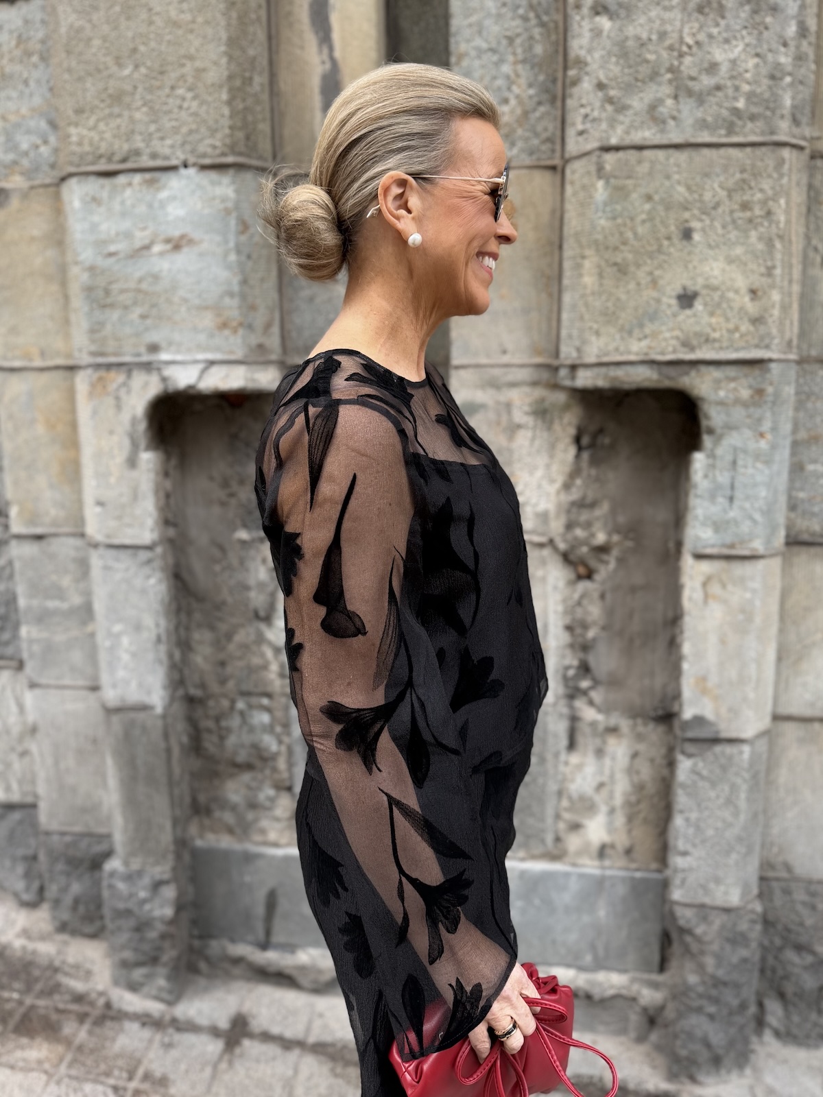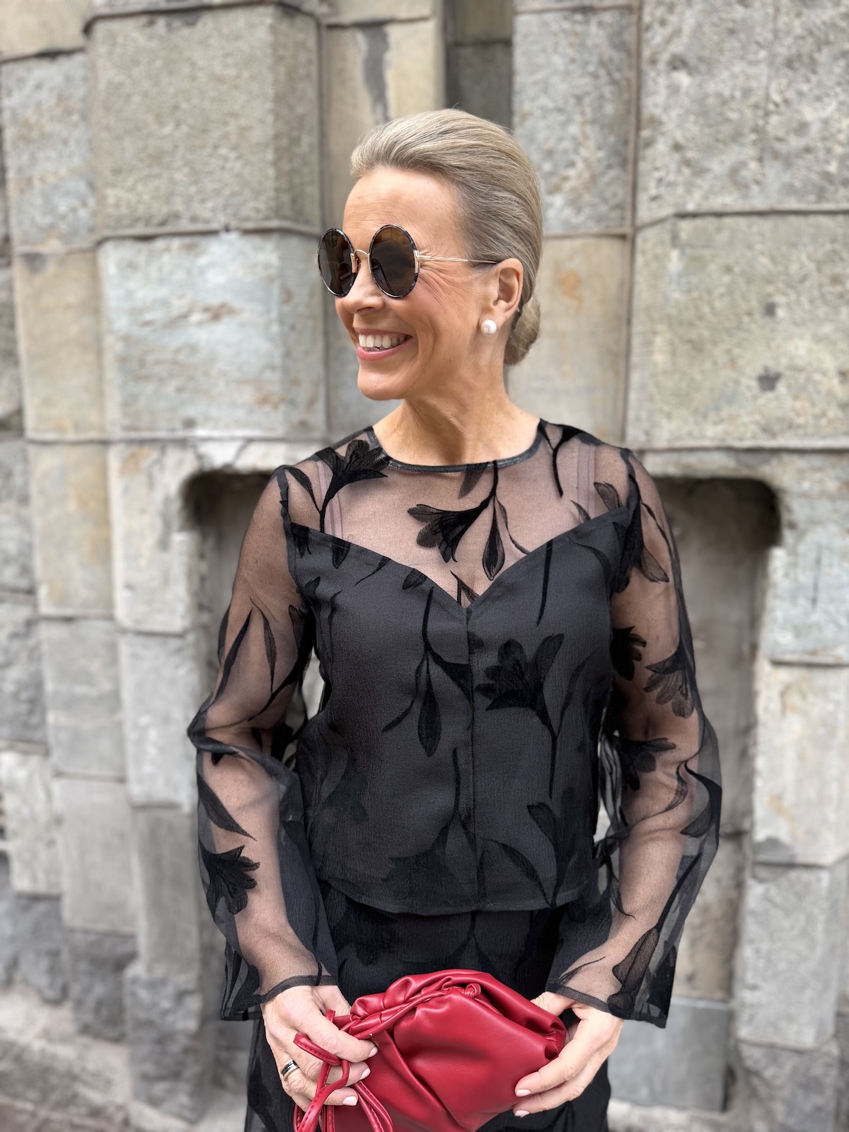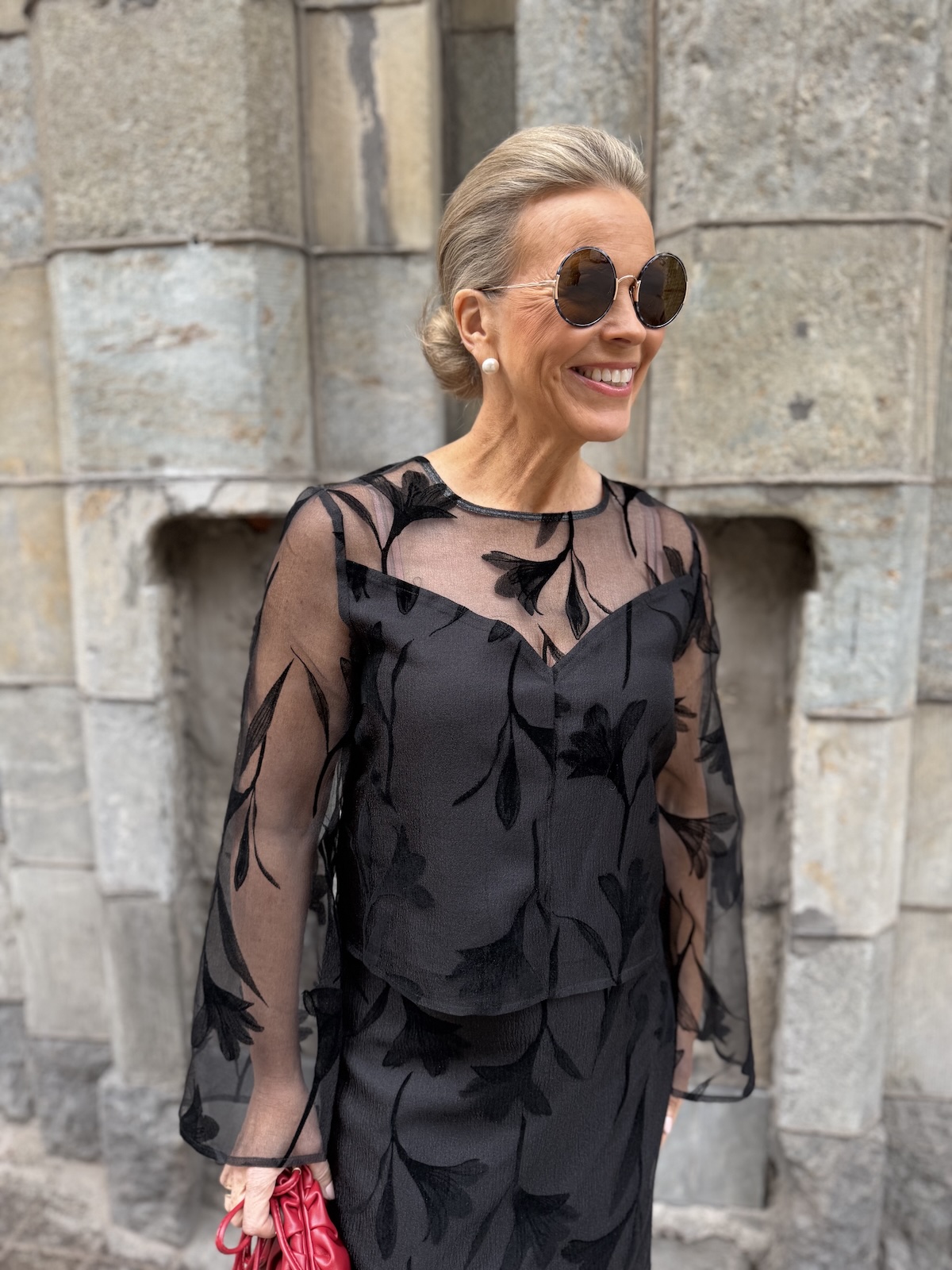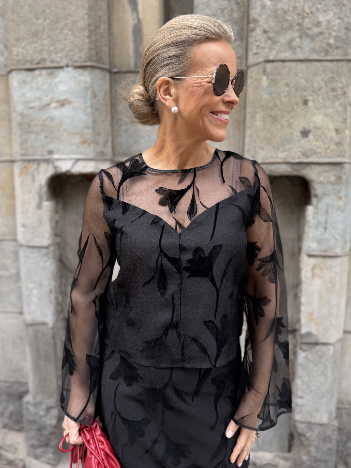 Philomena on upea juhlapaita. Paidassa on O-kaula-aukko ja niskassa on nappi. Paidan etuosa ja takaosa (yläselkä) sekä hihat ovat läpikuultavaa kangasta. Paidassa on vuori edessä ja takana ja vuori onkin kauniisti leikattu edestä. Malliltaan paita on suora ja se loppuu lonkkaluiden kohdalle. Katalla on paidasta päällä koko S.