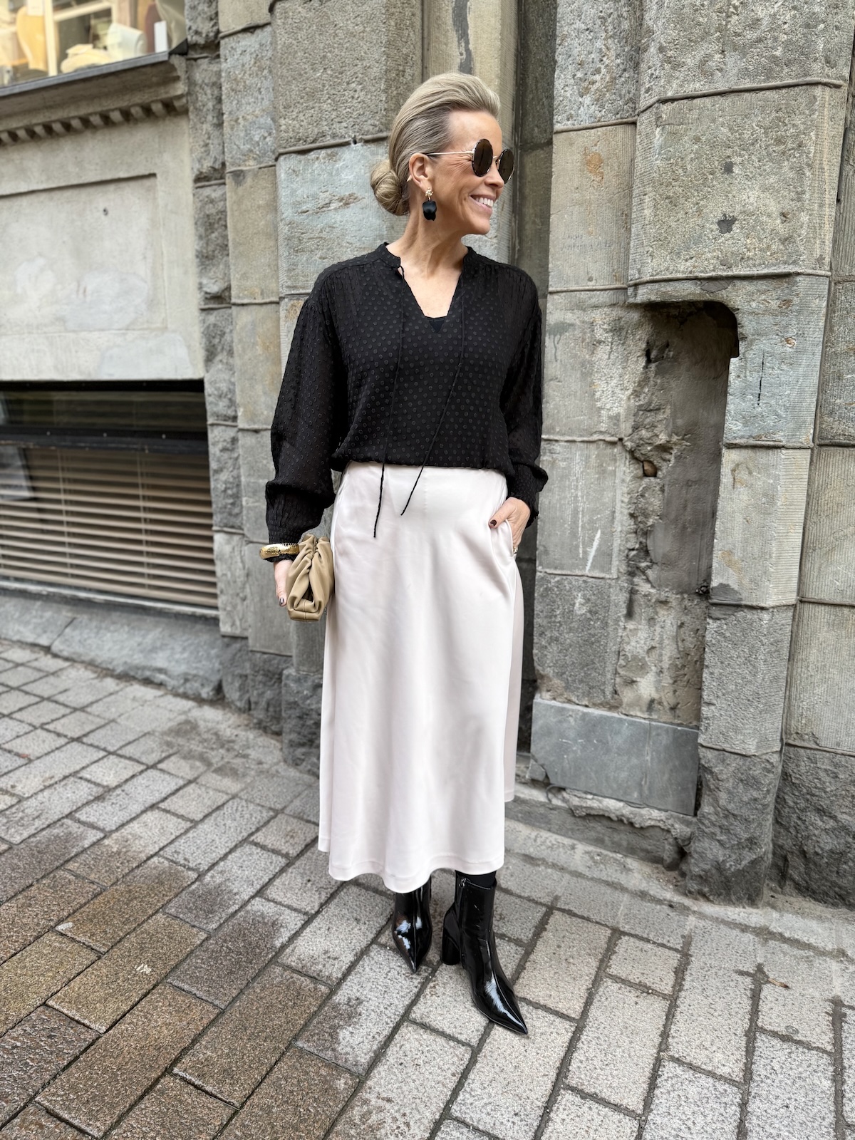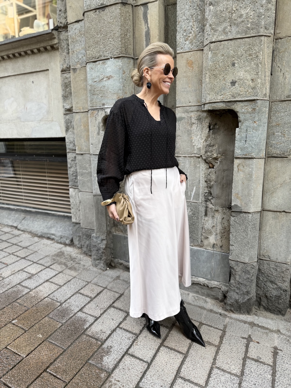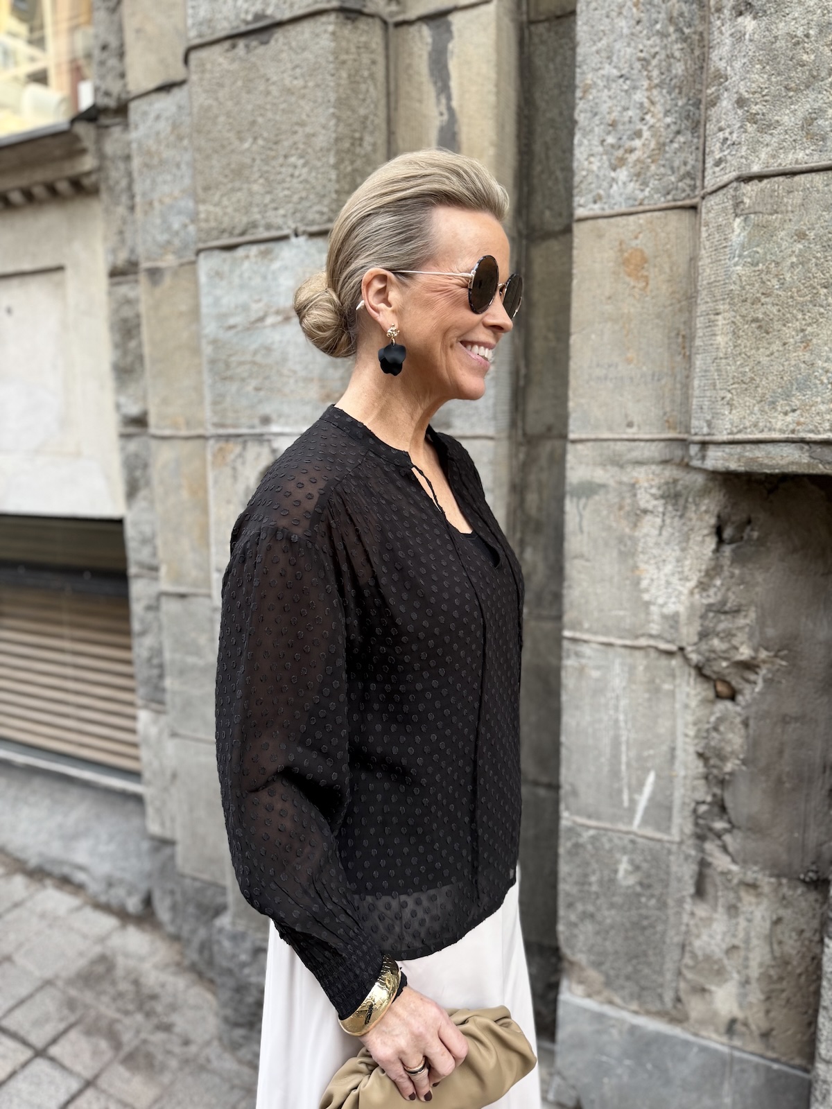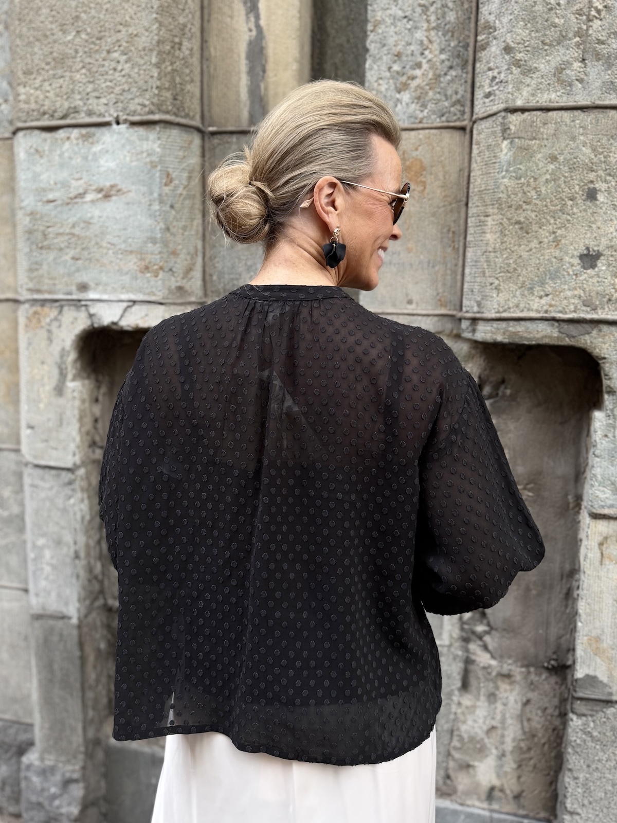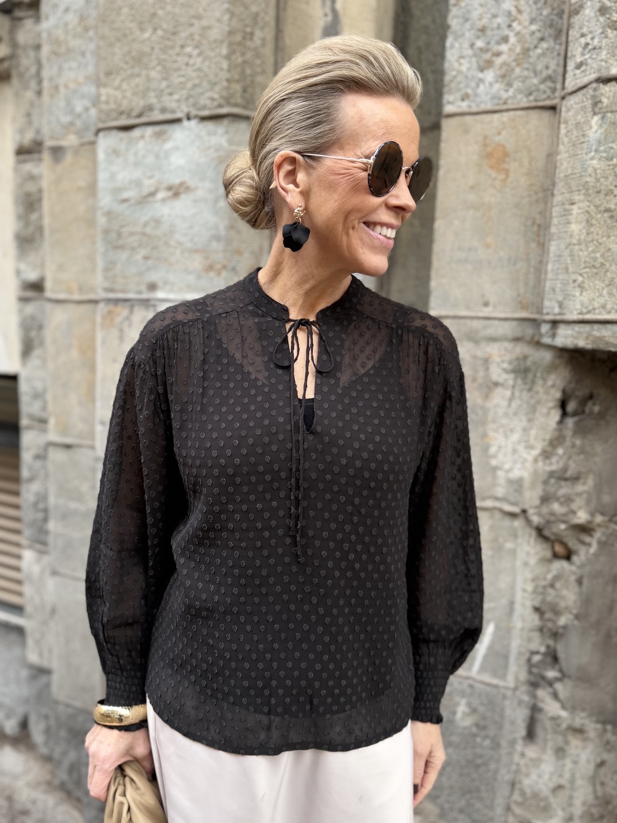 Ullis paita on kaunis viskoosipaita, joka toimii aina ja on myös ajaton tuote. Paidassa on pienenpientä kuviota pinnassa. Kaulus on O-mallinen, jossa on nauhat. Kun nauhat jättää auki, muuttuu kaulus V-malliseksi. Hihat ovat täyspitkät ja hihansuissa on kuminauharannekkeet. Malliltaan paita on suora ja se loppuu lantiolle. Katalla on paidasta päällä koko 34. Paita on reilua kokoa.