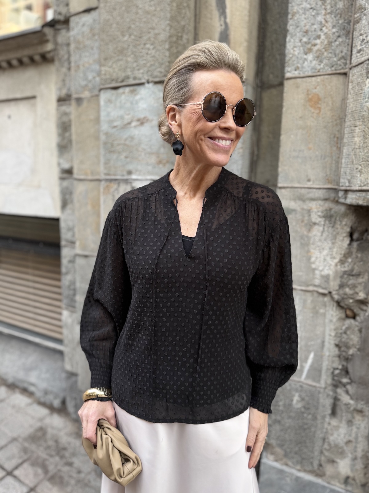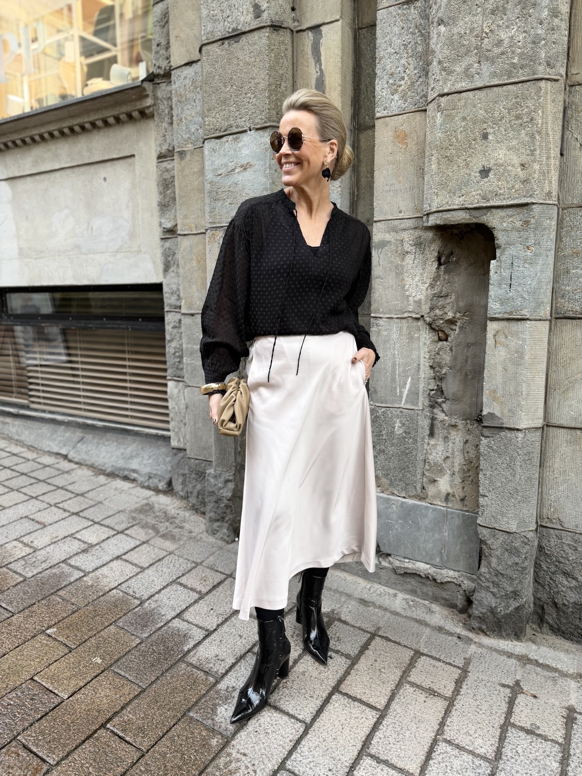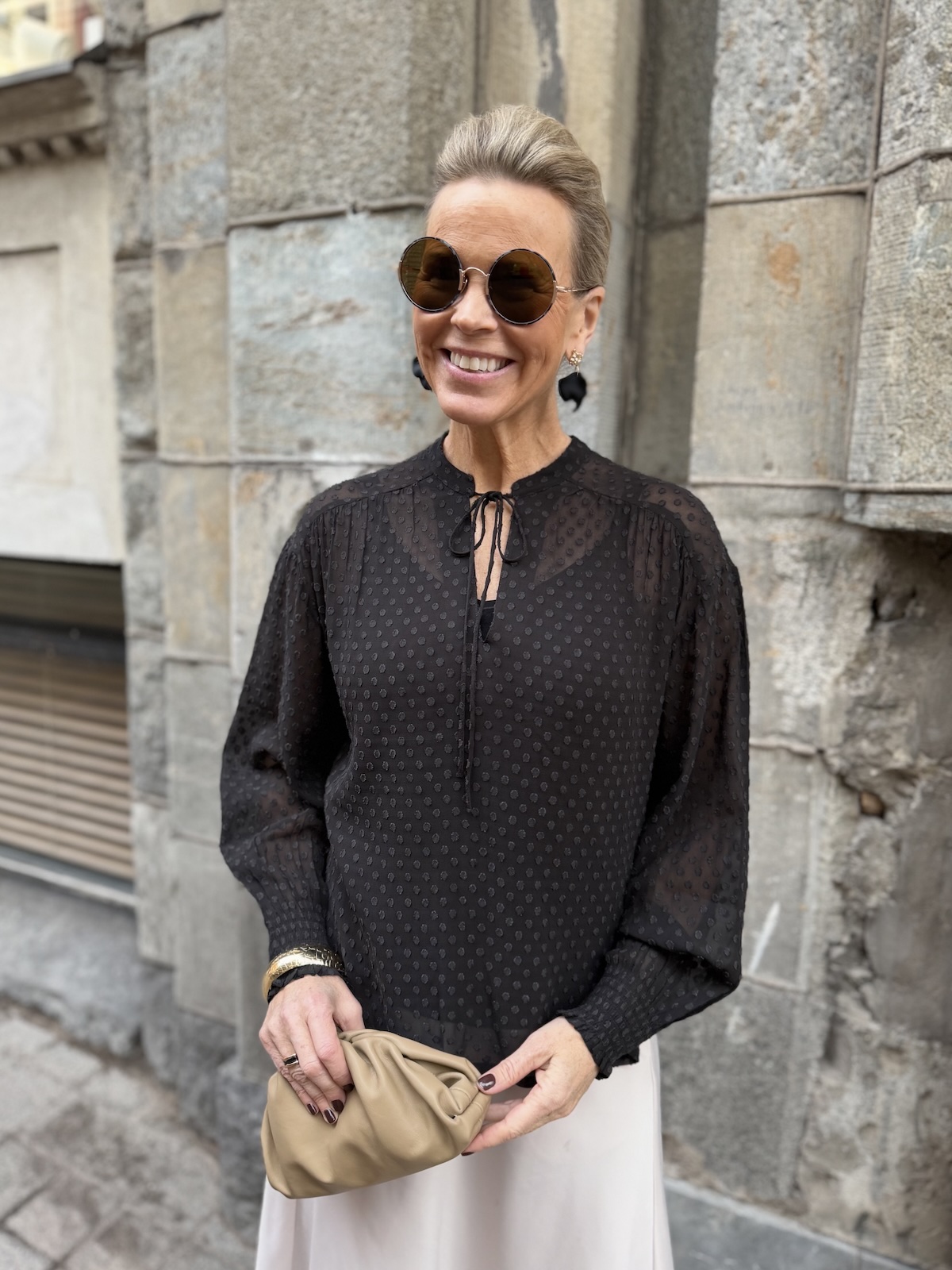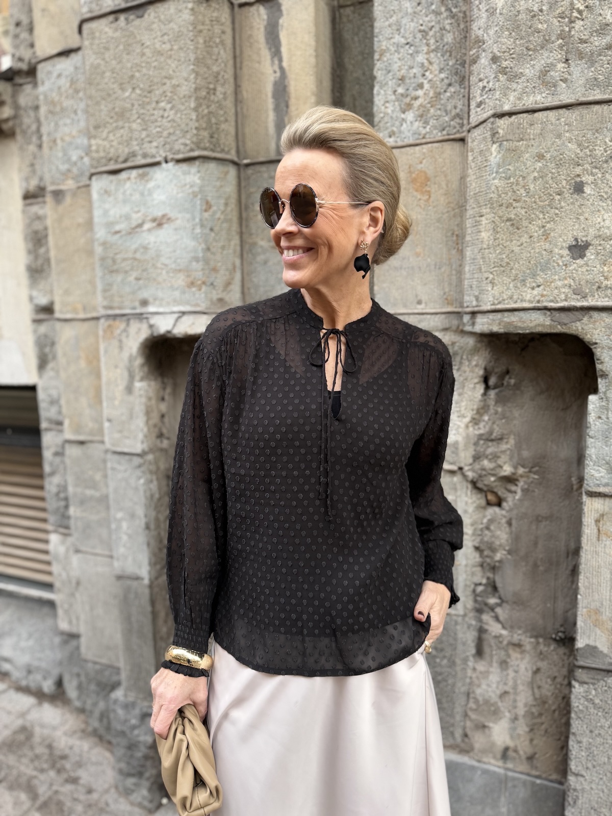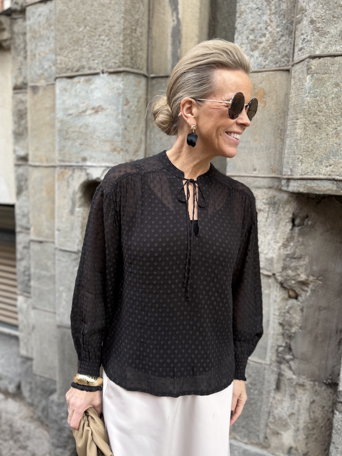 Ullis paita on kaunis viskoosipaita, joka toimii aina ja on myös ajaton tuote. Paidassa on pienenpientä kuviota pinnassa. Kaulus on O-mallinen, jossa on nauhat. Kun nauhat jättää auki, muuttuu kaulus V-malliseksi. Hihat ovat täyspitkät ja hihansuissa on kuminauharannekkeet. Malliltaan paita on suora ja se loppuu lantiolle. Katalla on paidasta päällä koko 34. Paita on reilua kokoa.
