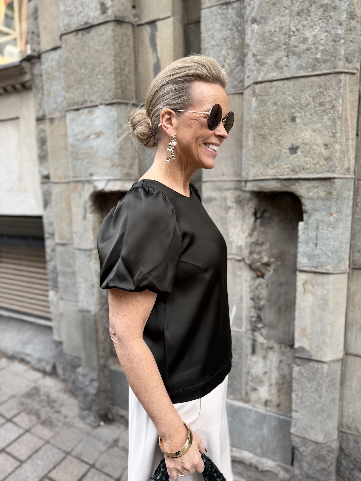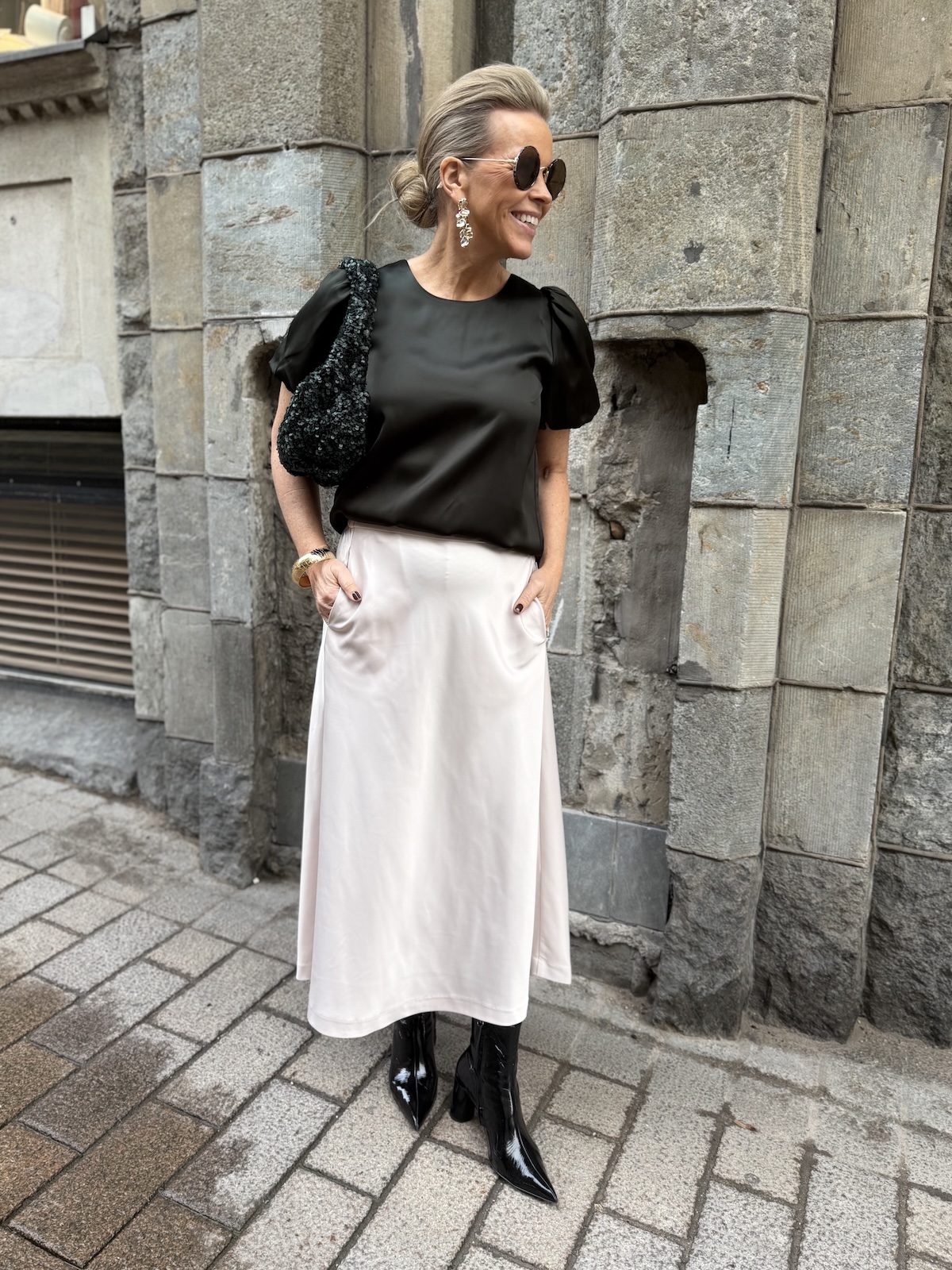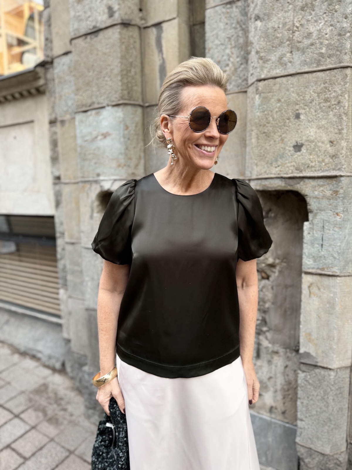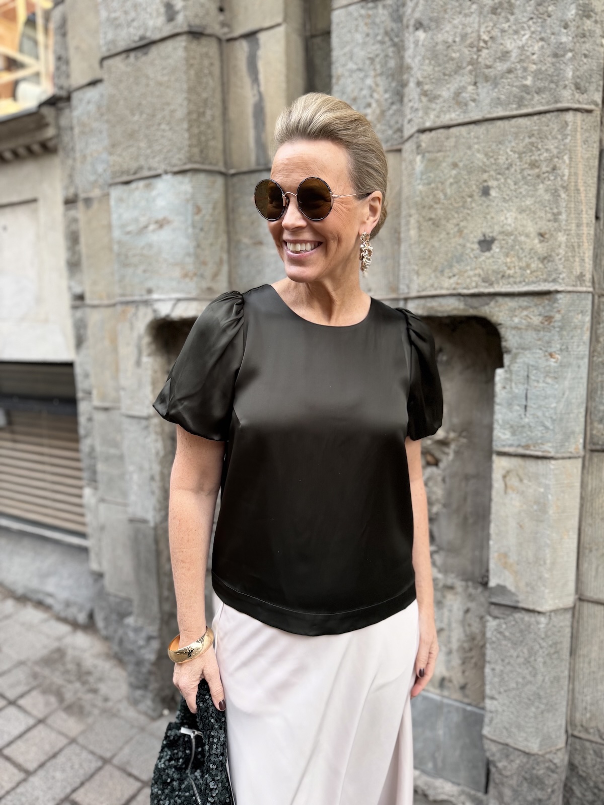 Uria satiinipaita on upea ja kaunis paita. Paidassa on O-kaula-aukko ja pissimaiset hihat, jotka ylettyvät juuri kyynerpäiden yläpuolelle. Paita on malliltaan suora ja se loppuu lantiolle. Paidan niskassa on vetoketju. Katalla on paidasta päällä koko 36.