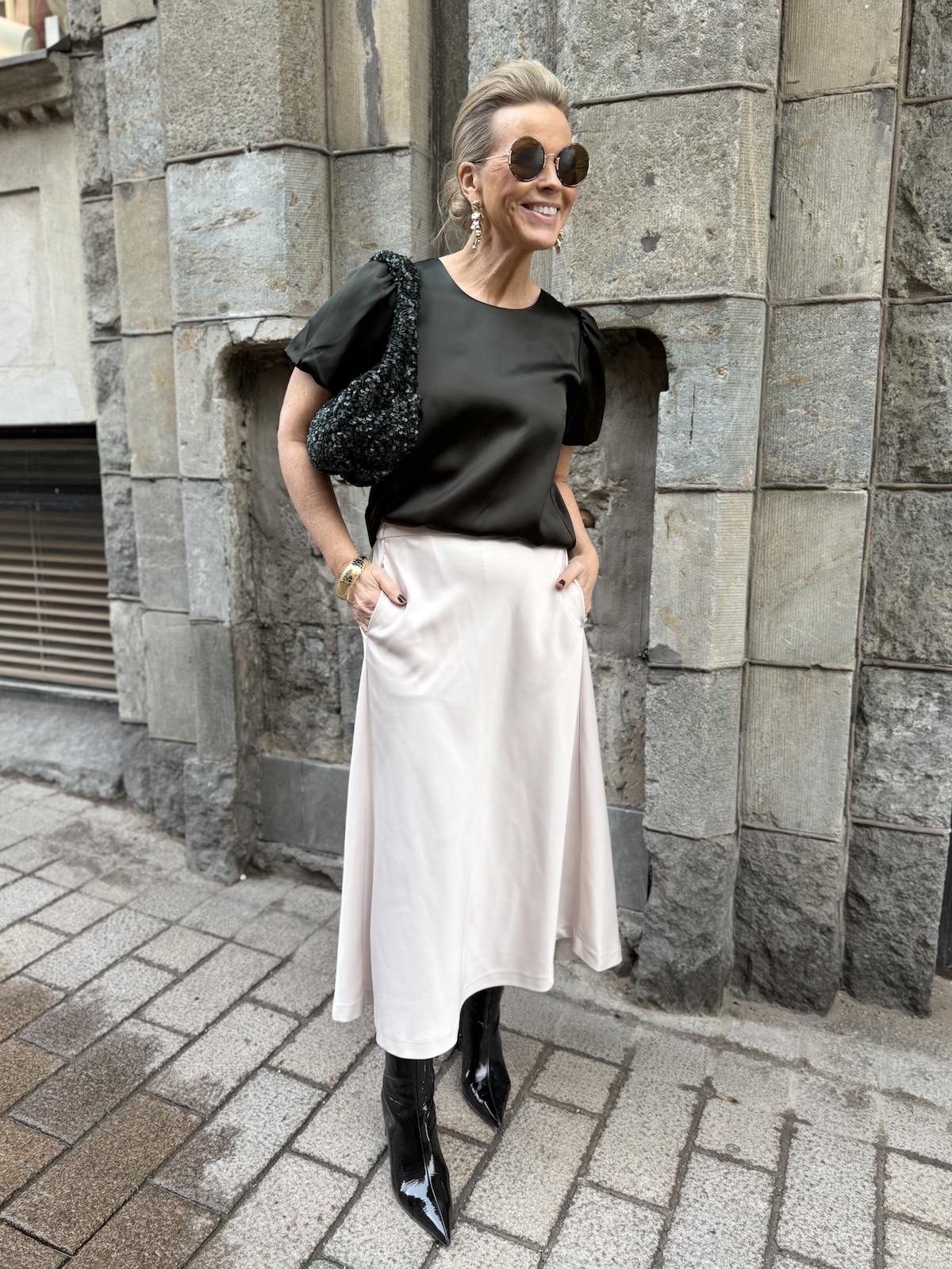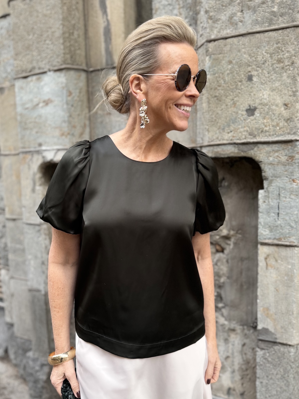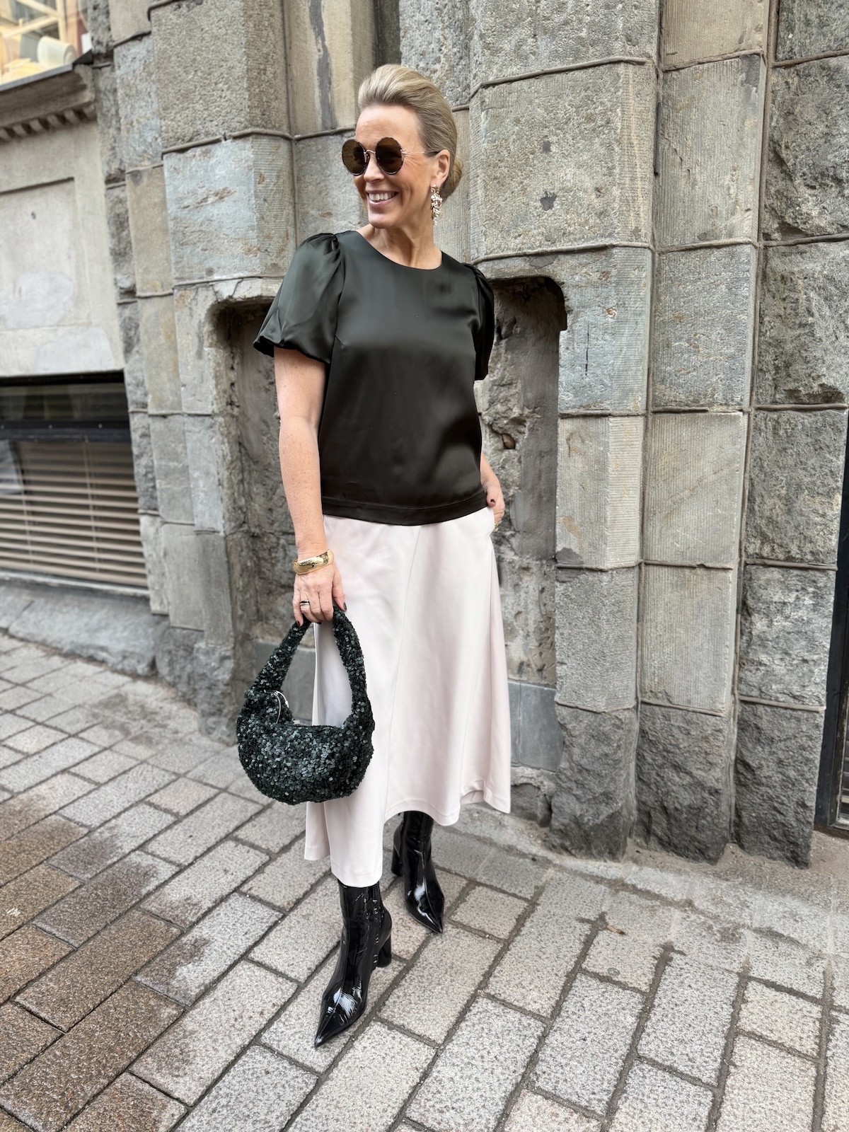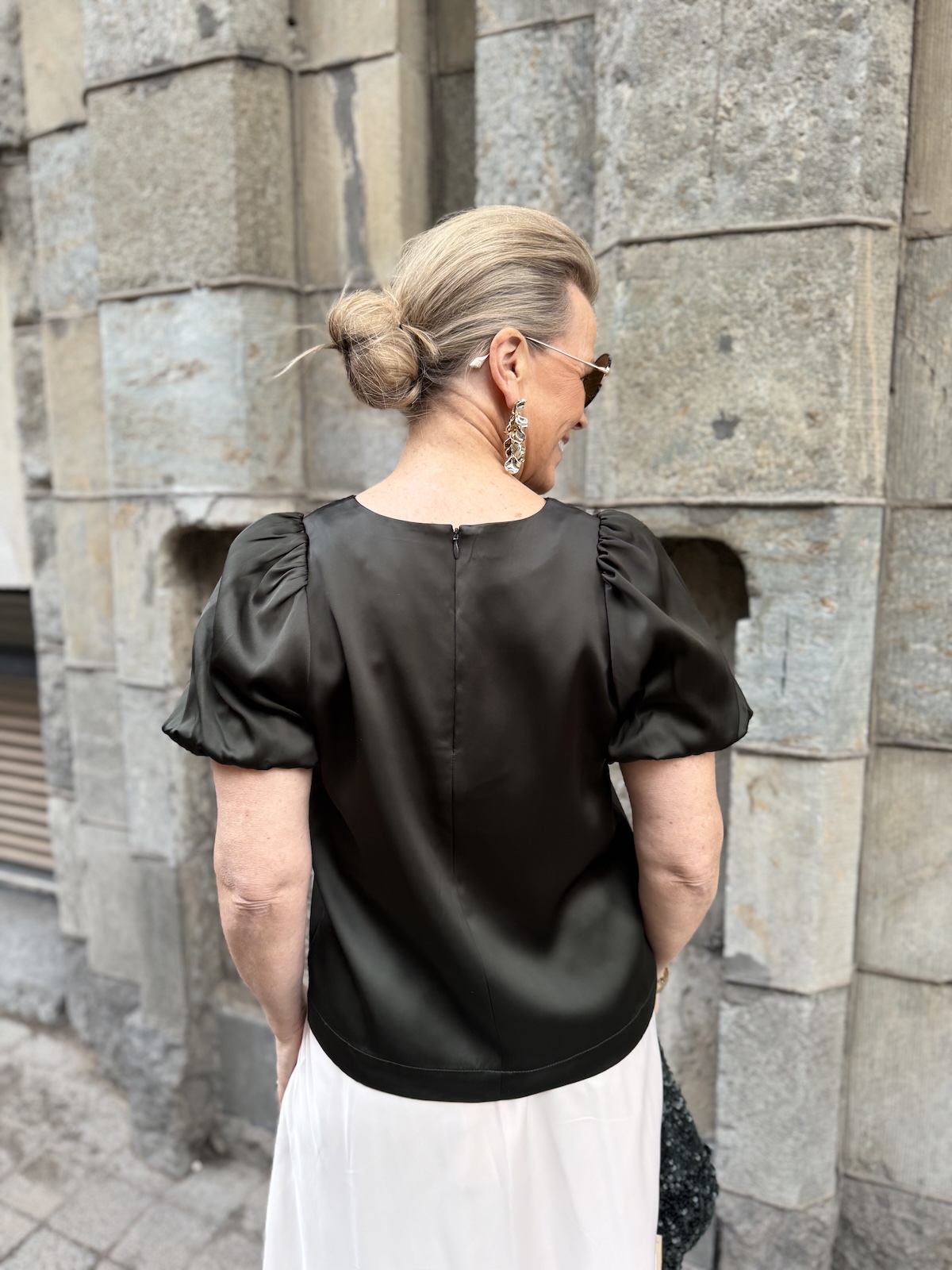 Uria satiinipaita on upea ja kaunis paita. Paidassa on O-kaula-aukko ja pissimaiset hihat, jotka ylettyvät juuri kyynerpäiden yläpuolelle. Paita on malliltaan suora ja se loppuu lantiolle. Paidan niskassa on vetoketju. Katalla on paidasta päällä koko 36.