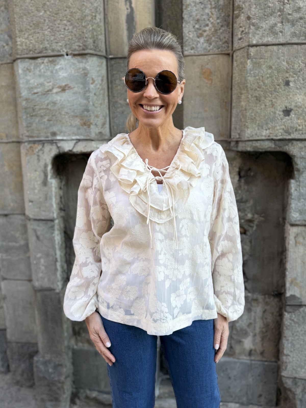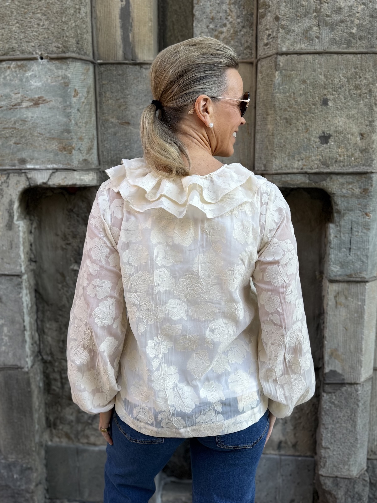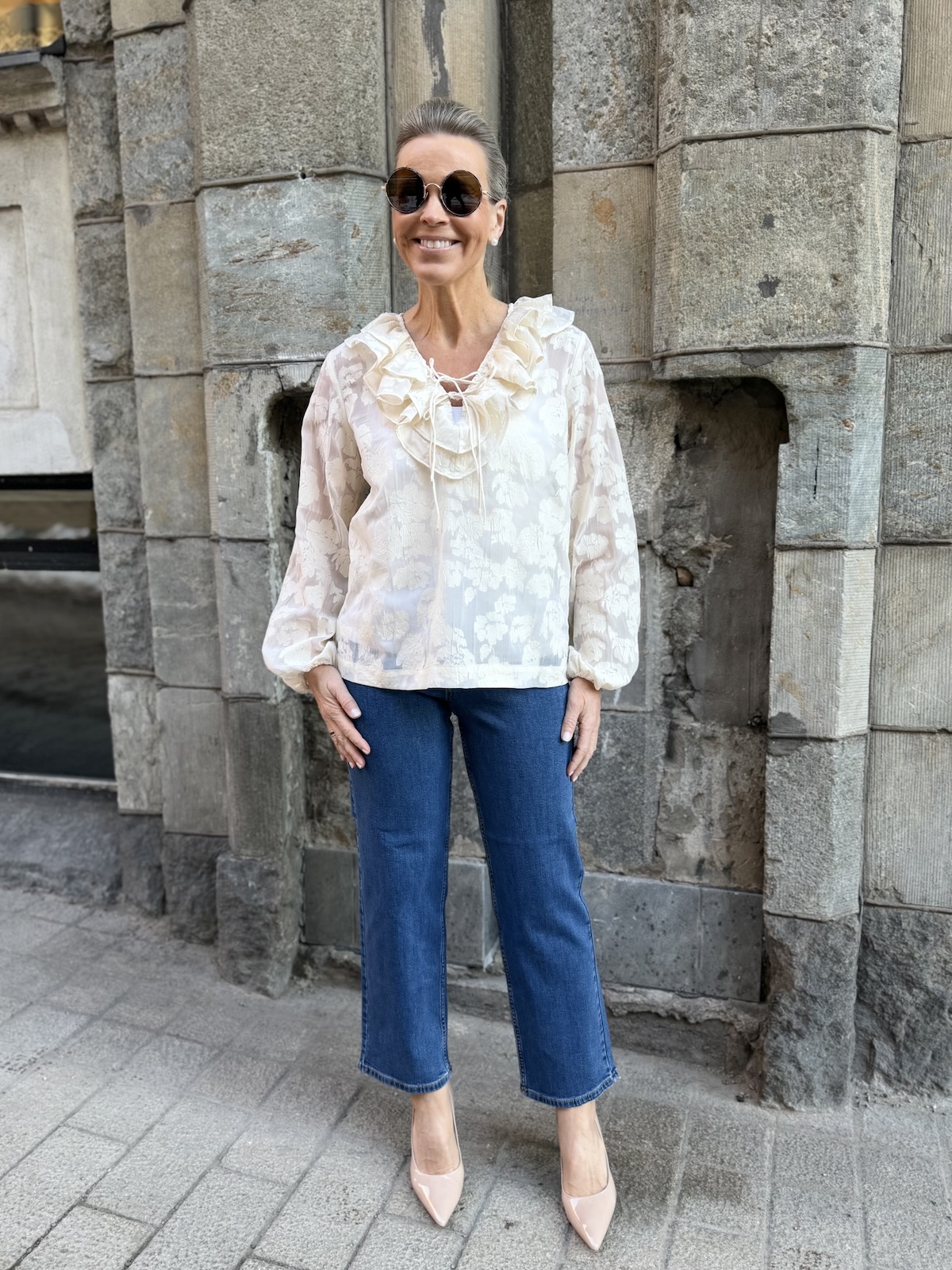 Zaira on naisellinen ja ilmava paita, jonka kaula-aukkoa kehystää kauniit fyrrykantit. Paidassa on V-kaula-aukko ja kaulua-aukossa on kaksi nauhaa. Hihat ovat täyspitkät ja hihansuissa on kuminauhat. Malliltaan paita on suora ja se loppuu lantiolle. Paidassa on kaunista sävy sävyyn olevaa kuviota. Katalla on paidasta päällä koko 34. Paidan alla on tummansininen Hydda toppi. Paita toimii myös juhlavampaan tilaisuuteen.