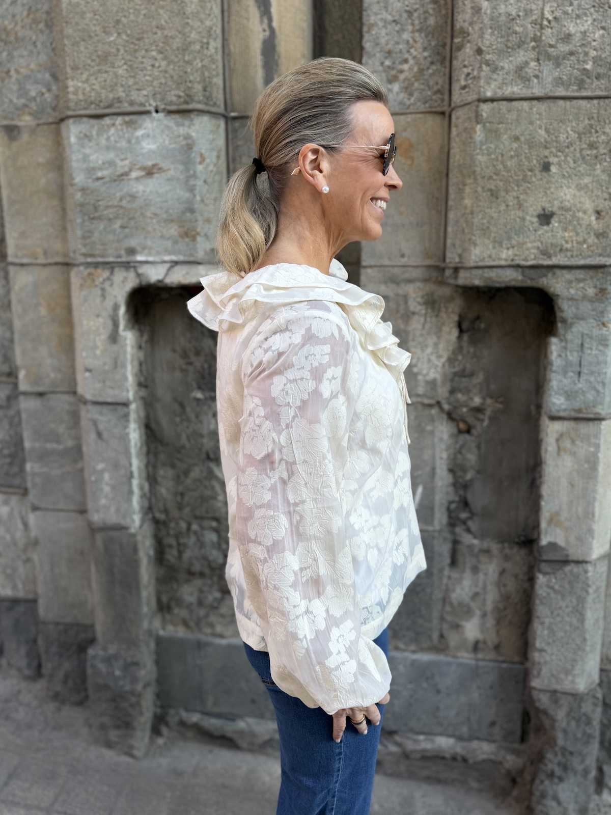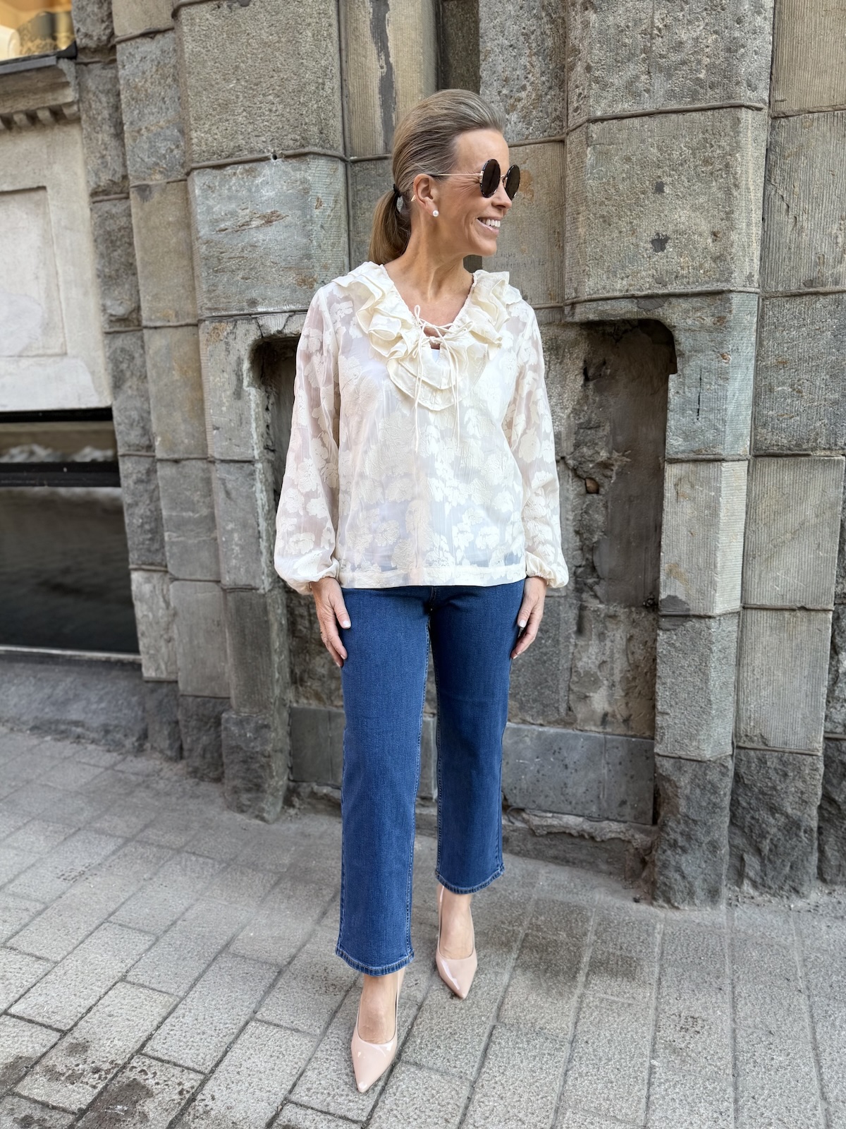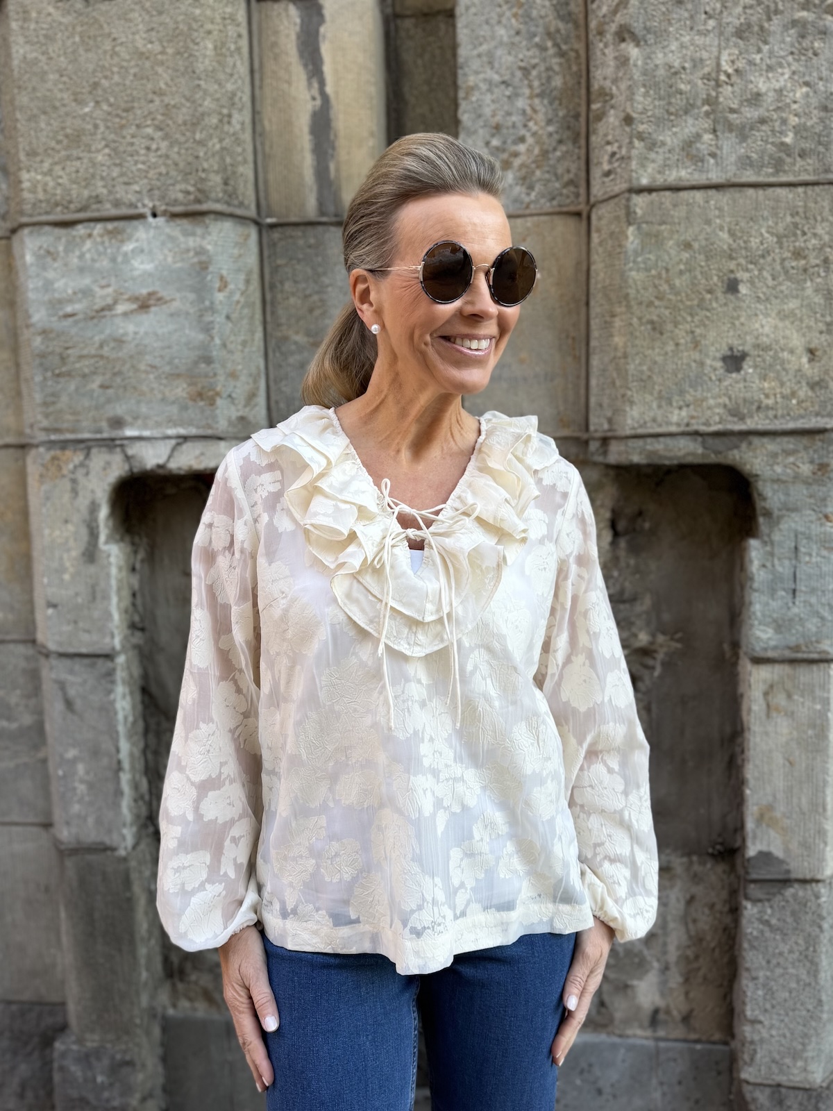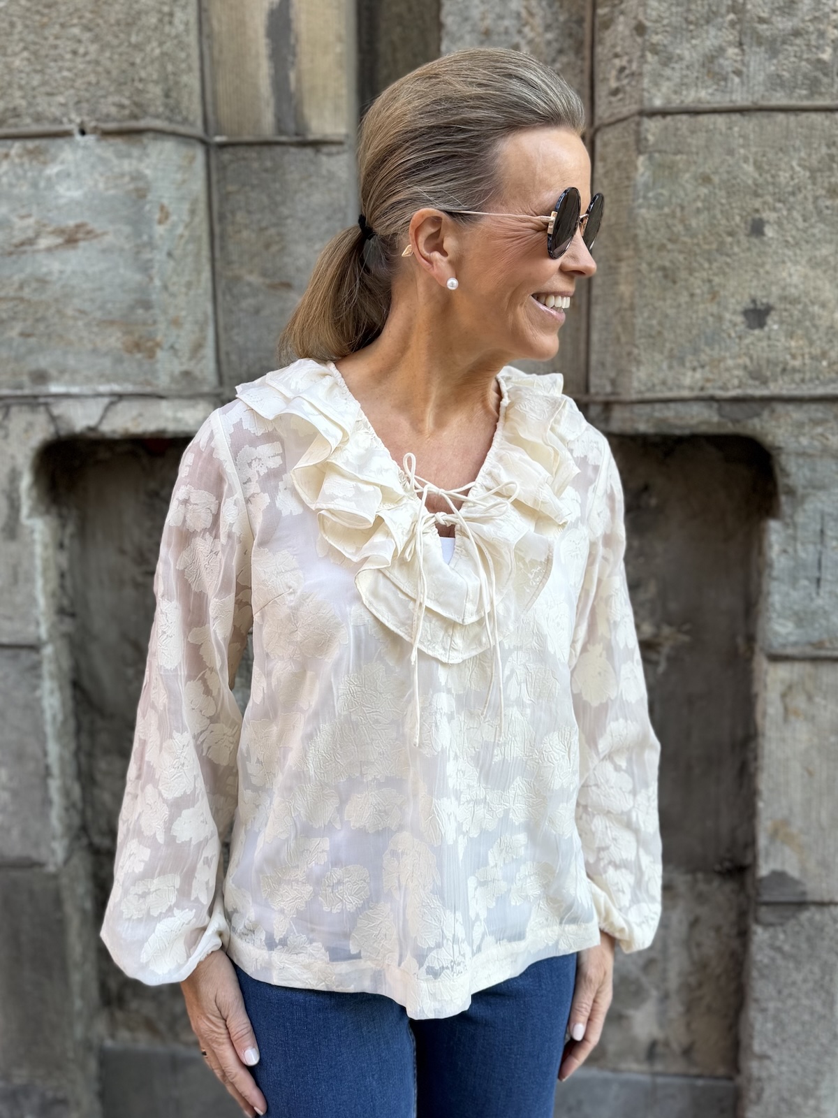 Zaira on naisellinen ja ilmava paita, jonka kaula-aukkoa kehystää kauniit fyrrykantit. Paidassa on V-kaula-aukko ja kaulua-aukossa on kaksi nauhaa. Hihat ovat täyspitkät ja hihansuissa on kuminauhat. Malliltaan paita on suora ja se loppuu lantiolle. Paidassa on kaunista sävy sävyyn olevaa kuviota. Katalla on paidasta päällä koko 34. Paidan alla on tummansininen Hydda toppi. Paita toimii myös juhlavampaan tilaisuuteen.