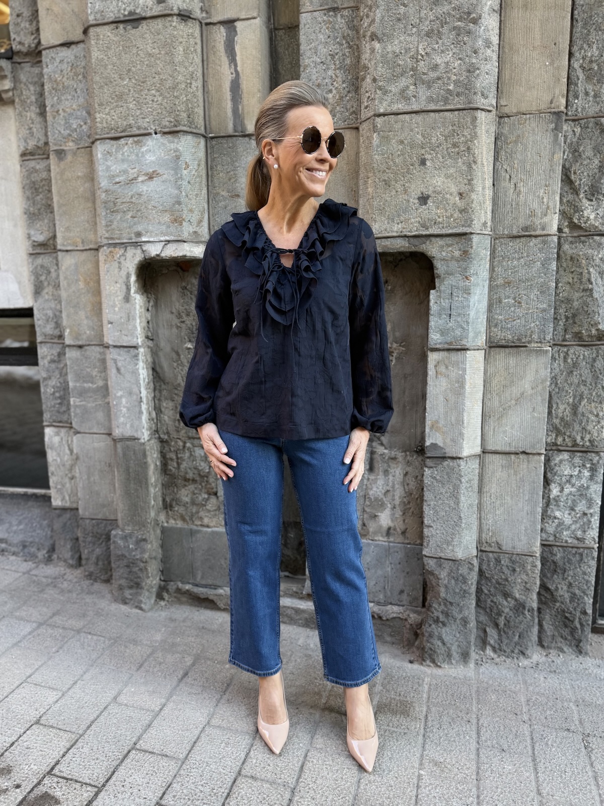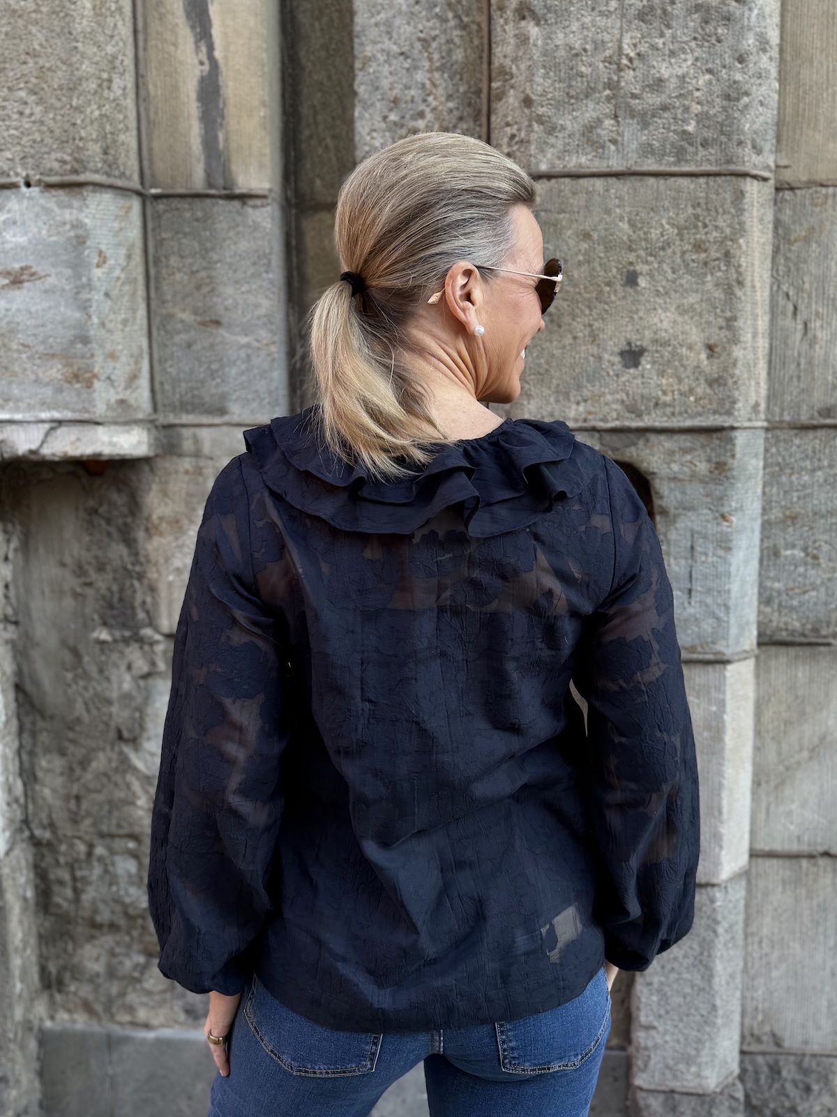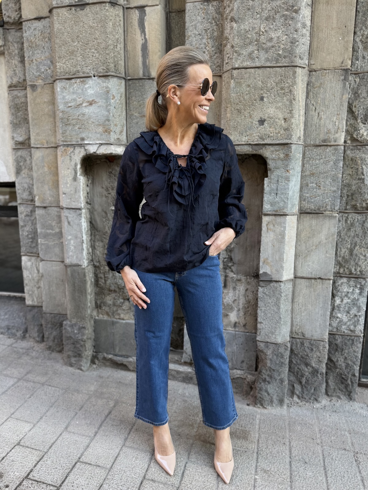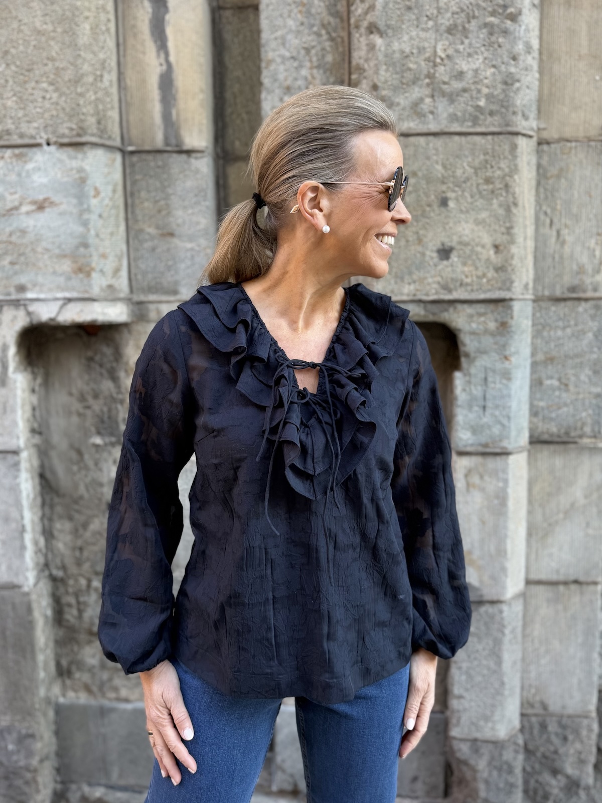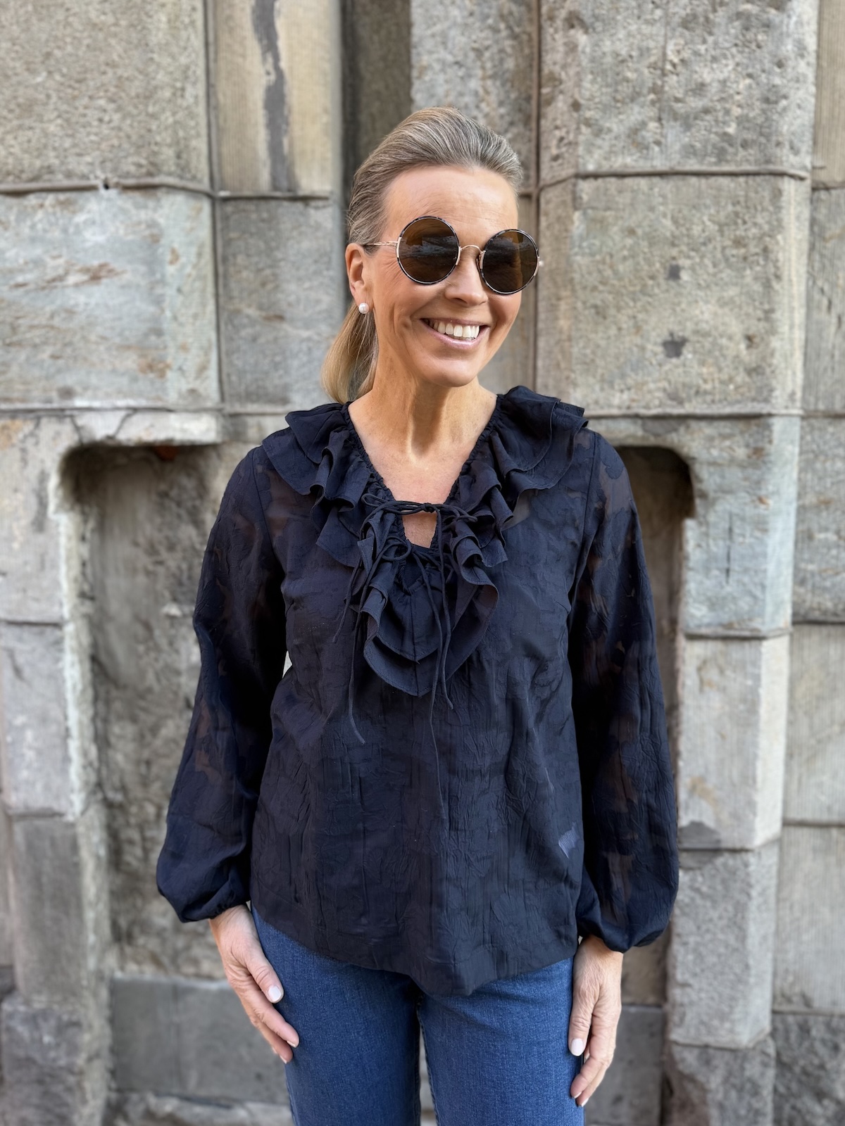Zaira on naisellinen ja ilmava paita, jonka kaula-aukkoa kehystää kauniit fyrrykantit. Paidassa on V-kaula-aukko ja kaulua-aukossa on kaksi nauhaa. Hihat ovat täyspitkät ja hihansuissa on kuminauhat. Malliltaan paita on suora ja se loppuu lantiolle. Paidassa on kaunista sävy sävyyn olevaa kuviota. Katalla on paidasta päällä koko 34. Paidan alla on tummansininen Hydda toppi. Paita toimii myös juhlavampaan tilaisuuteen.