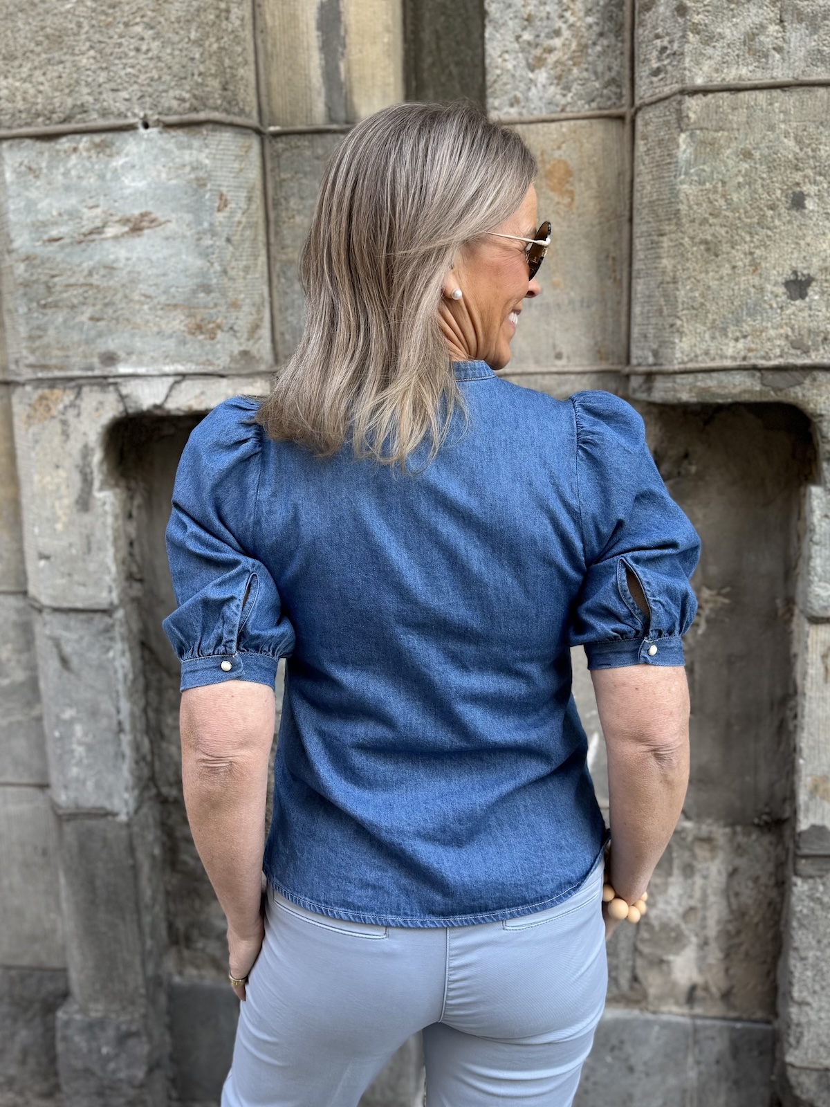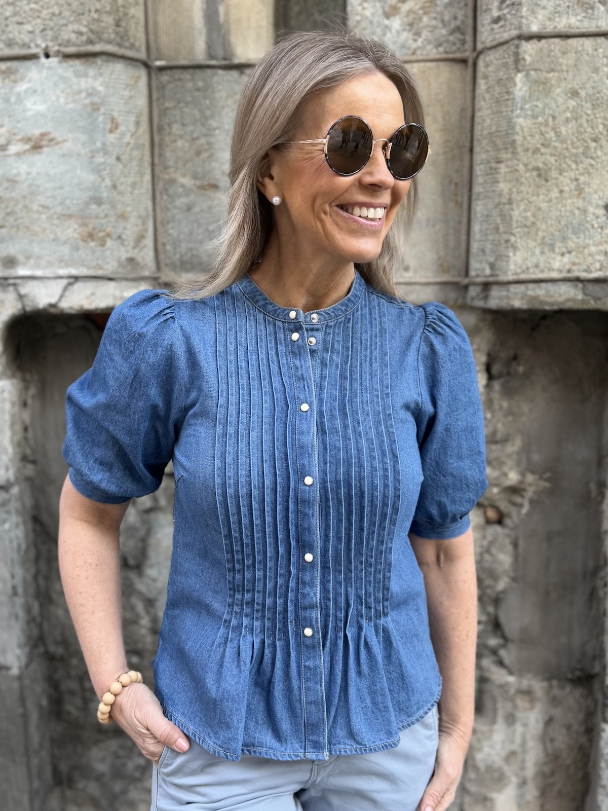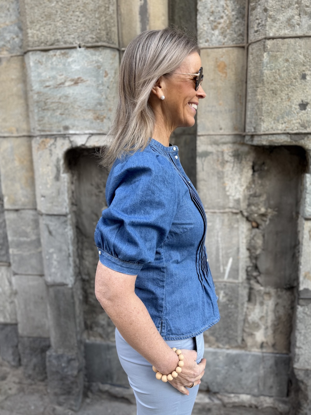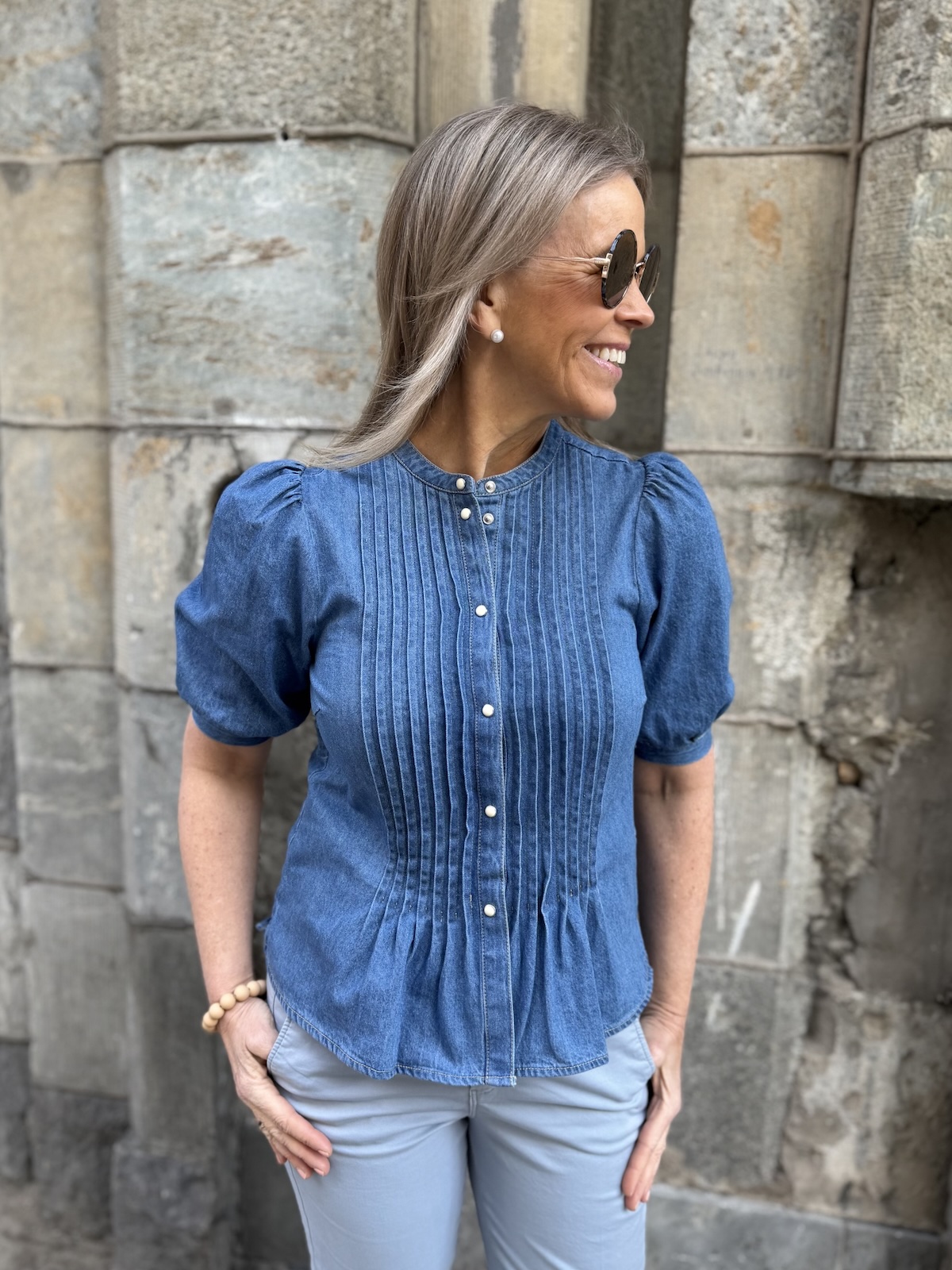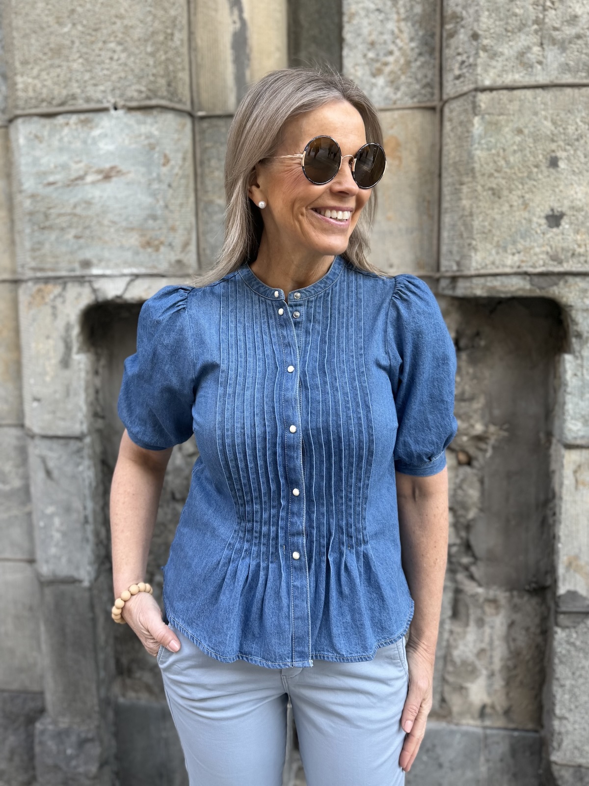 Alesia farkkupaita on super söpö. padassa on vaaleat painonapit edessä. Hihat ovat puhvimaiset ja paidan edessä on kapeita hiuslaskoksia. Malliltaan paita on suorahko kunnes helma levenee kevyesti alaspäin. Paita loppuu lantioolle. Katalla on paidasta päällä koko 34. Paita on yhden koon pienempää kokoa kuin normaalisti. Paita joustaa alla oleviin mittoihin noin 4 cm.