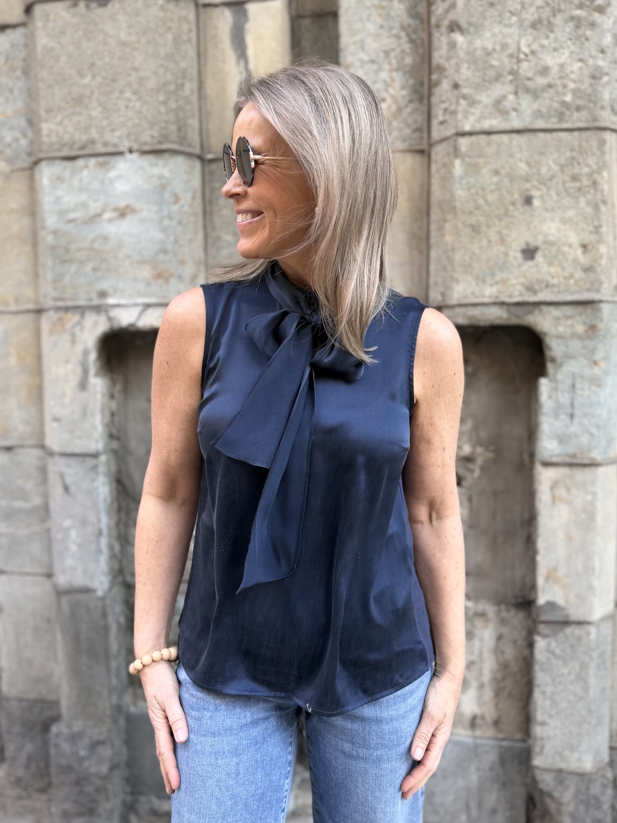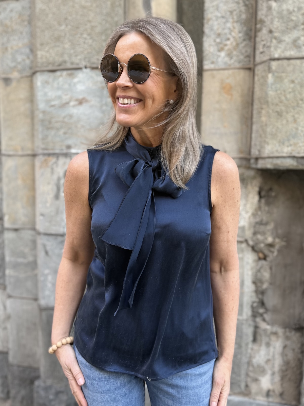 Daifa on kaunis ja ajaton paita, jossa on irroitettava nauha kauluksessa. Paidan edusta on 100% silkkiä ja selkäosa on viskoosi/elastania. Edessä on napit noin rinnan alapuolelle asti ja napit tulevat myös ylös kaulukseen. Nauhan voi sitoa eteen rusetille. Katalla on paidasta päällä koko XS.